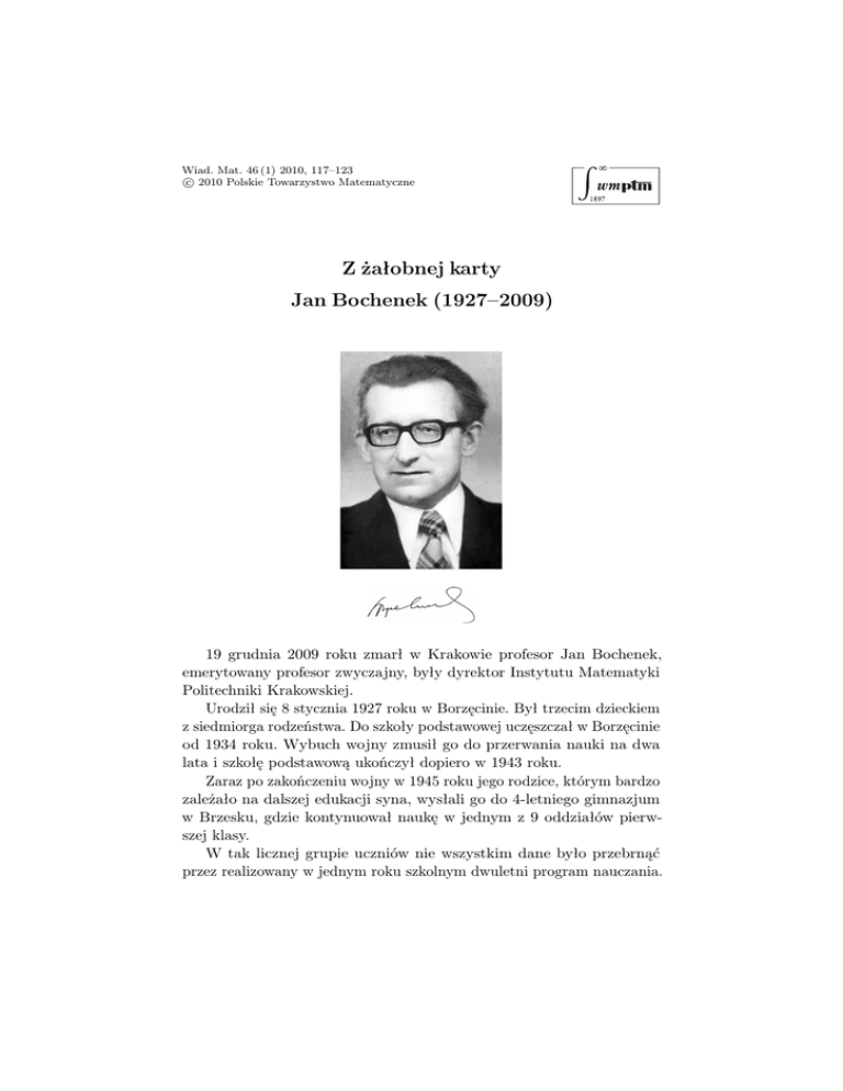 Wiad. Mat. 46 (1) 2010, 117–123 c 2010 Polskie Towarzystwo Matematyczne Z żałobnej karty Jan Bochenek (1927–2009) 19 grudnia 2009 roku zmarł w Krakowie profesor Jan Bochenek, emerytowany profesor zwyczajny, były dyrektor Instytutu Matematyki Politechniki Krakowskiej. Urodził się 8 stycznia 1927 roku w Borzęcinie. Był trzecim dzieckiem z siedmiorga rodzeństwa. Do szkoły podstawowej uczęszczał w Borzęcinie od 1934 roku. Wybuch wojny zmusił go do przerwania nauki na dwa lata i szkołę podstawową ukończył dopiero w 1943 roku. Zaraz po zakończeniu wojny w 1945 roku jego rodzice, którym bardzo zależało na dalszej edukacji syna, wysłali go do 4-letniego gimnazjum w Brzesku, gdzie kontynuował naukę w jednym z 9 oddziałów pierwszej klasy. W tak licznej grupie uczniów nie wszystkim dane było przebrnąć przez realizowany w jednym roku szkolnym dwuletni program nauczania. 118 Z żałobnej karty Utworzono więc 36-osobową grupę wybranych, zdolnych uczniów, wśród których znalazł się Jan Bochenek. W tej klasie realizowano program przedwojennego gimnazjum i liceum w dwóch grupach: humanistycznej i matematyczno-fizycznej; w tej ostatniej uczył się Bochenek. W maju 1949 roku zdał maturę, a w październiku tego samego roku rozpoczął studia matematyczne na Uniwersytecie Jagiellońskim. Na III roku studiów pierwszego stopnia, zaproponowano mu, jako jednemu z dwóch kandydatów, objęcie stanowiska młodszego asystenta w Katedrze Matematyki Politechniki Krakowskiej. 5 grudnia 1951 roku rozpoczął pracę na tym stanowisku i równocześnie kontynuował studia na Uniwersytecie Jagiellońskim, gdzie po ukończeniu drugiego ich stopnia w 1954 roku uzyskał tytuł magistra matematyki. Jego akademickimi kolegami byli znani profesorowie matematyki: Zdzisław Opial, Czesław Olech, Józef Siciak, Włodzimierz Mlak i inni, natomiast nauczycielami byli między innymi profesorowie: Franciszek Leja, Tadeusz Ważewski, Zofia Szmydt, Stanisław Łojasiewicz, Jacek Szarski. Stopień doktora uzyskał w 1962 roku na Uniwersytecie Jagiellońskim na podstawie pracy doktorskiej pt. O pewnych zagadnieniach z teorii wartości i funkcji własnych dla równań różniczkowych cząstkowych liniowych typu eliptycznego rzędu II, której promotorem był profesor Stanisław Gołąb. W tym też roku awansował na stanowisko adiunkta w Katedrze Matematyki Politechniki Krakowskiej. Jan Bochenek habilitował się na Uniwersytecie Jagiellońskim w 1969 roku, a temat pracy brzmiał: Zależność równania różniczkowego cząstkowego od wartości własnych odpowiedniego zagadnienia. Kiedy w 1970 roku nastąpiła zmiana w strukturze wyższych uczelni polegająca na likwidacji katedr i utworzeniu w ich miejsce instytutów, Jan Bochenek został pierwszym dyrektorem (powstałego z połączenia Katedry Matematyki i Katedry Geometrii Wykreślnej) Instytutu Matematyki Politechniki Krakowskiej. Pełnił tę funkcję przez dwie trzyletnie kadencje. W instytucie powołano 4 zespoły naukowe; Zespołem Metod Numerycznych kierował właśnie Bochenek. Tytuł profesora nadzwyczajnego uzyskał w maju 1977 roku, tytuł profesora zwyczajnego w 1990 roku i ponownie na kolejne dwie kadencje został dyrektorem Instytutu Matematyki Politechniki Krakowskiej. Jan Bochenek wychował wiele pokoleń inżynierów i wypromował czterech doktorów matematyki. Jan Bochenek (1927–2009) 119 Wiele lat był członkiem Polskiego Towarzystwa Matematycznego, a przez dwie kadencje pełnił funkcję wiceprezesa Oddziału Krakowskiego PTM. Był również członkiem American Mathematical Society i recenzentem Mathematical Reviews. Domeną jego badań naukowych były równania różniczkowe i analiza funkcjonalna. Z tej tematyki przez przeszło 30 lat prowadził w Instytucie Matematyki Politechniki Krakowskiej seminarium naukowe. Opublikował ponad pięćdziesiąt prac naukowych w renomowanych czasopismach matematycznych. Jest również współautorem cieszącego się dużą popularnością wśród studentów – o czym świadczy wielokrotne jego wznawianie – dwutomowego podręcznika do nauki matematyki w uczelniach technicznych. W ostatnich latach działalność naukowa Profesora dotyczyła głównie równań ewolucyjnych w przestrzeniach Banacha. Tej problematyce poświęcone są ostatnie jego prace oraz prace jego uczniów i uczestników prowadzonego przez niego seminarium. Problematyka ta w chwili obecnej leży w kręgu zainteresowań wielu światowej sławy matematyków. Całe życie zawodowe Profesora było związane z Politechniką Krakowską. Przez kilka lat oprócz pracy na Politechnice Krakowskiej prowadził wykłady monograficzne i seminarium magisterskie w Instytucie Matematyki Wyższej Szkoły Pedagogicznej w Krakowie. Profesor przeszedł na emeryturę 1 października 1997 roku, lecz nie zerwał kontaktów z uczelnią. Do 2002 roku pracował na 1/4 etatu, a w latach 2002–2007 jako wolontariusz prowadził seminarium naukowe w Instytucie Matematyki Politechniki Krakowskiej. Był również członkiem Konwentu Seniorów Politechniki Krakowskiej i Rady Muzeum tej uczelni. W czasie ponad pięćdziesięcioletniej pracy władze Politechniki Krakowskiej bardzo wysoko oceniały działalność Jana Bochenka. Otrzymał 5 nagród Ministra, 17 nagród Rektora Politechniki Krakowskiej oraz najwyższe odznaczenie uczelniane „Zasłużony dla Politechniki Krakowskiej”. Odznaczony był Krzyżem Kawalerskim Orderu Odrodzenia Polski, Złotym Krzyżem Zasługi i Medalem Komisji Edukacji Narodowej. Śmierć profesora Jana Bochenka pogrążyła pracowników Instytutu Matematyki w wielkim smutku i żałobie. Trudno wyrazić słowami wdzięczność i to wszystko, za co powinno się Profesorowi dziękować. Ciepło, dobroć, bezinteresowność i serdeczność promieniowały od Profesora i na każdym kroku byli nią otaczani pracownicy Instytutu, a w szczególności jego uczniowie, do których miałam przyjemność należeć. Nigdy nie sz