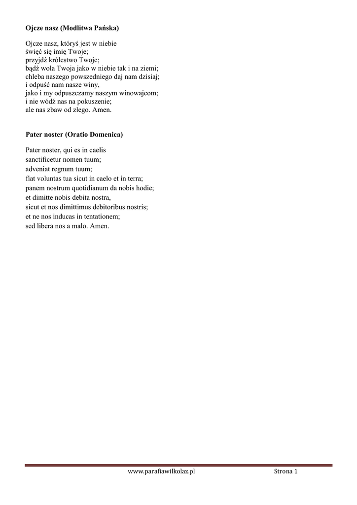 Ojcze nasz (Modlitwa Pańska) Ojcze nasz, któryś jest w niebie święć się imię Twoje; przyjdź królestwo Twoje; bądź wola Twoja jako w niebie tak i na ziemi; chleba naszego powszedniego daj nam dzisiaj; i odpuść nam nasze winy, jako i my odpuszczamy naszym winowajcom; i nie wódź nas na pokuszenie; ale nas zbaw od złego. Amen. Pater noster (Oratio Domenica) Pater noster, qui es in caelis sanctificetur nomen tuum; adveniat regnum tuum; fiat voluntas tua sicut in caelo et in terra; panem nostrum quotidianum da nobis hodie; et dimitte nobis debita nostra, sicut et nos dimittimus debitoribus nostris; et ne nos inducas in tentationem; sed libera nos a malo. Amen. www.parafiawilkolaz.pl Strona 1