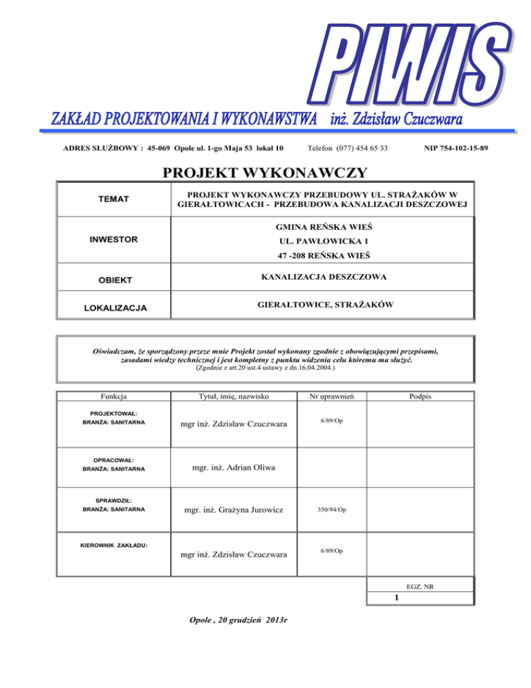 ADRES SŁUŻBOWY : 45-069 Opole ul. 1-go Maja 53 lokal 10 Telefon (077) 454 65 33 NIP 754-102-15-89 PROJEKT WYKONAWCZY TEMAT PROJEKT WYKONAWCZY PRZEBUDOWY UL. STRAŻAKÓW W GIERAŁTOWICACH - PRZEBUDOWA KANALIZACJI DESZCZOWEJ GMINA REŃSKA WIEŚ INWESTOR UL. PAWŁOWICKA 1 47 -208 REŃSKA WIEŚ OBIEKT KANALIZACJA DESZCZOWA LOKALIZACJA GIERAŁTOWICE, STRAŻAKÓW Oświadczam, że sporządzony przeze mnie Projekt został wykonany zgodnie z obowiązującymi przepisami, zasadami wiedzy technicznej i jest kompletny z punktu widzenia celu któremu ma służyć. (Zgodnie z art.20 ust.4 ustawy z dn.16.04.2004.) Funkcja Tytuł, imię, nazwisko Nr uprawnień mgr inż. Zdzisław Czuczwara 6/89/Op Podpis PROJEKTOWAŁ: BRANŻA: SANITARNA OPRACOWAŁ: BRANŻA: SANITARNA mgr. inż. Adrian Oliwa SPRAWDZIŁ: BRANŻA: SANITARNA mgr. inż. Grażyna Jurowicz 350/94/Op mgr inż. Zdzisław Czuczwara 6/89/Op KIEROWNIK ZAKŁADU: EGZ. NR 1 Opole , 20 grudzień 2013r ZAWARTOŚĆ PROJEKTU I CZĘŚĆ OPISOWA. 1. PODSTAWA OPRACOWANIA. 2. ZAKRES OPRACOWANIA 3. PRZEDMIOT I ROZMIAR INWESTYCJI. 4. KANALIZACJA DESZCZOWA. 5. WYTYCZNE REALIZACJI. 6. SKRZYŻOWANIE RUROCIĄGU Z UZBROJENIEM PODZIEMNYM 7. GOSPODARKA ODPADAMI 8. UWAGI KOŃCOWE II. CZĘŚĆ GRAFICZNA. 1. Plan sytuacyjny w skali 1:500 2. Profil podłużny w skali 1:100/500 2 OPIS TECHNICZNY do projektu wykonawczego przebudowy istniejącej kanalizacji deszczowej w ramach projektu przebudowy ul. Strażaków w Gierałtowicach, gmina Reńska Wieś 1. PODSTAWA OPRACOWANIA - Zlecenie inwestora - Plan sytuacyjny, - Projekt drogowy, - Wizja lokalna, - Obowiązujące przepisy i normy. 2. ZAKRES OPRACOWANIA Przedmiotem opracowania jest projekt przebudowy istniejącej kanalizacji deszczowej w ramach projektu przebudowy ul., gmina Reńska Wieś. 3. PRZEDMIOT I ROZMIAR INWESTYCJI Przedmiotem inwestycji jest projekt budowy kanalizacji deszczowej oraz przebudowy istniejącej kanalizacji deszczowej w pasie przebudowywanej drogi gminnej ul. Strażaków w Gierałtowicach, gmina Reńska Wieś Zakres projektowanej inwestycji obejmuje: Demontaż i wymianę istniejących kanałów na projektowane kanały z rur: Kanalizacja deszczowa z rur PP kl. Sn8 Ø1000 L = 416,5 m Kanalizacja deszczowa z rur PP kl. Sn8 Ø630 L = 34,5 m Kanalizacja deszczowa z rur PP kl. Sn8 Ø400 L = 138,0 m Kanalizacja deszczowa z rur PP kl. Sn8 Ø315 L = 33,0 m Przykanaliki kanalizacyjne z rur PP, Ø 250, SN8 szt. – 6 , L = 16,0m Przykanaliki kanalizacyjne z rur PP, Ø 200, SN8 szt. – 26 , L = 106,5m Studzienki rewizyjne betonowe Ø 2000 mm Studzienki rewizyjne betonowe Ø 1500 mm Studzienki rewizyjne betonowe Ø 1000 mm Wpust ściekowy typu ulicznego Ø 500 mm Wpust ściekowy typu półchodnikowego Ø 500 mm szt. – 1 szt. – 10 szt. – 11 szt. – 8 szt. – 24 4. KANALIZACJA DESZCZOWA W związku z przebudową drogi gminnej ulicy Strażaków w miejscowości Gierałtowice projektuje się przebudowę istniejącej kanalizacji deszczowej poprzez wymianę istniejących przewodów na projektowane przewody z rur Ø315, Ø400, Ø630mmPP kl. SN8 np. typ Pragma prod. Pipelife, i Ø1000mm PP kl SN8 np.: typ PragmaID prod. Pipelife. Zaprojektowano również wymianę istniejących przykanalików na projektowane przykanaliki z rur Ø200mm i Ø250mm PP SN8 oraz wymianę istniejących wpustów ulicznych na projektowane wpusty typu ulicznego i półchodnikowego. Istniejące odcinki kanalizacji deszczowej ze względu na ich zły stan techniczny należy zdemontować, a w ich miejscu ułożyć projektowane przewody kanalizacji deszczowej z rur PP Ø400mm, Ø630 i Ø1000mm. Przed przystąpieniem do robót budowlanych należy bezwzględnie wykonać odkrywkę istniejących kanałów w celu weryfikacji ich średnic i rzędnych posadowienia. Ponadto należy wykonać odkrywkę istniejącego uzbrojenia w miejscach skrzyżowań z kanalizacją deszczową. Na odcinku przebudowywanej kanalizacji deszczowej zaprojektowano studzienki rewizyjne z kręgów betonowych Ø1000mm, Ø1500 i Ø2000mm. 3 Przebudowywaną kanalizację deszczową należy połączyć z istniejącą kanalizacją deszczową poprzez projektowane studzienki rewizyjne D1, D11, D13 i D15. Boczne odgałęzienie kanalizacji deszczowej Ø630 od studzienki D1 należy połączyć z istniejącą kanalizacją deszczową z rur betonowych Dn600 przy użyciu kształtki połączeniowej rura PP/rura betonowa Dn600. Przebudowywana droga gminna – ul. Strażaków odwadniana będzie poprzez wpusty deszczowe typu ulicznego i półchodnikowego Ø500mm z osadnikiem, które należy połączyć z przebudowywaną kanalizacją deszczową poprzez przykanaliki z rur Ø200 PP i Ø250PP kl. SN8. Przykanaliki Ø200mm i Ø250mm należy połączyć z przebudowywaną kanalizacją deszczową poprzez włączenie do projektowanych studzienek rewizyjnych. Wpust Wp 21 projektuje się połączyć przykanalikiem Ø200PP z projektowanym przewodem Ø630mmPP poprzez trójnik redukcyjny Ø630/200mm. W projektowanych wpustach ulicznych należy zamontować kosze wychwytujące duże zanieczyszczenia stałe np.: liście, gałęzie itp. Trasy, średnice i spadki kanałów pokazano na planszy zbiorczej uzbrojenia w skali 1:500 zawartej w części drogowej opracowania oraz profilu podłużnym w części graficznej opracowania. 4.1 Studzienki kanalizacyjne. Uzbrojeniem sieci są studzienki kanalizacyjne rewizyjne Ø1000, Ø1500 i Ø2000 mm typu P.V. wykonane z prefabrykowanych elementów betonowych z betonu klasy C35/45,wodoszczelnego, łączonych na uszczelki. Na studniach Ø1500mm i Ø2000mm należy ułożyć płyty redukcyjne Ø1500/1000mm i Ø2000/1000mm. Powyżej płyty redukcyjnej należy zamontować kręgi betonowe Ø1000mm i płytę pokrywową Ø1000mm. Rzędne kinet studzienek dostosować do rzędnych podanych na profilu podłużnym w części graficznej opracowania. Elementy studzienki kanalizacyjnejØ1000: - dno studni d = 1000 h = zmienne mm - płyta pokrywowa 1000/625, h = 200 mm, 130mm - właz żeliwny klasy