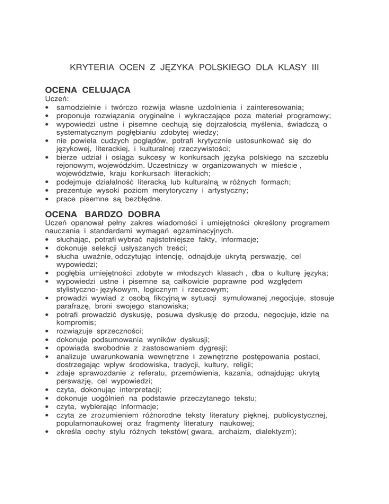KRYTERIA OCEN Z J ZYKA POLSKIEGO DLA KLASY III OCENA CELUJ CA Ucze : • samodzielnie i twórczo rozwija własne uzdolnienia i zainteresowania; • proponuje rozwi zania oryginalne i wykraczaj ce poza materiał programowy; • wypowiedzi ustne i pisemne cechuj si dojrzało ci my lenia, wiadcz o systematycznym pogł bianiu zdobytej wiedzy; • nie powiela cudzych pogl dów, potrafi krytycznie ustosunkowa si do j zykowej, literackiej, i kulturalnej rzeczywisto ci; • bierze udział i osi ga sukcesy w konkursach j zyka polskiego na szczeblu rejonowym, wojewódzkim. Uczestniczy w organizowanych w mie cie , województwie, kraju konkursach literackich; • podejmuje działalno literack lub kulturaln w ró nych formach; • prezentuje wysoki poziom merytoryczny i artystyczny; • prace pisemne s bezbł dne. OCENA BARDZO DOBRA Ucze opanował pełny zakres wiadomo ci i umiej tno ci okre lony programem nauczania i standardami wymaga egzaminacyjnych. • słuchaj c, potrafi wybra najistotniejsze fakty, informacje; • dokonuje selekcji usłyszanych tre ci; • słucha uwa nie, odczytuj c intencj , odnajduje ukryt perswazj , cel wypowiedzi; • pogł bia umiej tno ci zdobyte w młodszych klasach , dba o kultur j zyka; • wypowiedzi ustne i pisemne s całkowicie poprawne pod wzgl dem stylistyczno- j zykowym, logicznym i rzeczowym; • prowadzi wywiad z osob fikcyjn w sytuacji symulowanej ,negocjuje, stosuje parafraz , broni swojego stanowiska; • potrafi prowadzi dyskusj , posuwa dyskusj do przodu, negocjuje, idzie na kompromis; • rozwi zuje sprzeczno ci; • dokonuje podsumowania wyników dyskusji; • opowiada swobodnie z zastosowaniem dygresji; • analizuje uwarunkowania wewn trzne i zewn trzne post powania postaci, dostrzegaj c wpływ rodowiska, tradycji, kultury, religii; • zdaje sprawozdanie z referatu, przemówienia, kazania, odnajduj c ukryt perswazj , cel wypowiedzi; • czyta, dokonuj c interpretacji; • dokonuje uogólnie na podstawie przeczytanego tekstu; • czyta, wybieraj c informacje; • czyta ze zrozumieniem ró norodne teksty literatury pi knej, publicystycznej, popularnonaukowej oraz fragmenty literatury naukowej; • okre la cechy stylu ró nych tekstów( gwara, archaizm, dialektyzm); • • • • • • • • • • • • • • • • • • • • • • • • • • • ma wiadomo wieloznaczno ci wypowiedzi literackiej; rozpoznaje i nazywa warto ci, postawy moralne i przenosi je do własnego wiata warto ci; rozstrzyga dylematy moralne i potrafi umiej tnie dokona wyboru; posługuje si w sposób naturalny i funkcjonalny poznanymi poj ciami i terminami z zakresu literatury i kultury; potrafi samodzielnie zanalizowa i zinterpretowa utwory liryczne, epickie i dramatyczne przewidziane programem nauczania; rozpoznaje rodzaje i gatunki literackie oraz ich cechy gatunkowe; posiada bardzo dobr znajomo utworów literackich przewidzianych w programie nauczania; analizuje komunikaty medialne, odczytuje znaki i kody dosłowne i metaforyczne; poprawnie posługuje si terminologi medialn ; wykorzystuje media jako ródła informacji i opinii w samodzielnym dochodzeniu do wiedzy; wyja nia etyczne i moralne aspekty programów informacyjnych i publicystycznych; rozpoznaje znaczenia metaforyczne dzieł plastycznych; wiadomie i krytycznie odbiera ró ne rodzaje utworów muzycznych; ocenia wiarygodno i poprawno j zykow ró norodnych czasopism; samodzielnie korzysta z wydawnictw encyklopedycznych, dzieł naukowych i popularnonaukowych; tworzy ró norodne instrukcje i wykorzystuje je do samodzielnej pracy; w sloganach reklamowych dostrzega elementy tradycji literackiej i kulturowej, ocenia ich przydatno i sposób wykorzystania; umie korzysta ze rodków przekazu i obroni si przed ich manipulacyjnym działaniem; poprawnie redaguje wypowiedzi pisemne przewidziane programem nauczania i standardami wymaga egzaminacyjnych; prace pisemne wiadcz o znajomo ci problematyki , kompozycji, znajomo ci reguł gramatycznych i interpunkcyjnych; formułuje wypowiedzi zawieraj ce własne s dy i przemy lenia dotycz ce ró nych tekstów; przekształca ró norodne konstrukcje składniowe w zale no ci od potrzeb komunikacyjnych i stylistycznych; poprawnie rozpoznaje wypowiedzenia wielokrotnie zło one; samodzielnie omawia ich budow ; poprawnie dokonuje analizy składniowej; wyja nia, czym charakteryzuje si mowa zale na i niezale na; wyodr bnia w tek cie mow niezale n , wyja nia jej funkcje stylistyczne ; celowo, poprawnie przekształca wypowiedzi w mowie niezale nej i zale nej; wyja nia istot neologizmów , ocenia je, uzasadniaj c swe zdanie; wyja nia istot zwi zków frazeologicznych, poprawnie je klasyfikuje i wyja nia rodowód; wyja nia, czym s nazwy własne i ich cech swoiste; wyja nia rodowód rozmaitych imion i nazwisk; • • • • • poprawnie odmienia nazwiska; wyja nia, jak nale y tworzy nazwiska e skie i nazwy par mał e skich; poprawnie pisze przymiotniki utworzone od nazw osobowych; wyja nia, o czym informuj nazwy miejscowo ci; wyja nia jak u ywa nazw miejscowych; poprawnie pisze przymiotniki utworzone od nazw miejscowych; OCENA DOBRA Ucze opanował wiadomo ci i umiej tno ci przewidziane podstaw programow oraz elementy wybrane z programu nauczania oraz standardów wymaga egzaminacyjnych. • uwa nie słucha, wybieraj c wa ne fakty, informacje; • potrafi dokona selekcji usłyszanych tre ci; • dba o kultur j zyka; • wypowiedzi ustne i pisemne s poprawne pod wzgl dem stylistyczno j zykowym, logicznym i rzeczowym; • potrafi poprawi wi kszo swoich bł dów j zykowych i stylistycznych; • osi ga spójno wypowiedzi poprzez parafraz tekstu, a tak e stosowanie wyrazów spajaj cych; • dyskutuje, negocjuje, idzie na kompromis; • opowiada swobodnie; • samodzielnie charakteryzuje bohaterów, na podstawie zgromadzonych faktów i opinii; • zdaje sprawozdanie z referatu, przemówienia, kazania; • rozumie czytany tekst; • czyta, staraj c si dokona interpretacji; • charakteryzu