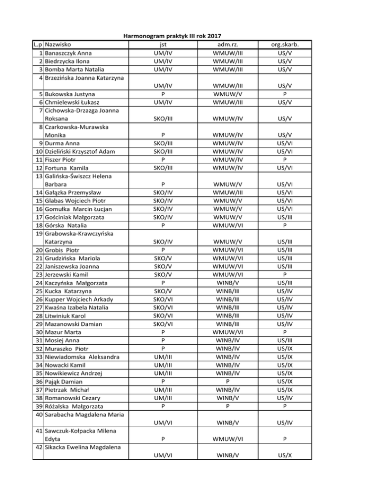 L.p 1 2 3 4 5 6 7 8 9 10 11 12 13 14 15 16 17 18 19 20 21 22 23 24 25 26 27 28 29 30 31 32 33 34 35 36 37 38 39 40 41 42 Harmonogram praktyk III rok 2017 Nazwisko jst adm.rz. UM/IV WMUW/III Banaszczyk Anna UM/IV WMUW/III Biedrzycka Ilona UM/IV WMUW/III Bomba Marta Natalia Brzezińska Joanna Katarzyna UM/IV WMUW/III P WMUW/V Bukowska Justyna UM/IV WMUW/III Chmielewski Łukasz Cichowska-Drzazga Joanna SKO/III WMUW/IV Roksana Czarkowska-Murawska P WMUW/IV Monika SKO/III WMUW/IV Durma Anna SKO/III WMUW/IV Dzieliński Krzysztof Adam P WMUW/IV Fiszer Piotr SKO/III WMUW/IV Fortuna Kamila Galińska-Świszcz Helena P WMUW/V Barbara SKO/IV WMUW/III Gałązka Przemysław SKO/IV WMUW/V Glabas Wojciech Piotr SKO/IV WMUW/V Gomułka Marcin Łucjan SKO/IV WMUW/V Gościniak Małgorzata P WMUW/VI Górska Natalia Grabowska-Krawczyńska SKO/IV WMUW/V Katarzyna P WMUW/VI Grobis Piotr SKO/V WMUW/VI Grudzińska Mariola SKO/V WMUW/VI Janiszewska Joanna SKO/V WMUW/VI Jerzewski Kamil P WINB/V Kaczyńska Małgorzata SKO/V WINB/III Kucka Katarzyna SKO/VI WINB/III Kupper Wojciech Arkady SKO/VI WINB/III Kwaśna Izabela Natalia SKO/VI WINB/III Litwiniuk Karol SKO/VI WINB/III Mazanowski Damian P WMUW/VI Mazur Marta P WINB/IV Mosiej Anna P WINB/IV Muraszko Piotr UM/III WINB/IV Niewiadomska Aleksandra UM/III WINB/IV Nowacki Kamil UM/III WINB/IV Nowikiewicz Andrzej P P Pająk Damian UM/III WINB/IV Pietrzak Michał UM/III WINB/V Romanowski Cezary P P Różalska Małgorzata Sarabacha Magdalena Maria UM/VI WINB/V Sawczuk-Kołpacka Milena P WMUW/VI Edyta Sikacka Ewelina Magdalena UM/VI WINB/V org.skarb. US/V US/V US/V US/V P US/V US/V US/V US/VI US/VI P US/VI US/VI US/VI US/VI US/VI US/III P US/III US/III US/III US/III P US/III US/IV US/IV US/IV US/IV US/IV P US/III US/IX US/IX US/IX US/IX US/IX US/IX US/IV P US/IV P US/X 43 Stempniewska Karolina 44 Szczechowicz Adrianna Katarzyna 45 Tarnowska Monika 46 Tomaszewska Aleksandra Ewa 47 Tyllo Jan Paweł 48 Wojdyło-Wyżlic Martyna 49 Wojenkowska Patrycja Katarzyna 50 Zakrzewska Bernadetta P WINB/V US/X UM/VI UM/V WINB/V WINB/VI US/X US/X UM/V UM/V SKO/IV WINB/VI WINB/VI WINB/III US/X US/X US/IX UM/V UM/V WINB/VI WINB/VI US/X P