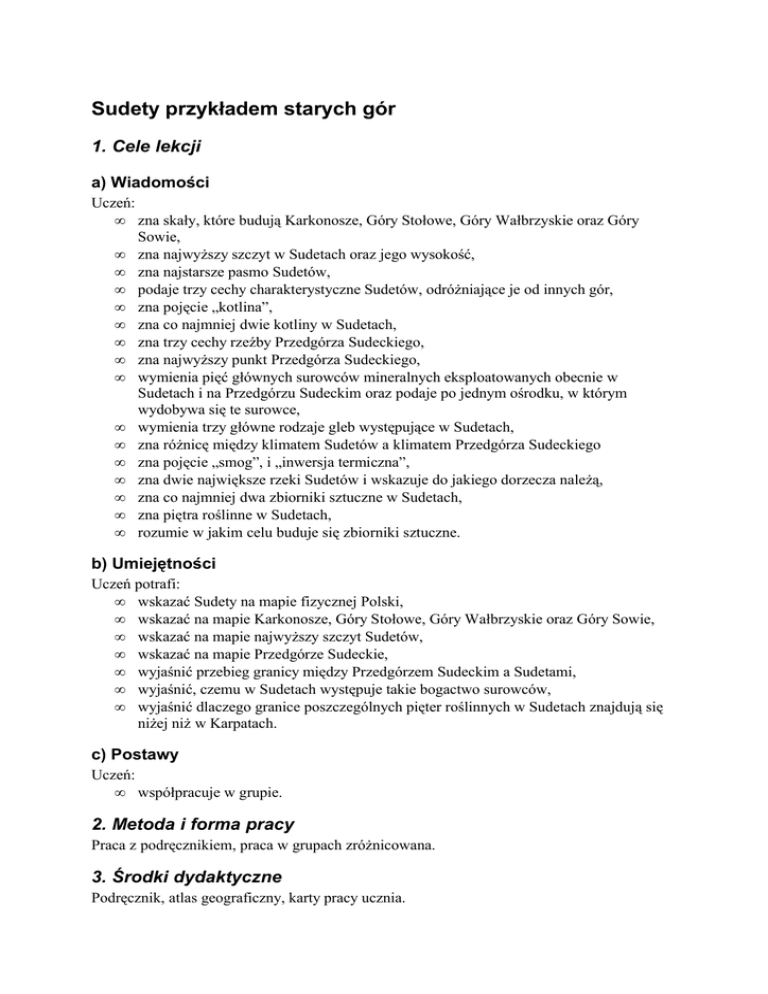 Sudety przykładem starych gór 1. Cele lekcji a) Wiadomości Uczeń: • zna skały, które budują Karkonosze, Góry Stołowe, Góry Wałbrzyskie oraz Góry Sowie, • zna najwyższy szczyt w Sudetach oraz jego wysokość, • zna najstarsze pasmo Sudetów, • podaje trzy cechy charakterystyczne Sudetów, odróżniające je od innych gór, • zna pojęcie „kotlina”, • zna co najmniej dwie kotliny w Sudetach, • zna trzy cechy rzeźby Przedgórza Sudeckiego, • zna najwyższy punkt Przedgórza Sudeckiego, • wymienia pięć głównych surowców mineralnych eksploatowanych obecnie w Sudetach i na Przedgórzu Sudeckim oraz podaje po jednym ośrodku, w którym wydobywa się te surowce, • wymienia trzy główne rodzaje gleb występujące w Sudetach, • zna różnicę między klimatem Sudetów a klimatem Przedgórza Sudeckiego • zna pojęcie „smog”, i „inwersja termiczna”, • zna dwie największe rzeki Sudetów i wskazuje do jakiego dorzecza należą, • zna co najmniej dwa zbiorniki sztuczne w Sudetach, • zna piętra roślinne w Sudetach, • rozumie w jakim celu buduje się zbiorniki sztuczne. b) Umiejętności Uczeń potrafi: • wskazać Sudety na mapie fizycznej Polski, • wskazać na mapie Karkonosze, Góry Stołowe, Góry Wałbrzyskie oraz Góry Sowie, • wskazać na mapie najwyższy szczyt Sudetów, • wskazać na mapie Przedgórze Sudeckie, • wyjaśnić przebieg granicy między Przedgórzem Sudeckim a Sudetami, • wyjaśnić, czemu w Sudetach występuje takie bogactwo surowców, • wyjaśnić dlaczego granice poszczególnych pięter roślinnych w Sudetach znajdują się niżej niż w Karpatach. c) Postawy Uczeń: • współpracuje w grupie. 2. Metoda i forma pracy Praca z podręcznikiem, praca w grupach zróżnicowana. 3. Środki dydaktyczne Podręcznik, atlas geograficzny, karty pracy ucznia. 4. Przebieg lekcji a) Faza przygotowawcza 1. Czynności organizacyjne – sprawdzenie listy obecności, zapisanie tematu lekcji 2. Powtórzenie tematy z poprzedniej lekcji „Tatry – najwyższe pasmo w Polsce”. Pytanie dwóch uczniów przy tablicy: • Wskaż na mapie Tatry. • Na granicy jakich państw leżą Tatry? • Jaki jest najwyższy szczyt Tatr w Polsce a jakie Tatr w ogóle? Podaj nazwę oraz wysokość. • Z jakich skal zbudowane są Tatry? • Wyjaśnij pojęcie „grań” i „stożki piargowe”. • Wymień piętra roślinne w Tatrach od najniższego. 3. Podanie celu lekcji i omówienie sposobu jej przeprowadzenia. b) Faza realizacyjna 1. Starter - pytanie do uczniów – czy wiesz, która część Polski jest najstarsza? Jaka kraina geograficzna tam się znajduje? 2. Klasa zostaje podzielona na pięć grup – każda z nich otrzymuje pytania związane z różnymi cechami środowiska przyrodniczego Sudetów i Przedgórza Sudeckiego. Poszczególne zespoły mają za zadanie odpowiedzieć na pytania (załączniki 1-5). W tym celu wybierają z podręcznika odpowiednie fragmenty. 3. Przedstawiciele grup odpowiadają na forum klasy na pytania do fragmentu tekstu dotyczącego przyporządkowanej im cechy środowiska geograficznego. Wybrana osoba z każdej grupy pokazuje również na mapie ściennej Polski miejsca, które pojawiają się w odpowiedzi swojego zespołu. 4. Podczas odpowiedzi uczniów zadaniem nauczyciela jest uzupełniać materiał 5. Podczas omawiania budowy geologicznej Sudetów nauczyciel zwraca uwagę na charakterystyczne dla Sudetów cechy, które odróżniają je od innych gór. 6. Nauczyciel przy omawianiu klimatu Sudetów wprowadza pojęcie „Inwersja termiczna” i tłumaczy uczniom to zjawisko. 7. Po omówieniu tematu dotyczącego roślinności Sudetów nauczyciel zwraca uwagę na istnienie na tym obszarze Parku Narodowego Gór Stołowych oraz Karkonoskiego Parku Narodowego. c) Faza podsumowująca Uczniowie wypełniają krzyżówkę, przygotowaną przez nauczyciela (załącznik 6). 5. Bibliografia E. Dudek, J. Wójcik, Geografia 1. Podręcznik dla klasy pierwszej gimnazjum, Wydawnictwa Edukacyjne Wiking, Wrocław 2001. Gimnazjalny Atlas Geograficzny, red. D. Teperkowski, S. Bujno, wyd. II, Polskie Przedsiębiorstwo Wydawnictw Kartograficznych S.A., Warszawa 2000. 6. Załączniki a) Karta pracy ucznia Załącznik 1. Grupa 1 Położenie Sudetów i ich budowa geologiczna. • Wskaż na mapie Sudety i określ ich położenie geograficzne w Polsce. • Powiedz jak dzielą się Sudety i wskaż na mapie pasma należące do każdej z części Sudetów, • Wskaż najwyższy szczyt Sudetów. Podaj jego wysokość. • Powiedz jaki rodzaj skał buduje Karkonosze, Góry Stołowe, Góry Wałbrzyskie oraz Góry Sowie. • Nazwij kotliny, występujące w Sudetach i wskaż je na mapie. Załącznik 2. Grupa 2 Położenie Przedgórza Sudeckiego. • Wskaż na mapie Przedgórze Sudeckie. • Powiedz co stanowi granicę między Sudetami a Przedgórzem Sudeckim. W jaki sposób ona powstała i kiedy to było? • Opisz ukształtowanie Przedgórza Sudeckiego. • Jaki jest najwyższy szczyt Przedgórza Sudeckiego? Wskaż go na mapie. Załącznik 3. Grupa 3 Klimat i rzeki Sudetów oraz Przedgórza Sudeckiego. • Opisz klimat Sudetów. Czym się on charakteryzuje? • Co to jest smog? Gdzie występuje to zjawisko i dlaczego się tworzy? • Opisz klimat Przedgórza Sudeckiego? W jaki sposób różni się on od klimatu Sudetów? • Wymień główne rzeki Sudetów i wskaż je na mapie, • Powiedz w jakim celu buduje się sztuczne zbiorniki, • Wymień trzy sztuczne zbiorniki w Sudetach i powiedz na jakich rzekach powstały. Załącznik 4. Grupa 4 Surowce mineralne. • Dlaczego w Sudetach występuje tak dużo surowców mineralnych? • Wymień najważniejsze surowce mineralne w Sudetach. Gdzie się je wydobywa? Wskaż te miejsca na mapie, • Jakie surowce chemiczne wydobywa się w Sudetach? Wskaż miejsca ich eksploatacji. • Jakie surowce wydobywało się w Sudetach w przeszłości? Dlaczego części z nich już się nie eksploatuje? Zał