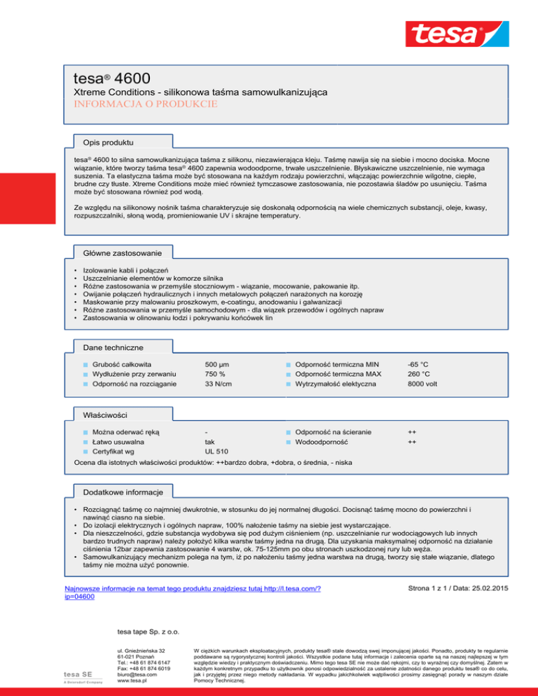tesa® 4600 Xtreme Conditions - silikonowa taśma samowulkanizująca INFORMACJA O PRODUKCIE Opis produktu tesa® 4600 to silna samowulkanizująca taśma z silikonu, niezawierająca kleju. Taśmę nawija się na siebie i mocno dociska. Mocne wiązanie, które tworzy taśma tesa® 4600 zapewnia wodoodporne, trwałe uszczelnienie. Błyskawiczne uszczelnienie, nie wymaga suszenia. Ta elastyczna taśma może być stosowana na każdym rodzaju powierzchni, włączając powierzchnie wilgotne, ciepłe, brudne czy tłuste. Xtreme Conditions może mieć również tymczasowe zastosowania, nie pozostawia śladów po usunięciu. Taśma może być stosowana również pod wodą. Ze względu na silikonowy nośnik taśma charakteryzuje się doskonałą odpornością na wiele chemicznych substancji, oleje, kwasy, rozpuszczalniki, słoną wodą, promieniowanie UV i skrajne temperatury. Główne zastosowanie • • • • • • • Izolowanie kabli i połączeń Uszczelnianie elementów w komorze silnika Różne zastosowania w przemyśle stoczniowym - wiązanie, mocowanie, pakowanie itp. Owijanie połączeń hydraulicznych i innych metalowych połączeń narażonych na korozję Maskowanie przy malowaniu proszkowym, e-coatingu, anodowaniu i galwanizacji Różne zastosowania w przemyśle samochodowym - dla wiązek przewodów i ogólnych napraw Zastosowania w olinowaniu łodzi i pokrywaniu końcówek lin Dane techniczne Grubość całkowita Wydłużenie przy zerwaniu Odporność na rozciąganie 500 µm 750 % 33 N/cm Odporność termiczna MIN Odporność termiczna MAX Wytrzymałość elektyczna -65 °C 260 °C 8000 volt tak UL 510 Odporność na ścieranie Wodoodporność ++ ++ Właściwości Można oderwać ręką Łatwo usuwalna Certyfikat wg Ocena dla istotnych właściwości produktów: ++bardzo dobra, +dobra, o średnia, - niska Dodatkowe informacje • Rozciągnąć taśmę co najmniej dwukrotnie, w stosunku do jej normalnej długości. Docisnąć taśmę mocno do powierzchni i nawinąć ciasno na siebie. • Do izolacji elektrycznych i ogólnych napraw, 100% nałożenie taśmy na siebie jest wystarczające. • Dla nieszczelności, gdzie substancja wydobywa się pod dużym ciśnieniem (np. uszczelnianie rur wodociągowych lub innych bardzo trudnych napraw) należy położyć kilka warstw taśmy jedna na drugą. Dla uzyskania maksymalnej odporność na działanie ciśnienia 12bar zapewnia zastosowanie 4 warstw, ok. 75-125mm po obu stronach uszkodzonej rury lub węża. • Samowulkanizujący mechanizm polega na tym, iż po nałożeniu taśmy jedna warstwa na drugą, tworzy się stałe wiązanie, dlatego taśmy nie można użyć ponownie. Najnowsze informacje na temat tego produktu znajdziesz tutaj http://l.tesa.com/? ip=04600 Strona 1 z 1 / Data: 25.02.2015 tesa tape Sp. z o.o. ul. Gnieźnieńska 32 61-021 Poznań Tel.: +48 61 874 6147 Fax: +48 61 874 6019 [email protected] www.tesa.pl W ciężkich warunkach eksploatacyjnych, produkty tesa® stale dowodzą swej imponującej jakości. Ponadto, produkty te regularnie poddawane są rygorystycznej kontroli jakości. Wszystkie podane tutaj informacje i zalecenia oparte są na naszej najlepszej w tym względzie wiedzy i praktycznym doświadczeniu. Mimo tego tesa SE nie może dać rękojmi, czy to wyraźnej czy domyślnej. Zatem w każdym konkretnym przypadku to użytkownik ponosi odpowiedzialność za ustalenie zdatności danego produktu tesa® co do celu, jak i przyjętej przez niego metody nakładania. W wypadku jakichkolwiek wątpliwości prosimy zasięgnąć porady w naszym dziale Pomocy Technicznej.