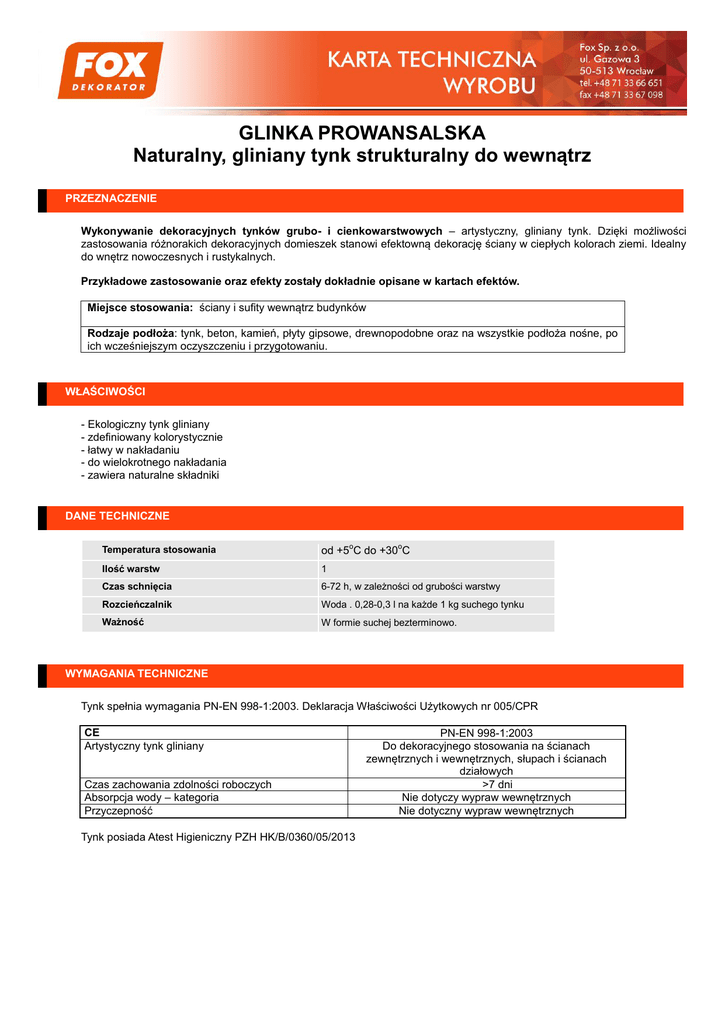 GLINKA PROWANSALSKA Naturalny, gliniany tynk strukturalny do wewnątrz PRZEZNACZENIE Wykonywanie dekoracyjnych tynków grubo- i cienkowarstwowych – artystyczny, gliniany tynk. Dzięki możliwości zastosowania różnorakich dekoracyjnych domieszek stanowi efektowną dekorację ściany w ciepłych kolorach ziemi. Idealny do wnętrz nowoczesnych i rustykalnych. Przykładowe zastosowanie oraz efekty zostały dokładnie opisane w kartach efektów. Miejsce stosowania: ściany i sufity wewnątrz budynków Rodzaje podłoża: tynk, beton, kamień, płyty gipsowe, drewnopodobne oraz na wszystkie podłoża nośne, po ich wcześniejszym oczyszczeniu i przygotowaniu. WŁAŚCIWOŚCI - Ekologiczny tynk gliniany - zdefiniowany kolorystycznie - łatwy w nakładaniu - do wielokrotnego nakładania - zawiera naturalne składniki DANE TECHNICZNE o o Temperatura stosowania od +5 C do +30 C Ilość warstw 1 Czas schnięcia 6-72 h, w zależności od grubości warstwy Rozcieńczalnik Woda . 0,28-0,3 l na każde 1 kg suchego tynku Ważność W formie suchej bezterminowo. WYMAGANIA TECHNICZNE Tynk spełnia wymagania PN-EN 998-1:2003. Deklaracja Właściwości Użytkowych nr 005/CPR CE Artystyczny tynk gliniany Czas zachowania zdolności roboczych Absorpcja wody – kategoria Przyczepność Tynk posiada Atest Higieniczny PZH HK/B/0360/05/2013 PN-EN 998-1:2003 Do dekoracyjnego stosowania na ścianach zewnętrznych i wewnętrznych, słupach i ścianach działowych >7 dni Nie dotyczy wypraw wewnętrznych Nie dotyczny wypraw wewnętrznych NAKŁADANIE Przygotowanie podłoża: Podłoże powinno być: dostatecznie nośne, wysezonowane do stanu powietrzno-suchego- przyjmuje się, że czas sezonowania podłoży wynosi odpowiednio ( w warunkach normalnych, czyli ok. 20 °C i 55 % wilgotności – w innych warunkach czas wysychania może się wydłużyć. - dla tynków gipsowych, cementowych i cementowo-wapiennych – min. 1 tydzień na każdy cm grubości, - dla ścian i stropów betonowych- co najmniej 28 dni, Oczyszczone z warstw mogących osłabić przyczepność produktu, zwłaszcza z kurzu, brudu, wapna, olejów, tłuszczów, resztek farb i innych Zagruntowane – Gruntem Sczepnym FOX DEKORATOR Przygotowanie produktu : Tynk rozmieszać z wodą w ilości ok. 1,4-1,5 l na każde 5 kg suchej mieszanki (0,28-0,3 l na każde 1 kg suchej mieszanki). Powstałą masę mieszać do otrzymania konsystencji pozwalającej na jej przyczepność do narzędzi i podłoża, zamknąć i koniecznie pozostawić w opakowaniu na 1 h. Po okresie dojrzewania powtórnie zmieszać, można dolać wody do uzyskania preferowanej konsystencji.. Barwienie: Zalecane tylko dla GLINKI PROWANSALSKIEJ w kolorze naturalnym. Przy użyciu barwników z tubkowego systemu kolorowania FOX DEKORATOR. Najlepiej wlać barwnik do wody i wymieszać przed rozpoczęciem wsypywania tynku. Należy pamiętać, aby jednorazowo zabarwić odpowiednią ilość tynku do wykonania całej dekoracji. Nakładanie: Tynk można nakładać cienkowarstwowo - na grubość 1-1,5 mm, lub grubowarstwowo – na grubość od 10 do 20 mm Przed rozpoczęciem nakładania tynku należy całą powierzchnię delikatnie zwilżyć wodą. Gotowy do użycia tynk należy nałożyć na gładko za pomocą pacy ze stali nierdzewnej i pozostawić do wyschnięcia ( jeżeli taki jest zamierzony efekt dekoracyjny) lub przystąpić do kreowania dekoracji. Po wyschnięciu strącić miękkim pędzlem niezwiązane ziarna piasku. Efekt uklepywanej struktury- tynk należy nałożyć za pomocą pacy na grubość ziarna, odczekać aż tynk zacznie przesychać i za pomocą rąk (należy założyć rękawice) uklepywać, zagładzać, formować powierzchnię do pożądanego kształtu. Efekt wygładzonej struktury- tynk należy nałożyć za pomocą pacy na grubość ziarna, odczekać aż tynk zacznie przesychać i za pomocą pacy zagładzać powierzchnię do jej wyrównania. Efekt wymywanej struktury- tynk należy nałożyć za pomocą pacy na grubość ziarna i wygładzić. Poczekać do całkowitego wyschnięcia powierzchni tynku, i następnie należy rozpocząć wymywanie przy użyciu gąbki, którą należy regularnie płukać w wodzie i odsączać. Ruchami okrężnymi należy ściągnąć glinę aż do odsłonięcia uziarnienia. Bardzo efektownie wygląda efekt wymywanej struktury przez szablon. Wystarczy umocować szablon na wygładzonym i wyschniętym tynku glinianym i przy użyciu lekko wilgotnej gąbki, zapobiegając spływaniu strużek w dół, delikatnie wymyć wzór szablonu. Następnie należy usunąć szablon i pozostawić do wyschnięcia aż kolory się wyrównają. Po wyschnięciu strącić miękkim pędzlem niezwiązane ziarna piasku. Wypełnienia dekoracyjne – efekt słomy GLINKA PROWANSALSKA może zawierać specjalnie preparowaną słomę celem uzyskania włóknistego wyglądu. W celu uwidocznienia słomy, po wyschnięciu ściany należy wymyć glinę ruchami okrężnymi. Uwaga! GLINKA PROWANSALSKA wraz z naturalnymi dodatkami takimi jak słoma nie może być długo przechowywana w formie mokrej. Po zmieszaniu z wodą zużyć w ciągu 3-4 dni. UWAGA - grubowarstwowe tynki gliniane dużo wolniej wysychają, nawet do 10 dni przy niesprzyjających warunkach. Zabezpieczenie: Jeżeli zachodzi potrzeba zabezpieczenia tynku to po wyschnięciu, tynk można pokryć LAKIEREM DEKORACYJNYM FOX DEKORATOR matowym lub satynowym, w zależności od miejsca zastosowania oraz zamierzonego efektu dekoracyjnego. Przykładowe techniki nakładania tynku zostały dokładnie opisane w kartach efektów, dostępnych na stronie www.fox-dekorator.pl. ZUŻYCIE Średnio zużywa się 0,5-1,5 kg/m². Wydajność zależy od struktury i chłonności podłoża, od sposobu jego przygotowania, od zamierzonego efektu dekoracyjnego, od doświadczenia wykonawcy, od grubości warstwy, wybranej metody aplikacyjnej. WAŻNE INFORMACJE DODATKOWE Słabej jakości stalowe pace weneckie mogą pozostawić widoczne ciemniejsze przebarwienia. Użyt