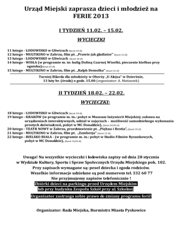 Urząd Miejski zaprasza dzieci i młodzież na FERIE 2013 I TYDZIEŃ 11.02. – 15.02. WYCIECZKI 11 lutego - LODOWISKO w Gliwicach (koszt 10 zł) 12 lutego - MULTIKINO w Zabrzu, film pt. „Prawie jak gladiator” (koszt 12 zł) 13 lutego - LODOWISKO w Gliwicach (koszt 10 zł) 14 lutego - WISŁA (w programie m. in: kulig Doliną Czarnej Wisełki, pieczenie kiełbas przy ognisku)(koszt 25 zł) 15 lutego - MULTIKINO w Zabrzu, film pt. „Ralph Demolka” (koszt 12 zł) Turniej Bilarda dla młodzieży w Oberży „U Alojza” w Dzierżnie, 13 luty br. (środa) o godz. 15.00 (organizator: A. Matiaszek) II TYDZIEŃ 18.02. – 22.02. WYCIECZKI: 18 lutego - LODOWISKO w Gliwicach (koszt 10 zł) 19 lutego - KRAKÓW (w programie m. in.: pobyt w Muzeum Inżynierii Miejskiej; zabawa na urządzeniach interaktywnych, udział w zajęciach - możliwość samodzielnego wykonania prostych doświadczeń, pobyt w MC Donaldzie), (koszt 10,50 zł) 20 lutego - TEATR NOWY w Zabrzu, przedstawienie pt. „Piękna i Bestia”, (koszt 15 zł) 21 lutego - MULTIKINO w Zabrzu, film pt. „Zambezja” (koszt 12 zł) 22 lutego - BIELSKO BIAŁA - (w programie m. in.: pobyt w Studio Filmów Rysunkowych, pobyt w MC Donaldzie), (koszt 15,50 zł) Uwaga! Na wszystkie wycieczki i lodowiska zapisy od dnia 28 stycznia w Wydziale Kultury, Sportu i Spraw Społecznych Urzędu Miejskiego pok. 102. Przy zapisach wymagane są: pesel dziecka i zgoda rodziców. Wszelkie informacje udzielane są pod numerem tel. 332 60 77 Nie przyjmujemy zapisów telefonicznie ! Zbiórki dzieci na parkingu przed Urzędem Miejskim lub przy budynku Zespołu Szkół przy ul. Szkolnej Organizator zastrzega sobie prawo do zmiany programu ferii! Organizator: Rada Miejska, Burmistrz Miasta Pyskowice