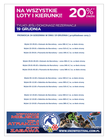 PROMOCJA 24 GODZINNA W DNIU 19 GRUDNIA ( przykładowe ceny ): Wylot 22-29.01 z Katowic do Barcelony - cena 206 zł / os. w dwie strony Wylot 22-29.01 z Gdańska do Barcelony – cena 510 zł./ os. w dwie strony Wylot 22-29.01 z Poznania do Barcelony – cena 190 zł / os. w dwie strony Wylot 29.01-05.02 z Katowic do Barcelony – cena 206 zł / os. w dwie strony Wylot 29.01-05.02 z Gdańska do Barcelony – cena 240 zł / os. w dwie strony Wylot 29.01-05.02 z Poznania do Barcelony – cena 580 zł / os. w dwie strony Wylot 05-12.02 z Katowic do Barcelony – cena 330 zł / os. w dwie strony Wylot 05-12.02 z Gdańska do Barcelony – cena 390 zł / os. w dwie strony Wylot 05-12.02 z Poznania do Barcelony – cena 310 zł / os. w dwie strony Wylot 12-19.02 z Katowic do Barcelony – cena 440 zł / os. w dwie strony Wylot 12-19.02 z Gdańska do Barcelony – cena 400 zł / os. w dwie strony Wylot 12-19.02 z Poznania do Barcelony – cena 280 zł / os. w dwie strony