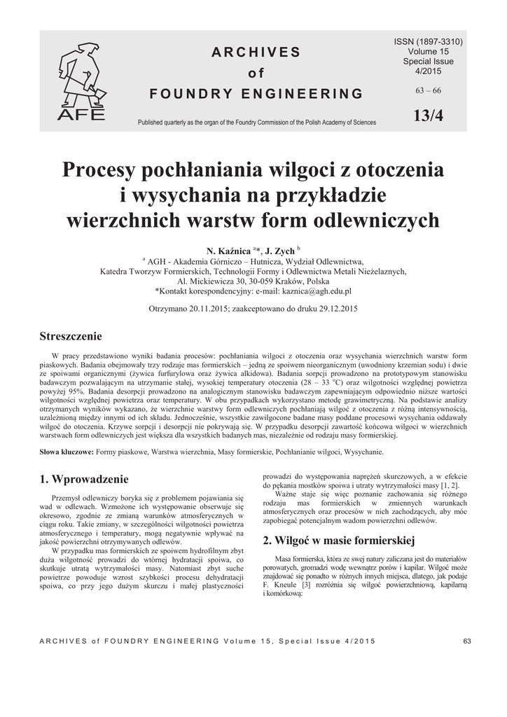 ARCHIVES of ISSN (1897-3310) Volume 15 Special Issue 4/2015 63 – 66 FOUNDRY ENGINEERING Published quarterly as the organ of the Foundry Commission of the Polish Academy of Sciences 13/4 Procesy pochłaniania wilgoci z otoczenia i wysychania na przykładzie wierzchnich warstw form odlewniczych a N. Kaźnica a*, J. Zych b AGH - Akademia Górniczo – Hutnicza, Wydział Odlewnictwa, Katedra Tworzyw Formierskich, Technologii Formy i Odlewnictwa Metali Nieżelaznych, Al. Mickiewicza 30, 30-059 Kraków, Polska *Kontakt korespondencyjny: e-mail: [email protected] Otrzymano 20.11.2015; zaakceptowano do druku 29.12.2015 Streszczenie W pracy przedstawiono wyniki badania procesów: pochłaniania wilgoci z otoczenia oraz wysychania wierzchnich warstw form piaskowych. Badania obejmowały trzy rodzaje mas formierskich – jedną ze spoiwem nieorganicznym (uwodniony krzemian sodu) i dwie ze spoiwami organicznymi (żywica furfurylowa oraz żywica alkidowa). Badania sorpcji prowadzono na prototypowym stanowisku badawczym pozwalającym na utrzymanie stałej, wysokiej temperatury otoczenia (28 – 33 oC) oraz wilgotności względnej powietrza powyżej 95%. Badania desorpcji prowadzono na analogicznym stanowisku badawczym zapewniającym odpowiednio niższe wartości wilgotności względnej powietrza oraz temperatury. W obu przypadkach wykorzystano metodę grawimetryczną. Na podstawie analizy otrzymanych wyników wykazano, że wierzchnie warstwy form odlewniczych pochłaniają wilgoć z otoczenia z różną intensywnością, uzależnioną między innymi od ich składu. Jednocześnie, wszystkie zawilgocone badane masy poddane procesowi wysychania oddawały wilgoć do otoczenia. Krzywe sorpcji i desorpcji nie pokrywają się. W przypadku desorpcji zawartość końcowa wilgoci w wierzchnich warstwach form odlewniczych jest większa dla wszystkich badanych mas, niezależnie od rodzaju masy formierskiej. Słowa kluczowe: Formy piaskowe, Warstwa wierzchnia, Masy formierskie, Pochłanianie wilgoci, Wysychanie. 1. Wprowadzenie Przemysł odlewniczy boryka się z problemem pojawiania się wad w odlewach. Wzmożone ich występowanie obserwuje się okresowo, zgodnie ze zmianą warunków atmosferycznych w ciągu roku. Takie zmiany, w szczególności wilgotności powietrza atmosferycznego i temperatury, mogą negatywnie wpływać na jakość powierzchni otrzymywanych odlewów. W przypadku mas formierskich ze spoiwem hydrofilnym zbyt duża wilgotność prowadzi do wtórnej hydratacji spoiwa, co skutkuje utratą wytrzymałości masy. Natomiast zbyt suche powietrze powoduje wzrost szybkości procesu dehydratacji spoiwa, co przy jego dużym skurczu i małej plastyczności prowadzi do występowania naprężeń skurczowych, a w efekcie do pękania mostków spoiwa i utraty wytrzymałości masy [1, 2]. Ważne staje się więc poznanie zachowania się różnego rodzaju mas formierskich w zmiennych warunkach atmosferycznych oraz procesów w nich zachodzących, aby móc zapobiegać potencjalnym wadom powierzchni odlewów. 2. Wilgoć w masie formierskiej Masa formierska, która ze swej natury zaliczana jest do materiałów porowatych, gromadzi wodę wewnątrz porów i kapilar. Wilgoć może znajdować się ponadto w różnych innych miejsca, dlatego, jak podaje F. Kneule [3] rozróżnia się wilgoć powierzchniową, kapilarną i komórkową: ARCHIVES of FOUNDRY ENGINEERING Volume 15, Special Issue 4/2015 63 wilgoć powierzchniową stanowi warstwa cieczy na powierzchni danego materiału, która pozostaje w kontakcie z czynnikiem suszącym. Jednakże prężność pary nad jej powierzchnią jest równa prężności pary nasyconej w danej temperaturze; wilgoć kapilarną stanowi ciecz zgromadzona wewnątrz danego materiału, a jej zachowanie determinowane jest przez średnicę porów. Ciśnienie pary nad zwierciadłem cieczy w mikroporach jest zdecydowanie mniejsze od prężności pary nasyconej; wilgoć komórkową stanowi woda wchodząca w skład struktury materiału, tworząc z nim układ koloidalny i powodując jego pęcznienie [4]. pod wpływem sił kapilarnych, co skutkuje wyrównaniem wilgotności w mikroobszarach materiału. Dalszy wzrost wilgotności materiału ponad wartość krytyczną powoduje zwiększenie ilości nieprzerwanych „nitek cieczy” aż do niemal całkowitego wypełnienia objętości porów i kapilar. Pełne nasycenie wodą powoduje ustanie ruchu kapilarnego i przepływu konwekcyjnego wody w materiale [7]. Wilgoć znajdująca się w materiale może być z nim związana na kilka sposobów różniących się od siebie wartością energii wiązania. Na tej podstawie rozróżnia się wilgoć wiązaną chemicznie, fizyko – chemicznie oraz fizyko – mechanicznie [5]. Proces suszenia polega na eliminacji wody z materiału do otoczenia poprzez dyfuzję z wnętrza ku jego powierzchni, a następnie poprzez parowanie właśnie z tej powierzchni [5]. Jest to zjawisko trudne do opisu ze względu na swoją złożoność wynikającą z faktu zmieniających się w czasie trwania procesu mechanizmów transportu zarówno ciepła, jaki i masy, zależnie od zawartości wilgoci i rodzaju jej wiązania z materiałem suszonym [8]. Siłą napędową omawianego procesu w otoczeniu powietrza jest różnica ciśnień cząstkowych pary wodnej między powierzchnią materiału poddanego wysychaniu a powietrzem suszącym. Aby mogło dojść do procesu wysychania musi zostać spełniona zależność pp > pg, czyli ciśnienie cząstkowe pary wodnej nad powierzchnią materiału (pp) musi być wyższe od ciśnienia cząstkowego w gazie otaczającym materiał (pg). W przeciwnym razie to dany materiał będzie pobierał wilgoć z otoczenia. Natomiast sama intensywność procesu jest tym większa, im mniejsza jest wilgotność względna czynnika suszącego oraz wyższa jego temperatura. W momencie, w którym ciśnienia cząstkowe par nad powierzchnią materiału oraz w otaczającym gazie będą sobie równe, wówczas proces suszenia zostanie 