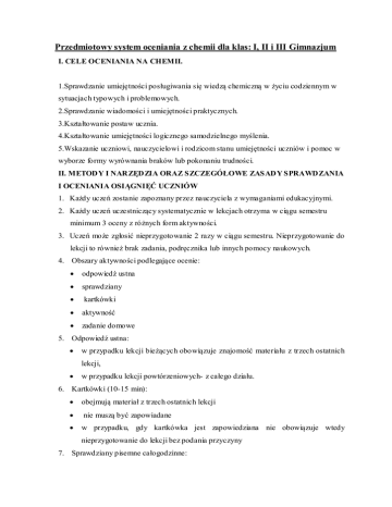 Przedmiotowy system oceniania z chemii dla klas: I, II i III Gimnazjum I. CELE OCENIANIA NA CHEMII. 1.Sprawdzanie umiejętności posługiwania się wiedzą chemiczną w życiu codziennym w sytuacjach typowych i problemowych. 2.Sprawdzanie wiadomości i umiejętności praktycznych. 3.Kształtowanie postaw ucznia. 4.Kształtowanie umiejętności logicznego samodzielnego myślenia. 5.Wskazanie uczniowi, nauczycielowi i rodzicom stanu umiejętności uczniów i pomoc w wyborze formy wyrównania braków lub pokonaniu trudności. II. METODY I NARZĘDZIA ORAZ SZCZEGÓŁOWE ZASADY SPRAWDZANIA I OCENIANIA OSIĄGNIĘĆ UCZNIÓW 1. Każdy uczeń zostanie zapoznany przez nauczyciela z wymaganiami edukacyjnymi. 2. Każdy uczeń uczestniczący systematycznie w lekcjach otrzyma w ciągu semestru minimum 3 oceny z różnych form aktywności. 3. Uczeń może zgłosić nieprzygotowanie 2 razy w ciągu semestru. Nieprzygotowanie do lekcji to również brak zadania, podręcznika lub innych pomocy naukowych. 4. Obszary aktywności podlegające ocenie: odpowiedź ustna sprawdziany kartkówki aktywność zadanie domowe 5. Odpowiedź ustna: w przypadku lekcji bieżących obowiązuje znajomość materiału z trzech ostatnich lekcji, w przypadku lekcji powtórzeniowych- z całego działu. 6. Kartkówki (10-15 min): obejmują materiał z trzech ostatnich lekcji nie muszą być zapowiadane w przypadku, gdy kartkówka jest zapowiedziana nie obowiązuje wtedy nieprzygotowanie do lekcji bez podania przyczyny 7. Sprawdziany pisemne całogodzinne: przeprowadzane po zakończeniu każdego działu zapowiadane tydzień wcześniej sprawdziany mogą zawierać dodatkowe pytania (zadania ) na ocenę celującą sprawdziany są obowiązkowe - jeżeli uczeń opuścił sprawdzian z przyczyn losowych, powinien go napisać w terminie nie przekraczającym 2 tygodni od powrotu do szkoły; czas i sposób do uzgodnienia z nauczycielem - zalecane w godzinach konsultacji nauczyciela uczeń może przystępować do poprawy danego sprawdzianu tylko jeden raz ocenę niedostateczną ze sprawdzianu należy poprawić, poprawa jest obowiązkowa, poprawa odbywa się poza lekcjami, w ciągu 1 tygodnia od rozdania prac oceny wyższe niż niedostateczna można poprawić - na prośbę ucznia przy pisaniu i poprawianiu sprawdzianu punktacja nie zmienia się, otrzymane oceny są wpisywane do dziennika pod koniec semestru nie przewiduje się dodatkowych sprawdzianów umożliwiających podniesienie proponowanej przez nauczyciela oceny 8. W przypadku prac pisemnych przyjmuję się skalę punktową przeliczaną na oceny cyfrowe wg kryteriów: 0-44% =ndst 45%-55% = dop 56%-70% = dst 71%-85% = db 86%-95% = bdb 96%-100% = cel Wszystkie prace są archiwizowane- uczniowie i ich rodzice mogą je zobaczyć i otrzymać uzasadnienie wystawionej oceny. Nauczyciel ma obowiązek ocenienia i oddania prac pisemnych w ciągu 2 tygodni 9. Pod pojęciem aktywności rozumiemy: częste zgłaszanie i udzielanie prawidłowych odpowiedzi na lekcji udział w konkursach przedmiotowych wykonywanie dodatkowych zadań, pomocy naukowych prezentacja referatu, metoda projektu Aktywność ucznia może być oceniana znakiem „+” lub „- „ : ustala się, że za pięć „+” uzyskuje się ocenę bardzo dobrą, a za 3 „- „ ocenę niedostateczną. Pod koniec semestru na życzenie ucznia może uzyskać ocenę dobrą za 4 znaki”+”, dostateczną za 3 znaki”+”. 10. Oceny wystawiane przez nauczyciela są jawne. 11. Uczeń ma obowiązek prowadzenia zeszytu przedmiotowego oraz noszenia podręcznika . III. OGÓLNE WYMAGANIA EDUKACYJNE Z CHEMII Ocenę celującą (treści wykraczające) otrzymuje uczeń, który spełnia wymagania na oce nę bardzo dobrą oraz: • ma wiadomości i umiejętności znacznie wykraczające poza program nauczania, • stosuje wiadomości w sytuacjach nietypowych (problemowych), • formułuje problemy oraz dokonuje analizy i syntezy nowych zjawisk, • proponuje rozwiązania nietypowe, • osiąga sukcesy w konkursach chemicznych na szczeblu wyższym niż szkolny. Ocenę bardzo dobrą (treści dopełniające) otrzymuje uczeń, który spełnia wymagania na ocenę dobrą oraz: • opanował w pełnym zakresie wiadomości i umiejętności określone w p rogramie, • stosuje zdobytą wiedzę do rozwiązywania problemów i zadań w nowych sytuacjach, • wykazuje dużą samodzielność i potrafi bez pomocy nauczyciela korzystać z różnych źródeł wiedzy, np. układu okresowego pierwiastków chemicznych, wykresów, tablic chemicznych, encyklopedii, internetu, • projektuje i bezpiecznie wykonuje doświadczenia chemiczne, • biegle zapisuje i bilansuje równania reakcji chemicznych oraz samodzielnie rozwiązuje zadania obliczeniowe o dużym stopniu trudności. Ocenę dobrą (treści rozs zerzające) otrzymuje uczeń, który spełnia wymagania na oceną dostateczną oraz: • opanował w dużym zakresie wiadomości i umiejętności określone w programie, • poprawnie stosuje wiadomości i umiejętności do samodzielnego rozwiązywania typowych zadań i problemów, • korzysta z układu okresowego pierwiastków chemicznych, wykresów, tablic chemicznych i innych źródeł wiedzy chemicznej, • bezpiecznie wykonuje doświadczenia chemiczne, • zapisuje i bilansuje równania reakcji chemicznych, • samodzielnie rozwiązuje zadania obliczeniowe o średnim stopniu trudności. Ocenę dostateczną (treści podstawowe) otrzymuje uczeń, który spełnia wymagania na ocenę dopuszczającą: • opanował w zakresie podstawowym te wiadomości i umiejętności określone w programie, które są konieczne do dalszego kształcenia, • z pomocą nauczyciela poprawnie stosuje wiadomości i umiejętności do rozwiązywania typowych zadań i problemów, • z pomocą nauczyciela korzysta ze źródeł wiedzy, takich jak: układ okresowy pierwiastków chemicznych, wykresy, tablice chemiczne, • z pomocą nauczyciela bezpiecznie wykonuje doświadczenia chemiczne, • z p