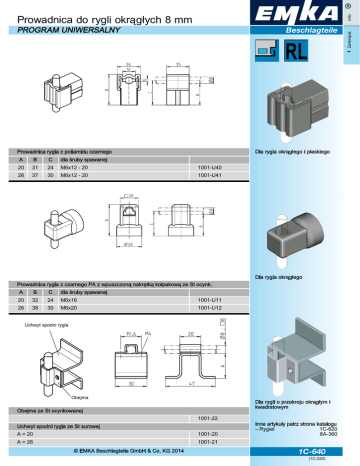 ® Program uniwersalny Beschlagteile Dla rygla okrągłego i płaskiego Prowadnica rygla z poliamidu czarnego A B C dla śruby spawanej 20 31 24 M6x12 - 20 1001-U40 26 37 30 M6x12 - 20 1001-U41 Dla rygla okrągłego Prowadnica rygla z czarnego PA z wpuszczoną nakrętką kołpakową ze St ocynk. A B C dla śruby spawanej 20 32 24 M6x16 1001-U11 26 38 30 M6x20 1001-U12 Uchwyt spodni rygla Obejma Dla rygli o przekroju okrągłym i kwadratowym Obejma ze St ocynkowanej 1001-22 Uchwyt spodni rygla ze St surowej A = 20 1001-20 A = 26 1001-21 © EMKA Beschlagteile GmbH & Co. KG 2014 Inne artykuły patrz strona katalogu ‒ Rygiel 1C-620 8A-360 1C-640 (1C-220) 1 Zamknięcia Info Prowadnica do rygli okrągłych 8 mm