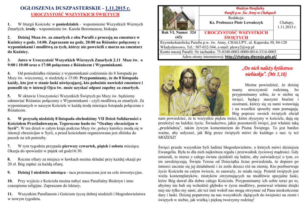 OGŁOSZENIA DUSZPASTERSKIE - 1.11.2015 r. UROCZYSTOŚĆ WSZYSTKICH ŚWIĘTYCH 1. W liturgii Kościoła: w poniedziałek - wspomnienie Wszystkich Wiernych Zmarłych, środę - wspomnienie św. Karola Boromeusza, biskupa. 2. Dzisiaj Msza św. za zmarłych z obu Parafii z procesją na cmentarz w Kuźnicy o godz. 14:00. Zapraszam na godz. 20:00 na Różaniec połączony z wypominkami i modlitwą za tych, którzy nie powrócili z morza na cmentarz do Kuźnicy. 3. Jutro w Uroczystość Wszystkich Wiernych Zmarłych 2.11 Msze św. o 9:00 i 10:00 oraz o 17:00 połączona z Różańcem i Wypominkami. 4. Od poniedziałku różaniec z wypominkami codziennie do 8 listopada po Mszy św. wieczornej, w niedzielę o 15:00. Przypominamy, że do 8 listopada każdy, kto jest w stanie łaski uświęcającej, kto pobożnie nawiedzi cmentarz i pomodli się w intencji Ojca św. może uzyskać odpust zupełny za zmarłych. 5. W oktawie Uroczystości Wszystkich Świętych po Mszy św. będziemy odmawiać Różaniec połączony z Wypominkami - czyli modlitwą za zmarłych. Za wypominanych w naszym Kościele w każdą środę miesiąca listopada połączona z Różańcem. 6. W przyszłą niedzielę 8 listopada obchodzimy VII Dzień Solidarności z Kościołem Prześladowanym. Tegoroczne hasło to: "Ocalmy chrześcijan w Syrii". W ten dzień w całym kraju podczas Mszy św. polscy katolicy modą się w intencji chrześcijan w Syrii, a przed kościołami organizowana jest zbiórka do puszek na ich potrzeby. 7. W tym tygodniu przypada pierwszy czwartek, piątek i sobota miesiąca. Okazja do spowiedzi w piątek od godz16:30. 8. Roczne ofiary za miejsca w ławkach można składać przy każdej okazji po 20 zł. Bóg zapłać za każdą ofiarę. 9. Dzisiaj I niedziela miesiąca - taca przeznaczona jest na cele inwestycyjne. 10. Przy wyjściu z Kościoła można nabyć nasz Parafialny Biuletyn i inne czasopisma religijne. Zapraszam do lektury. 11. Wszystkim Parafianom i Gościom życzę dobrej niedzieli i błogosławieństwa w nowym tygodniu. Biuletyn Parafialny Parafii p.w. Św. Anny w Chałupach Redakcja: Ks. Proboszcz Piotr Lewańczyk Chałupy, 1.11.2015 r. Rok VI, Numer 324 UROCZYSTOŚĆ WSZYSTKICH (43) ŚWIĘTYCH Rzymskokatolicka Parafia p.w. św. Anny, CHAŁUPY, ul. Kaperska 30, 84-120 Władysławowo, Tel.: 507-032-544, e-mail: [email protected] Konto naszej Parafii: Nr rachunku: 75-8348-0003-0000-0014-3316-0003 Adres strony internetowej: http://chalupy.diecezja.gda.pl/ „Do nich należy królestwo niebieskie”. (Mt 5,10) Można powiedzieć, że dzisiaj mamy uroczystość rodzinną, bo przypominamy sobie, że w niebie są święci, będący naszymi braćmi i siostrami, którzy się za nami wstawiają i na wszelkie sposoby nam pomagają. Bóg poprzez swoich świętych chciał nam powiedzieć, że te wszystkie piękne treści, które słyszymy w kościele, dają się przełożyć na ludzkie życie. Świadectwo, jakie pozostawili święci, jest właśnie taką „przekładnią”, takim żywym komentarzem do Pisma Świętego. To jest bardzo ważne, aby usłyszeć, jak Bóg przez świętych mówi do każdego z nas: ty też MOŻESZ! Święci przede wszystkim byli ludźmi błogosławieństw, o których mówi dzisiejsza Ewangelia. Była to dla nich najkrótsza reguła i przewodnik życiowej mądrości. Gdy umierali, to nieraz z całego świata zjeżdżali się ludzie, aby zaświadczyć o tym, co im zawdzięczają. Święta Teresa od Dzieciątka Jezus powiedziała, że dopiero po śmierci zacznie się jej działalność i że ześle deszcz róż na ziemię. Kto poobserwuje życie Kościoła na całym świecie, to zauważy, że miała rację. Pośród świętych jest wielu kontemplatyków, mistyków otrzymujących na modlitwie specjalne łaski, które Bóg dawał dla dobra całego Kościoła. Przypominamy ich sobie teraz po to, abyśmy nie bali się wchodzić głęboko w życie modlitwy, ponieważ właśnie dzięki niej nie tylko my sami, ale też inni wokół nas mogą otrzymać od Pana nieskończone dary i łaski. Dzisiaj popatrzmy na nas wszystkich: dążących do świętości na ziemi i świętych w niebie, jak wielką i piękną tworzymy rodzinę! ZADUSZKI Zaraz po uroczystości Wszystkich Świętych Kościół obchodzi wspomnienie Wszystkich Wiernych Zmarłych. Dzień Zaduszny to czas szczególnej modlitwy do Boga za zmarłych o to, by mieli udział w Chrystusowym zwycięstwie nad śmiercią. Zaduszki to dzień pamięci o tych co już odeszli, których już nie ma wśród nas. Polska tradycja nakazuje odwiedzanie w ten dzień grobów swoich bliskich, zapalenie zniczy, złożenie wieńców i kwiatów. Odwiedzając miejsca wiecznego spoczynku, zachowajmy należytą powagę, zastanówmy się nad przemijaniem, przywołajmy ulotne wspomnienia. Cmentarz jest miejscem gdzie spoczywają nasi najbliżsi: dziadkowie, rodzeństwo, nasi rodzice, również najbliżsi naszych znajomych. Ich też należy uszanować. Święto Zmarłych jest to dobry moment na refleksje, także nad własnym życiem, nad przeszłością, teraźniejszością i przyszłością. Jest to okazja do wspomnień, do dzielenia się troskami, kłopotami i radością. Kult zmarłych od najdawniejszych czasów był i jest głęboko zakorzeniony we wszystkich religiach i kulturach świata. Kościół, którego posłannictwo koncentruje się przede wszystkim wokół głoszenia tajemnicy paschalnej, "błogosławionej Męki i Zmartwychwstania oraz chwalebnego Wniebowstąpienia Chrystusa", kultowi temu poświęca wiele uwagi. W ciągu całego roku w czasie każdej Mszy św. uobecnia się paschalna tajemnica Chrystusa, czyli przejście Syna Bożego przez śmierć do nowego życia. Kościół wspomina każdego dnia we Mszy św. zmarłych słowami modlitwy: "Pamiętaj także o naszych zmarłych braciach i siostrach, którzy zasnęli z nadzieją zmartwychwstania, i o wszystkich, którzy odeszli z tego świata". Prosi Boga, aby dopuścił ich do oglądania światłości w