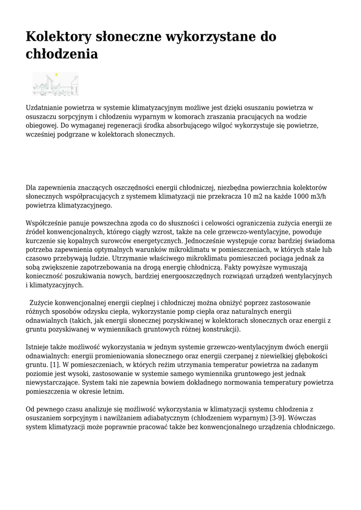 Kolektory słoneczne wykorzystane do chłodzenia Uzdatnianie powietrza w systemie klimatyzacyjnym możliwe jest dzięki osuszaniu powietrza w osuszaczu sorpcyjnym i chłodzeniu wyparnym w komorach zraszania pracujących na wodzie obiegowej. Do wymaganej regeneracji środka absorbującego wilgoć wykorzystuje się powietrze, wcześniej podgrzane w kolektorach słonecznych. Dla zapewnienia znaczących oszczędności energii chłodniczej, niezbędna powierzchnia kolektorów słonecznych współpracujących z systemem klimatyzacji nie przekracza 10 m2 na każde 1000 m3/h powietrza klimatyzacyjnego. Współcześnie panuje powszechna zgoda co do słuszności i celowości ograniczenia zużycia energii ze źródeł konwencjonalnych, którego ciągły wzrost, także na cele grzewczo-wentylacyjne, powoduje kurczenie się kopalnych surowców energetycznych. Jednocześnie występuje coraz bardziej świadoma potrzeba zapewnienia optymalnych warunków mikroklimatu w pomieszczeniach, w których stale lub czasowo przebywają ludzie. Utrzymanie właściwego mikroklimatu pomieszczeń pociąga jednak za sobą zwiększenie zapotrzebowania na drogą energię chłodniczą. Fakty powyższe wymuszają konieczność poszukiwania nowych, bardziej energooszczędnych rozwiązań urządzeń wentylacyjnych i klimatyzacyjnych. Zużycie konwencjonalnej energii cieplnej i chłodniczej można obniżyć poprzez zastosowanie różnych sposobów odzysku ciepła, wykorzystanie pomp ciepła oraz naturalnych energii odnawialnych (takich, jak energii słonecznej pozyskiwanej w kolektorach słonecznych oraz energii z gruntu pozyskiwanej w wymiennikach gruntowych różnej konstrukcji). Istnieje także możliwość wykorzystania w jednym systemie grzewczo-wentylacyjnym dwóch energii odnawialnych: energii promieniowania słonecznego oraz energii czerpanej z niewielkiej głębokości gruntu. [1]. W pomieszczeniach, w których reżim utrzymania temperatur powietrza na zadanym poziomie jest wysoki, zastosowanie w systemie samego wymiennika gruntowego jest jednak niewystarczające. System taki nie zapewnia bowiem dokładnego normowania temperatury powietrza pomieszczenia w okresie letnim. Od pewnego czasu analizuje się możliwość wykorzystania w klimatyzacji systemu chłodzenia z osuszaniem sorpcyjnym i nawilżaniem adiabatycznym (chłodzeniem wyparnym) [3-9]. Wówczas system klimatyzacji może poprawnie pracować także bez konwencjonalnego urządzenia chłodniczego. Rys. 1. Osuszacz obrotowy typu RECUSORB B firmy DST [10] Rys. 2. Osuszacz obrotowy typu CONSORB DC firmy DST [10] Rys. 3. Schemat słonecznego systemu klimatyzacji z osuszaniem sorpcyjnym Rys. 4. Wykres h-x; charakterystyczne przemiany powietrza w systemie klimatyzacji z osuszaniem sorpcyjnym Wykorzystanie powietrznych kolektorów słonecznych Powietrzne kolektory słoneczne można efektywnie wykorzystywać do podgrzewania powietrza regeneracyjnego w zasadzie tylko przy niższych temperaturach regeneracji (50÷80oC). Osiągnięcie wyższej temperatury powietrza jest w kolektorach powietrznych utrudnione, a wymagana powierzchnia kolektorów słonecznych może okazać się zbyt duża pod względem ekonomicznym. Rys. 5. Zmiany natężenie promieniowania słonecznego Ic docierającego do powierzchni kolektora słonecznego pochylonego pod katem 30o do poziomu i zysków ciepła jawnego Qzj dla analizowanego pomieszczenia w warunkach obliczeniowych okresu ciepłego (lipiec i wrzesień) Podsumowanie Z wstępnych danych eksperymentalnych wynika, że oszczędności energii chłodniczej w wyniku zastosowania systemu klimatyzacji z osuszaniem sorpcyjnym w porównaniu z rozwiązaniami konwencjonalnymi w klimacie środkowoeuropejskim dochodzą do 75-80% [5]. Rys. 6. Temperatury powietrza regeneracyjnego, możliwe do osiągnięcia w wyniku konwersji promieniowania słonecznego w lipcu, przy różnej powierzchni zainstalowanych kolektorów słonecznych w systemie klimatyzacji z osuszaniem sorpcyjnym Rys. 7. Temperatury powietrza regeneracyjnego, możliwe do osiągnięcia w wyniku konwersji promieniowania słonecznego we wrześniu, przy różnej powierzchni zainstalowanych kolektorów słonecznych w systemie klimatyzacji z osuszaniem sorpcyjnym Rys. 8. Stopień pokrycia zapotrzebowania na energię cieplną do regeneracji osuszacza w systemie klimatyzacji o różnej powierzchni kolektorów słonecznych w wyniku konwersji promieniowania słonecznego i odzysku ciepła w obliczeniowym dniu września Pomimo znacznych oszczędności eksploatacyjnych, koszty inwestycyjne systemu klimatyzacji z osuszaniem sorpcyjnym (w którym osuszacz sorpcyjny, wymiennik obrotowy, bateria kolektorów słonecznych należą do najbardziej kosztownych) mogą znacząco przewyższać koszty inwestycyjne tradycyjnego systemu klimatyzacyjnego (w którym najdroższym urządzeniem jest agregat chłodniczy). Dlatego też obecnie system ten może okazać się nieopłacalny pod względem ekonomicznym. Pamiętać jednak należy także o kosztach ochrony środowiska naturalnego, związanych, w przypadku eksploatacji systemu konwencjonalnego, z uwalnianiem do atmosfery niekorzystnych freonów. Także obserwowana tendencja spadku cen niektórych komponentów słonecznego systemu klimatyzacji, w tym kolektorów słonecznych [11], przyczynić się może w niedalekiej przyszłości do większego zainteresowania wykorzystaniem energii słonecznej w klimatyzacji. Źródło: www.ekoenergia.polska-droga.pl