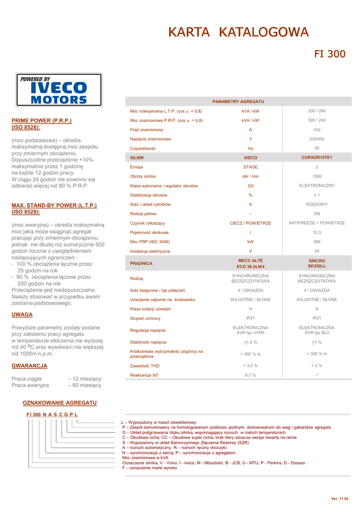 KARTA KATALOGOWA FI 300 PARAMETRY AGREGATU Moc maksymalna L.T.P. (cos ϕ = 0,8) kVA / kW 330 / 264 PRIME POWER (P.R.P.) (ISO 8528): Moc znamionowa P.R.P. (cos ϕ = 0,8) kVA / kW 300 / 240 Prąd znamionowy A 432 (moc podstawowa) – określa maksymalną dostępną moc zespołu przy zmiennym obciążeniu. Dopuszczalne przeciążenie +10% maksymalnie przez 1 godzinę na każde 12 godzin pracy. W ciągu 24 godzin nie powinno się odbierać więcej niż 80 % P.R.P. Napięcie znamionowe V 230/400 Częstotliwość Hz 50 SILNIK IVECO CURSOR10TE1 Emisja STAGE 2 Obroty silnika obr / min 1500 Klasa wykonania / regulator obrotów G3 ELEKTRONICZNY Stabilizacja obrotów % ±1 MAX. STAND-BY POWER (L.T.P.) (ISO 8528): Ilość i układ cylindrów 6 RZĘDOWY Rodzaj paliwa - ON (moc awaryjna) – określa maksymalną moc jaką może osiągnąć agregat pracując przy zmiennym obciążeniu, jednak nie dłużej niż sumarycznie 500 godzin rocznie z uwzględnieniem następujących ograniczeń : - 100 % obciążenia łącznie przez 25 godzin na rok - 90 % obciążenia łącznie przez 200 godzin na rok Przeciążenie jest niedopuszczalne. Należy stosować w przypadku awarii zasilania podstawowego. Czynnik chłodzący CIECZ / POWIETRZE ANTIFREEZE + POWIETRZE Pojemność skokowa l 10,3 Moc PRP (ISO 3046) kW 286 Instalacja elektryczna V 24 MECC ALTE ECO 38-2LN/4 SINCRO SK250LL SYNCHRONICZNA BEZSZCZOTKOWA SYNCHRONICZNA BEZSZCZOTKOWA 4 / GWIAZDA 4 / GWIAZDA WILGOTNE / SŁONE WILGOTNE / SŁONE H H IP21 IP21 Regulacja napięcia ELEKTRONICZNA AVR typ UVR6 ELEKTRONICZNA AVR typ BL3 Stabilność napięcia +1,5 % +1 % > 300 % In > 300 % In Zawartość THD < 3,0 % <2% Reaktancja Xd” 8,1 % -* PRĄDNICA Rodzaj Ilość biegunów / typ połączeń Uzwojenie odporne na środowisko Klasa izolacji uzwojeń UWAGA Stopień ochrony Powyższe parametry zostały podane przy założeniu pracy agregatu w temperaturze otoczenia nie wyższej niż 40 OC oraz wysokości nie większej niż 1000m n.p.m. GWARANCJA Praca ciągła Praca awaryjna – 12 miesięcy – 60 miesięcy Krótkotrwała wytrzymałość prądnicy na przeciążenia OZNAKOWANIE AGREGATU F I 300 N A S C G P L F L – Wyposażony w maszt oświetleniowy P – Zespół zamontowany na homologowanym podwoziu jezdnym, dostosowanym do wagi i gabarytów agregatu G – Układ podgrzewania bloku silnika, wspomagający rozruch w niskich temperaturach C – Obudowa cicha, CC – Obudowa super cicha, brak litery oznacza wersje otwartą na ramie S – Wyposażony w układ Samoczynnego Złączenia Rezerwy (SZR) A – rozruch automatyczny, R – rozruch ręczny (kluczyk) N – synchronizacja z siecią, P – synchronizacja z agregatem Moc znamionowa w kVA Oznaczenie silnika, V - Volvo, I - Iveco, M - Mitsubishi, B - JCB, U - MTU, P - Perkins, D - Doosan F – oznaczenie marki wyrobu www.fogo.pl Ver. 11 02 FI 300 WYTYCZNE INSTALACYJNE Sposób odbioru mocy listwa M12 Przewody odbioru mocy giętka linka mm2 2x5x95(≤30mb) Przewody automatyki SZR giętka linka mm2 7x1,5 (≤30mb) Przewody potrzeb własnych (grzałka, ładowarka) giętka linka mm2 3x2,5 (≤30mb) Przewody powyżej 30 mb – do uzgodnienia z działem technicznym. *** UWAGA: Za właściwy dobór przekrojów przewodów odpowiada projektant *** Rozmiar szafy SZR (dolne podejście kablowe) wys./szer./gł. mm 1200/600/300 (wisząca) Średnica kolektora wydechu silnika mm 114,3 Średnica wydechu (max. 7mb, 4 kolana 90st.) mm 159 Średnica wydechu (max. 15mb, 4 kolana 90st.) mm 159 DO ZABUDOWY Wymiary dł./szer./wys. 3480x1300x1920 kg 2700 Pojemność zbiornika paliwa l 700 Czas pracy przy 100% obciążenia h 11,1 Wysokość chłodnicy mm 1270 Szerokość chłodnicy mm 972 Odległość chłodnicy od podłoża mm -* Powierzchnia wyrzutni powietrza m2 1,23 Powierzchnia czerpni powietrza m2 1,54 Moc akustyczna LWA dB 119** Masa agregatu Masa agregatu dł./szer./wys. 4000x1300x2185 kg 3320 Pojemność zbiornika paliwa l 700 Czas pracy przy 100% obciążenia h 11,1 Moc akustyczna LWA dB 97*** Zdjęcia przykładowe EKSPLOATACJA Rodzaj oleju 15W40 Rimula R3X Ilość oleju w układzie smarowania L 28 Zużycie oleju (na 1 kW) % Okres pomiędzy wymianami oleju Rodzaj płynu chłodzącego (glikolowy) Ilość płynu chłodzącego Okres pomiędzy wymianami płynu Pojemność akumulatora rozruchowego Rh 500 / 1 rok -38oC Antifreeze Glycoshell L 63 Rh / lat 1000 / 2 Ah 100 - EN 590 Zużycie paliwa100% l/h 58,8 Zużycie paliwa 80% l/h 49,0 Zużycie paliwa 50% l/h 35,4 Wymiana filtrów paliwa Rh 500 Wymiana filtrów oleju Rh 500 dł./szer. 4300x1800 Zgodność paliwa z normą Wytyczne płyty fundamentowej (płyta zbrojona) - silnik prądnica bateria akumulatorów instalacja elektryczna zbiornik paliwa wraz z instalacją wibroizolatory kompensator wydechu tłumik płyny eksploatacyjne (płyn chłodzący + olej silnikowy, bez paliwa) - szafa potrzeb własnych i odbioru mocy - zabezpieczenie prądnicy (wyłącznik mocy) - mikroprocesorowy układ sterowania - wskaźniki parametrów elektrycznych i mechanicznych - przycisk wyłącznika bezpieczeństwa - sygnał akustyczny awarii WERSJE: ZABUDOWANY Wymiary WYPOSAŻENIE STANDARDOWE: R - do zabudowy, sterowanie ręczne - wyposażenie standardowe AG - do zabudowy, start automatyczny - wyposażenie standardowe + ładowarka + zdolność przyjęcia sygnału zdalnego startu ASG - do zabudowy, start automatyczny, SZR - wyposażenie standardowe + ładowarka + zdolność przyjęcia sygnału zdalnego startu + SZR (oddzielna szafa z własnym sterowaniem) RC - zabudowany, sterowanie ręczne - wyposażenie standardowe + obudowa atmosferyczna ACG - zabudowany, sterowanie automatyczne - wyposażenie standardowe + obudowa atmosferyczna + ładowarka + zdolność przyjęcia sygnału zdalnego startu, ASCG - zabudowany, start automatyczny, SZR - wyposażenie standardowe + obudowa atmosferyczna + ładowarka + zdolność przyjęcia sygnału zdalnego startu + SZR (oddzielna szafa z własnym sterowaniem) OPCJE DODATKOWE: - zewnęt