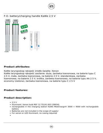 F.O. battery/charging handle KaWe 2,5 V Product attributes: KaWe laryngoskop rękojeść źródło światła: Xenon KaWe laryngoskop rękojeść zasilanie: duża, żarówka ksenonowa, na baterie typu C 2.5 V, mała, żarówka ksenonowa, na baterie 2.5 V, standardowa, żarówka ksenonowa, na baterie 2.5 V, krótka, żarówka ksenonowa, na baterie typu AA 2.5 V, economy (zielona), żarówka ksenonowa, na baterie typu C 2.5 V Product features: Product description: 2.5 V Illuminant: Xenon bulb REF 12.75141.003 (28934) rechargeable in the charging station KaWe MedCharge® 3000 + 4000 with rechargeable battery Batteries are not included in the scope of supply! For xenon or LED illuminant, no casing required Powered by TCPDF (www.tcpdf.org)