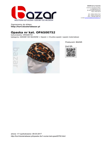 BAZAR Jerzy Szymala Centrum Handlowe EACC ul. Nadrzeczna 7A 05-552 Wólka Kosowska hala 1 AB, box B tel. +48 22 701 37 27 fax. +48 22 751 64 70 kom. +48 602 260 233 e-mail:[email protected] Zapraszamy do sklepu http://hurt.bizuteriabazar.pl Opaska nr kat. OPAS00752 kod produktu: OPAS00752 kategoria: OZDOBY DO WŁOSÓW > Opaski > Chustko-opaski i opaski materiałowe Producent: BAZAR Kod QR: strona: 1/1 wydrukowano: 09-03-2017 http://hurt.bizuteriabazar.pl/opaska-3w1-numer-kat-opas00752.html