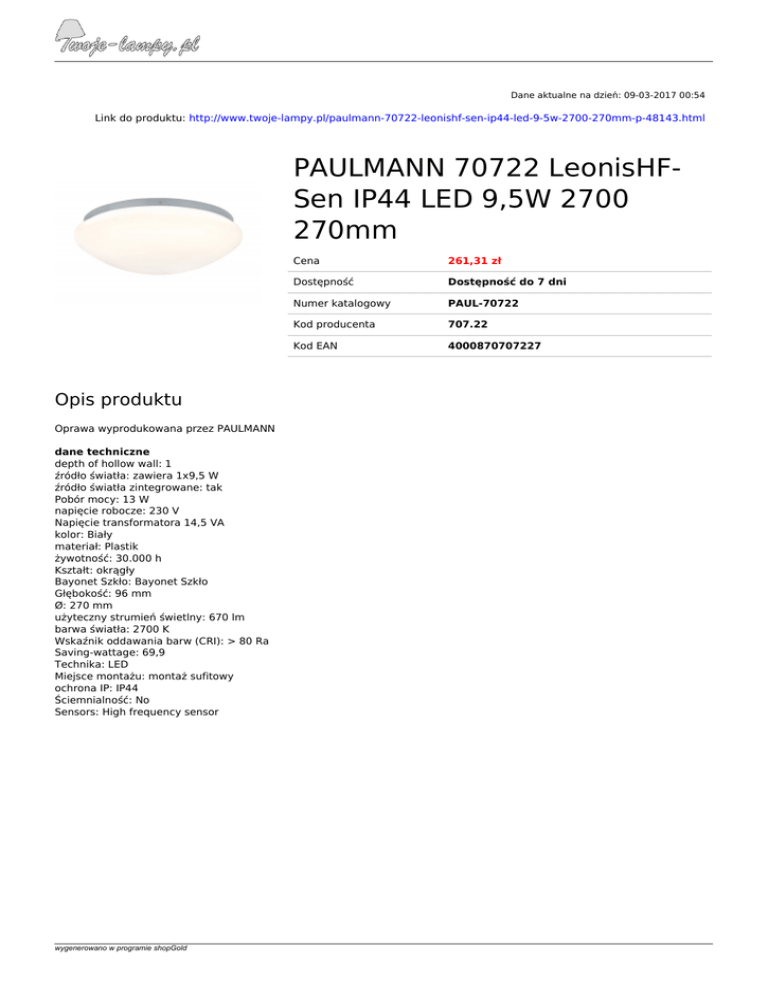 Dane aktualne na dzień: 09-03-2017 00:54 Link do produktu: http://www.twoje-lampy.pl/paulmann-70722-leonishf-sen-ip44-led-9-5w-2700-270mm-p-48143.html PAULMANN 70722 LeonisHFSen IP44 LED 9,5W 2700 270mm Opis produktu Oprawa wyprodukowana przez PAULMANN dane techniczne depth of hollow wall: 1 źródło światła: zawiera 1x9,5 W źródło światła zintegrowane: tak Pobór mocy: 13 W napięcie robocze: 230 V Napięcie transformatora 14,5 VA kolor: Biały materiał: Plastik żywotność: 30.000 h Kształt: okrągły Bayonet Szkło: Bayonet Szkło Głębokość: 96 mm Ø: 270 mm użyteczny strumień świetlny: 670 lm barwa światła: 2700 K Wskaźnik oddawania barw (CRI): > 80 Ra Saving-wattage: 69,9 Technika: LED Miejsce montażu: montaż sufitowy ochrona IP: IP44 Ściemnialność: No Sensors: High frequency sensor wygenerowano w programie shopGold Powered by TCPDF (www.tcpdf.org) Cena 261,31 zł Dostępność Dostępność do 7 dni Numer katalogowy PAUL-70722 Kod producenta 707.22 Kod EAN 4000870707227