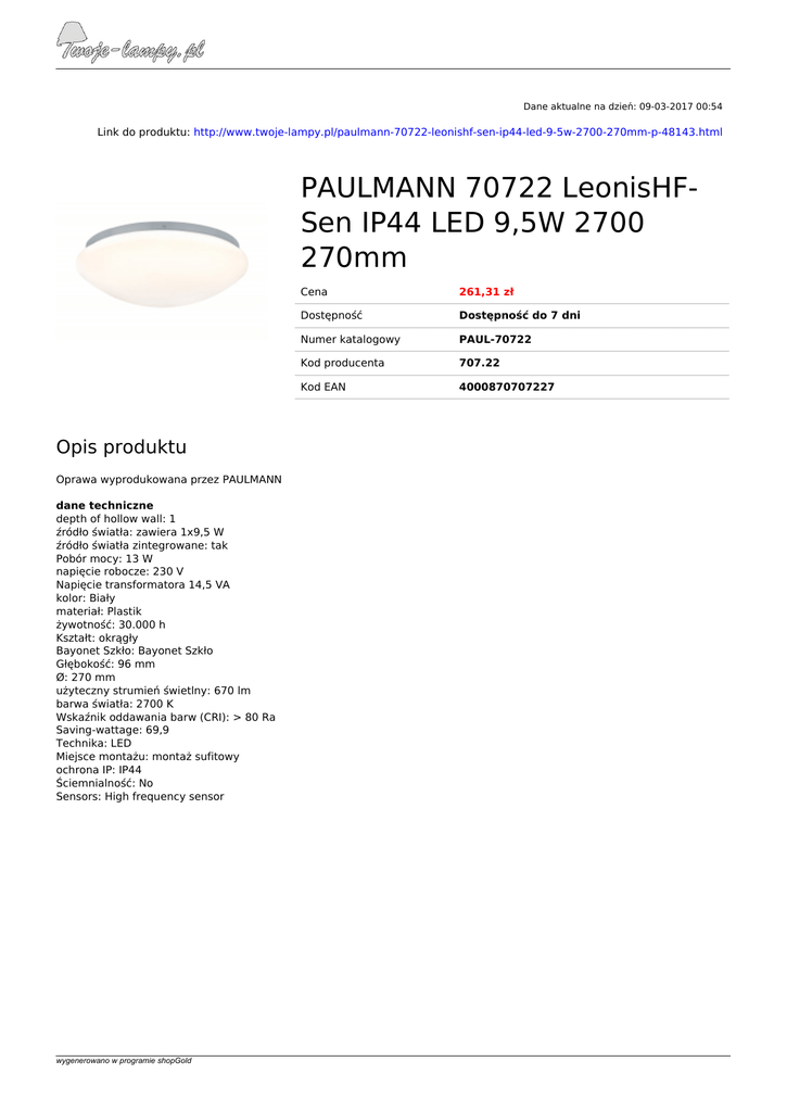 PAULMANN 70722 LeonisHF- Sen IP44 LED 9 - Twoje