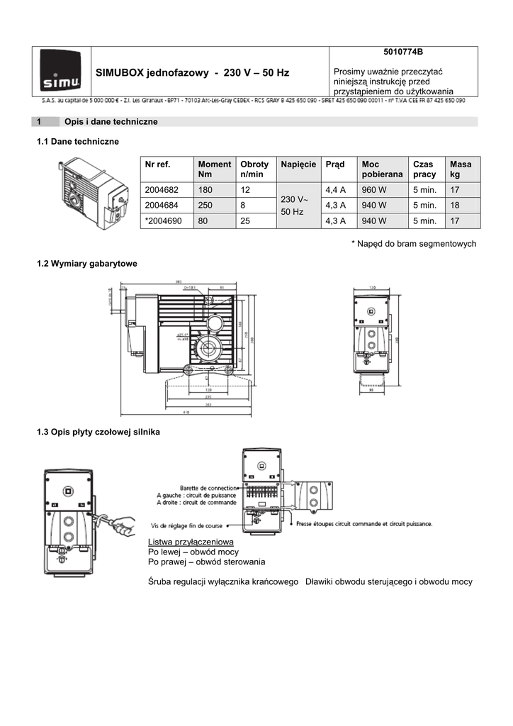 5010774B SIMUBOX jednofazowy - 230 V – 50 Hz 1 Prosimy uwaŜnie przeczytać niniejszą instrukcję przed przystąpieniem do uŜytkowania Opis i dane techniczne 1.1 Dane techniczne Nr ref. Moment Nm Obroty n/min 2004682 180 12 2004684 250 8 *2004690 80 25 Napięcie 230 V∼ 50 Hz Prąd Moc pobierana Czas pracy Masa kg 4,4 A 960 W 5 min. 17 4,3 A 940 W 5 min. 18 4,3 A 940 W 5 min. 17 * Napęd do bram segmentowych 1.2 Wymiary gabarytowe 1.3 Opis płyty czołowej silnika Listwa przyłączeniowa Po lewej – obwód mocy Po prawej – obwód sterowania Śruba regulacji wyłącznika krańcowego Dławiki obwodu sterującego i obwodu mocy 2 MontaŜ silnika 2.1 Przykład montaŜu Z trzpieniem mocującym • 1. Simubox • 2. Trzpień mocujący (nr ref. 9146521) • 3. Płyta od strony silnika • 4. Piasta z wpustem • 5. Piasta z wpustem • 6. Płyta po przeciwnej stronie • 7. Zabezpieczenie przed opadaniem (hamulec) 2.2 Manewrowanie w sytuacjach awaryjnych Uruchamianie awaryjne Z podstawą napędu i kątownikami • 1. Simubox • 2. Podstawa silnika (nr ref. 9146500) • 3. Kątownik (nr ref. 9146510) • 4. Piasta z wpustem • 5. Piasta z wpustem • 6. Kątownik (nr ref. 9146510) • 7. Zabezpieczenie przed opadaniem (hamulec) PołoŜenie silnika Korbką Pierścieniem Łańcuchem Dotyczy bram segmentowych • • • • 1. Simubox 2. Trzpień mocujący (nr ref. 9146521) 3. Kątownik + części złączne (nr ref. 9146587) 4. Pierścień oporowy ∅30 (nr ref. 9146583z) 2.3 MontaŜ układu uruchamiania awaryjnego łańcuchem 1. Zdemontować pokrywę prowadnicy łańcucha odkręcając cztery wkręty. 2. Zamontować prowadnicę łańcucha (nr ref. 9550114) oraz łańcuch (nr ref. 6146501) Poprowadzić ogniwa w prowadnicy łańcucha i po kole łańcuchowym wprowadzając je we wręby. 3. 3 4. Zamontować pokrywę. Połączenia Wyłącznik powinien być zgodny z załącznikiem H normy EN 60335-1. Wyłącznik powinien być usytuowany bezpośrednio naprzeciwko napędzanej części i oddalony od części ruchomych. Ruch pancerza powinien być inicjowany wyłącznie za pomocą sterowania (przycisków itp.) wymagającego podtrzymania, z wyłącznikiem bez blokady, powracającym automatycznie do połoŜenia zatrzymania, gdy tylko zwolniony zostanie jego element wykonawczy. Przykład schematu połączeń Dławik przewodu zasilania znajduje się wewnątrz pokrywy złącza. 230 V ∼ – 50 Hz Niebieski Brązowy Czarny Zielony/Ŝółty Neutralny Podnoszenie Opuszczenie Ziemia Styki dodatkowe: od strony napędu do podłączenia ewentualnie do wskaźnika, syren itp. − Styk „S1” (styk normalnie otwarty) − Styk „C” − Styk „S2” 4 Regulacja końca skoku Usytuować wkręt kontrolujący kierunek obrotów „podnoszenia” i ten, który kontroluje kierunek opuszczania; kierunek 1 albo kierunek 2. Strzałki umieszczone wokół wałka drąŜonego równieŜ wskazują kierunek obrotów. JeŜeli silnik nie obraca się w Ŝądanym kierunku, zamienić połączenia S1 i S2. Kiedy silnik zatrzyma się po wysterowaniu, wcisnąć wkrętakiem wkręt regulacyjny odpowiadający wybranemu kierunkowi (1 albo 2). - aby zwiększyć skok: wcisnąć i obrócić wkręt w kierunku „+” - aby zmniejszyć skok: wcisnąć i obrócić wkręt w kierunku „-” W ten sam sposób reguluje się koniec skoku silnika w połoŜeniu górnym i dolnym. JeŜeli połoŜenie regulacji końca skoku (górne lub dolne) zostanie przekroczone, załącza się wówczas zestyk bezpieczeństwa (blokada działania w obydwu kierunkach. Wykonać kilka obrotów silnika wstecz za pomocą korbki aby znów zaczął reagować na sterowanie. 5 Konserwacja SIMUBOX zaprojektowano z największą starannością i nie wymaga on Ŝadnych szczególnej konserwacji. NaleŜy jednak zamontować go w miejscu chronionym przed rozbryzgami wody. Zespół jest nasmarowany fabrycznie i nie wymaga smarowania. Nie naleŜy wymieniać specjalnego smaru. DemontaŜ pokrywy obudowy powoduje utratę gwarancji (8 śrub pokrywy zabezpieczono plombami). W przypadku napędu elementów innych niŜ kraty i rolety zwijane prosimy konsultować się z firmą. Pamiętać o nasmarowaniu wałka wpustowego szpuli przed zamontowaniem silnika.