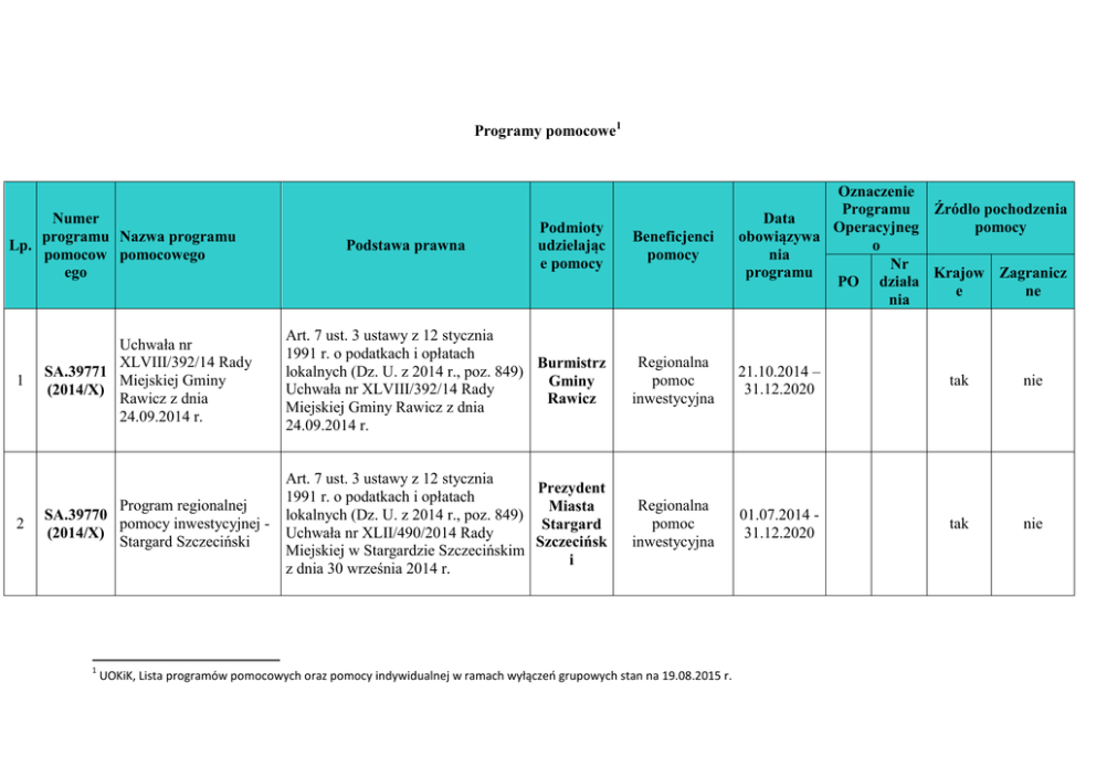 Programy pomocowe1 Podmioty udzielając e pomocy Beneficjenci pomocy Oznaczenie Programu Źródło pochodzenia Data Operacyjneg pomocy obowiązywa o nia Nr programu Krajow Zagranicz PO działa e ne nia Uchwała nr XLVIII/392/14 Rady SA.39771 Miejskiej Gminy (2014/X) Rawicz z dnia 24.09.2014 r. Art. 7 ust. 3 ustawy z 12 stycznia 1991 r. o podatkach i opłatach Burmistrz lokalnych (Dz. U. z 2014 r., poz. 849) Gminy Uchwała nr XLVIII/392/14 Rady Rawicz Miejskiej Gminy Rawicz z dnia 24.09.2014 r. Regionalna pomoc inwestycyjna 21.10.2014 – 31.12.2020 tak nie Program regionalnej SA.39770 pomocy inwestycyjnej (2014/X) Stargard Szczeciński Art. 7 ust. 3 ustawy z 12 stycznia Prezydent 1991 r. o podatkach i opłatach Miasta lokalnych (Dz. U. z 2014 r., poz. 849) Stargard Uchwała nr XLII/490/2014 Rady Szczecińsk Miejskiej w Stargardzie Szczecińskim i z dnia 30 września 2014 r. Regionalna pomoc inwestycyjna 01.07.2014 31.12.2020 tak nie Numer programu Nazwa programu Lp. pomocow pomocowego ego 1 2 1 Podstawa prawna UOKiK, Lista programów pomocowych oraz pomocy indywidualnej w ramach wyłączeń grupowych stan na 19.08.2015 r. 3 4 SA.40338 (2014/X) SA.40339 (2014/X) Uchwała nr LXIV/1640/14 Rady Miejskiej Wrocławia z dnia 16 października 2014 r. w sprawie zwolnień od podatku od nieruchomości w ramach regionalnej pomocy inwestycyjnej dla przedsiębiorców tworzących nowe miejsca pracy związane z nowymi inwestycjami na terenie Wrocławia Uchwała nr LXIV/1639/14 Rady Miejskiej Wrocławia z dnia 16 października 2014 r. w sprawie zwolnień z podatku od nieruchomości na wspieranie nowych inwestycji w ramach regionalnej pomocy inwestycyjnej przeznaczonych dla małych, średnich i dużych przedsiębiorstw prowadzących działalność gospodarczą na terenie Wrocławia Ustawa z dnia 12 stycznia 1991 r. o podatkach i opłatach lokalnych (Dz. U. z 2014 r. poz. 849) Uchwała nr LXIV/1640/14 Rady Miejskiej Wrocławia z dnia 16 października 2014 r. w sprawie zwolnień od podatku od nieruchomości w ramach regionalnej pomocy inwestycyjnej dla przedsiębiorców tworzących nowe miejsca pracy związane z nowymi inwestycjami na terenie Wrocławia Prezydent Wrocławia Regionalna pomoc inwestycyjna 10.11.2014 31.12.2020 tak nie Ustawa z dnia 12 stycznia 1991 r. o podatkach i opłatach lokalnych (Dz. U. z 2014 r. poz. 849) Uchwała nr LXIV/1639/14 Rady Miejskiej Wrocławia z dnia 16 października 2014 r. w sprawie zwolnień z podatku od nieruchomości Prezydent na wspieranie nowych inwestycji w Wrocławia ramach regionalnej pomocy inwestycyjnej przeznaczonych dla małych, średnich i dużych przedsiębiorstw prowadzących działalność gospodarczą na terenie Wrocławia Regionalna pomoc inwestycyjna 11.11.201431.12.2020 tak nie 5 Uchwała nr LXIV/1641/14 Rady Miejskiej Wrocławia z dnia 16 października 2014 r. w sprawie zwolnień od podatku od nieruchomości na wspieranie nowych inwestycji w ramach SA.40340 regionalnej pomocy (2014/X) inwestycyjnej dla przedsiębiorców prowadzących działalność gospodarczą w obrębie parków przemysłowych, parków technologicznych oraz specjalnych stref usytuowanych na terenie Wrocławia 6 Art. 32 ust. 3 ustawy z dnia 27 sierpnia 1997 r. o rehabilitacji Pomoc finansowa zawodowej i społecznej oraz udzielana pracodawcom zatrudnianiu osób niepełnosprawnych SA.40693 prowadzącym zakłady (Dz. U. z 2011 r. Nr 127, poz. 721, z (2015/X) pracy chronionej ze późn. zm) (zmiana środków Państwowego Rozporządzenie Ministra Pracy i X812/200 Funduszu Rehabilitacji Polityki Społecznej z dnia 23 grudnia 9) Osób 2014 r. w sprawie pomocy finansowej Niepełnosprawnych udzielanej pracodawcom prowadzącycm zakłady pracy chronionej ze środków Państwowego Ustawa z dnia 12 stycznia 1991 r. o podatkach i opłatach lokalnych (Dz. U. z 2014 r. poz. 849) Uchwała nr LXIV/1641/14 Rady Miejskiej Wrocławia z dnia 16 października 2014 r. w sprawie zwolnień od podatku od nieruchomości na wspieranie nowych Prezydent inwestycji w ramach regionalnej Wrocławia pomocy inwestycyjnej dla przedsiębiorców prowadzących działalność gospodarczą w obrębie parków przemysłowych, parków technologicznych oraz specjalnych stref usytuowanych na terenie Wrocławia Państwow y Fundusz Rehabilita cji Osób Niepełnosp rawnych Regionalna pomoc inwestycyjna 10.11.201431.12.2020 tak nie Pomoc na rekompensatę dodatkowych kosztów 01.01.2015związanych z 30.06.2021 zatrudnieniem pracowników niepełnosprawny ch tak nie Funduszu Rehabilitacji Osób Niepełnosprawnych (Dz. U. poz. 1975) 7 8 SA.40694 (2015/X) (zmiana X678/200 9) SA.40518( 2015/X) (zastąpił SA.38139( 2014/X)) Art. 26 ust. 9 ustawy z dnia 27 sierpnia 1997 r. o rehabilitacji zawodowej i społecznej oraz zatrudnianiu osób niepełnosprawnych Zwrot dodatkowych (Dz. U. z 2011 r. Nr 127, poz. 721, z kosztów związanych z późn. zm) zatrudnianiem Rozporządzenie Ministra Pracy i pracowników Polityki Społecznej z dnia 23 grudnia niepełnosprawnych 2014 r. w sprawie zwrotu dodatkowych kosztówzwiązanych z zatrudnianiem pracowników niepełnosprawnych (Dz. U. poz. 1987) Art. 6b ust. 10 ustawy z dnia 9 listopada 2000 r. o utworzeniu Pomoc finansowa Polskiej Agencji Rozwoju udzielana przez Polską Przedsiębiorczości (Dz. U. z 2014 r. Agencję Rozwoju poz. 1804) Przedsiębiorczości na Rozporządzenie Ministra Rozwoju wspieranie ośrodków Regionalnego z dnia 8 grudnia 2014 r. innowacyjności w w sprawie udzielania przez Polską ramach Programu Agencję Rozwoju Przedsiębiorczości Operacyjnego pomocy finansowej na wspieranie Innowacyjna ośrodków innowacyjności w ramach Gospodarka, 2007-2013 Programu Operacyjnego Innowacyjna Gospodarka, 2007-2013 (Dz. U. poz. 1869) Pomoc na rekompensatę Starostowi dodatkowych e oraz kosztów 01.01.2015Prezydenci związanych z 30.06.2021 miast na zatrudnieniem prawach pracowników powiatu niepełnosprawny ch tak nie Ośrodki Innowacyj ności znajdujące Pomoc na usługi doradcze dla się na MŚP