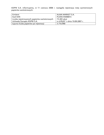 KDPW S.A. informujemy, iż 11 czerwca 2008 r. nastąpiła rejestracja niżej wymienionych papierów wartościowych: Emitent Kod ISIN Liczba rejestrowanych papierów wartościowych Uchwała Zarządu KDPW S.A. Łączna liczba papierów po rejestracji ALMA MARKET S.A. PLKRCHM00015 73.403 akcji nr 670/07 z dnia 19.09.2007 r. 3.716.990