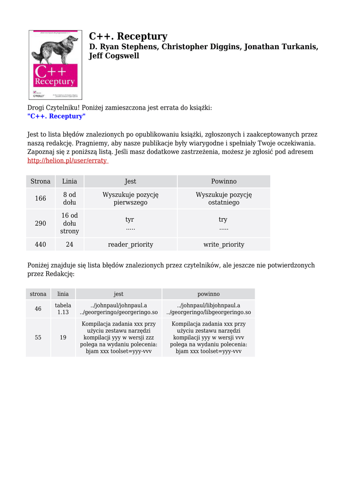 C++. Receptury D. Ryan Stephens, Christopher Diggins, Jonathan Turkanis, Jeff Cogswell Drogi Czytelniku! Poniżej zamieszczona jest errata do książki: "C++. Receptury" Jest to lista błędów znalezionych po opublikowaniu książki, zgłoszonych i zaakceptowanych przez naszą redakcję. Pragniemy, aby nasze publikacje były wiarygodne i spełniały Twoje oczekiwania. Zapoznaj się z poniższą listą. Jeśli masz dodatkowe zastrzeżenia, możesz je zgłosić pod adresem http://helion.pl/user/erraty Strona Linia Jest Powinno 166 8 od dołu Wyszukuje pozycję pierwszego Wyszukuje pozycję ostatniego 290 16 od dołu strony tyr ..... try ..... 440 24 reader_priority write_priority Poniżej znajduje się lista błędów znalezionych przez czytelników, ale jeszcze nie potwierdzonych przez Redakcję: strona linia jest powinno 46 tabela 1.13 ../johnpaul/johnpaul.a ../georgeringo/georgeringo.so ../johnpaul/libjohnpaul.a ../georgeringo/libgeorgeringo.so 19 Kompilacja zadania xxx przy użyciu zestawu narzędzi kompilacji yyy w wersji zzz polega na wydaniu polecenia: bjam xxx toolset=yyy-vvv Kompilacja zadania xxx przy użyciu zestawu narzędzi kompilacji yyy w wersji vvv polega na wydaniu polecenia: bjam xxx toolset=yyy-vvv 55
