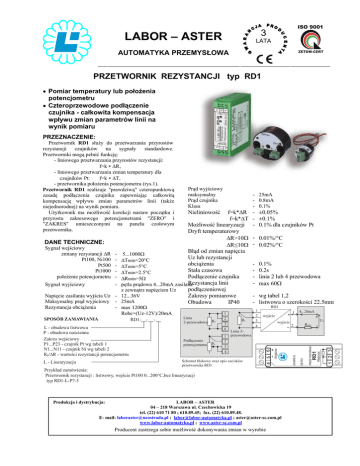 ISO 9001 3 LABOR – ASTER LATA AUTOMATYKA PRZEMYSŁOWA ZETOM-CERT PRZETWORNIK REZYSTANCJI typ RD1 • Pomiar temperatury lub położenia potencjometru • Czteroprzewodowe podłączenie czujnika - całkowita kompensacja wpływu zmian parametrów linii na wynik pomiaru PRZEZNACZENIE: RD1- - L - obudowa listwowa P - obudowa naścienna Zakres wejściowy P1...P23 - czujnik Pt wg tabeli 1 N1...N11 - czujnik Ni wg tabeli 2 Rp/∆R - wartości rezystancji potencjometru - Linia 2-przewodowa Podłączenie potencjometru Rx Px 1 2 3 4 Rx 0.1% 0.2s linia 2 lub 4 przewodowa max 60Ω - wg tabel 1,2 - listwowa o szerokości 22.5mm 1 2 3 4 RD1 1 wejście + wyjście Uz Wyjście Robc - 2 Linia 3przewodowa Schemat blokowy oraz opis zacisków przetwornika RD1 L - Linearyzacja 4...20mA Przykład zamówienia: Przetwornik rezystancji : listwowy, wejście Pt100 0...200°C,bez linearyzacji typ RD1-L-P7-3 Produkcja i dystrybucja: LABOR – ASTER 04 – 218 Warszawa ul. Czechowicka 19 tel. (22) 610 71 80 ; 610.89.45; fax. (22) 610.89.48. E- mail: [email protected] ; [email protected] ; [email protected] www.labor-automatyka.pl ; www.aster-sc.com.pl Producent zastrzega sobie możliwość dokonywania zmian w wyrobie RD1 SPOSÓB ZAMAWIANIA 1 2 3 4 - Wejście Napięcie zasilania wyjścia Uz Maksymalny prąd wyjściowy Rezystancja obciążenia - max 1200Ω Robc=(Uz-12V)/20mA - 0.01%/°C - 0.02%/°C PRZETWORNIK - - ±0.05% - ±0.1% - 0.1% dla czujników Pt ZERO Sygnał wyjściowy f=k*∆R f=k*∆T Możliwość linearyzacji Dryft temperaturowy ∆R>10Ω ∆R≤10Ω Błąd od zmian napięcia 5...1000Ω Uz lub rezystancji ∆Tmin=20°C obciążenia ∆Tmin=5°C Stała czasowa ∆Tmin=2.5°C Podłączenie czujnika ∆Rmin=5Ω Rezystancja linii pętla prądowa 4...20mA zasilana podłączeniowej z zewnątrz napięciem Uz 12...36V Zakresy pomiarowe 25mA Obudowa IP40 ZAKRES - Nieliniowość - Sygnał wejściowy zmiany rezystancji ∆R Pt100, Ni100 Pt500 Pt1000 położenie potencjometru - 25mA - 0.8mA - 0.1% Wyjście DANE TECHNICZNE: Prąd wyjściowy maksymalny Prąd czujnika Klasa + Przetwornik RD1 służy do przetwarzania przyrostów rezystancji czujników na sygnały standardowe. Przetworniki mogą pełnić funkcję: - liniowego przetwarzania przyrostów rezystancji: f=k ∗ ∆R, - liniowego przetwarzania zmian temperatury dla czujników Pt: f=k ∗ ∆T, - przetwornika położenia potencjometru (rys.1). Przetwornik RD1 realizuje "prawdziwą" czteropunktową zasadę podłączenia czujnika zapewniając całkowitą kompensację wpływu zmian parametrów linii (także niejednorodnej) na wynik pomiaru. Użytkownik ma możliwość korekcji nastaw początku i przyrostu zakresowego potencjometrami "ZERO" i "ZAKRES" umieszczonymi na panelu czołowym przetwornika.