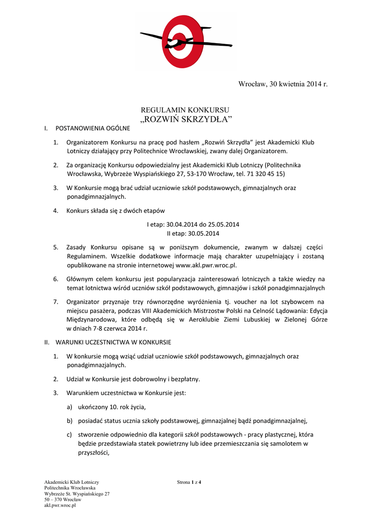 Wrocław, 30 kwietnia 2014 r. REGULAMIN KONKURSU „ROZWIŃ SKRZYDŁA” I. POSTANOWIENIA OGÓLNE 1. Organizatorem Konkursu na pracę pod hasłem „Rozwiń Skrzydła” jest Akademicki Klub Lotniczy działający przy Politechnice Wrocławskiej, zwany dalej Organizatorem. 2. Za organizację Konkursu odpowiedzialny jest Akademicki Klub Lotniczy (Politechnika Wrocławska, Wybrzeże Wyspiańskiego 27, 53-170 Wrocław, tel. 71 320 45 15) 3. W Konkursie mogą brać udział uczniowie szkół podstawowych, gimnazjalnych oraz ponadgimnazjalnych. 4. Konkurs składa się z dwóch etapów I etap: 30.04.2014 do 25.05.2014 II etap: 30.05.2014 5. Zasady Konkursu opisane są w poniższym dokumencie, zwanym w dalszej części Regulaminem. Wszelkie dodatkowe informacje mają charakter uzupełniający i zostaną opublikowane na stronie internetowej www.akl.pwr.wroc.pl. 6. Głównym celem konkursu jest popularyzacja zainteresowań lotniczych a także wiedzy na temat lotnictwa wśród uczniów szkół podstawowych, gimnazjów i szkół ponadgimnazjalnych 7. Organizator przyznaje trzy równorzędne wyróżnienia tj. voucher na lot szybowcem na miejscu pasażera, podczas VIII Akademickich Mistrzostw Polski na Celność Lądowania: Edycja Międzynarodowa, które odbędą się w Aeroklubie Ziemi Lubuskiej w Zielonej Górze w dniach 7-8 czerwca 2014 r. II. WARUNKI UCZESTNICTWA W KONKURSIE 1. W konkursie mogą wziąć udział uczniowie szkół podstawowych, gimnazjalnych oraz ponadgimnazjalnych. 2. Udział w Konkursie jest dobrowolny i bezpłatny. 3. Warunkiem uczestnictwa w Konkursie jest: a) ukończony 10. rok życia, b) posiadać status ucznia szkoły podstawowej, gimnazjalnej bądź ponadgimnazjalnej, c) stworzenie odpowiednio dla kategorii szkół podstawowych - pracy plastycznej, która będzie przedstawiała statek powietrzny lub idee przemieszczania się samolotem w przyszłości, Akademicki Klub Lotniczy Politechnika Wrocławska Wybrzeże St. Wyspiańskiego 27 50 – 370 Wrocław akl.pwr.wroc.pl Strona 1 z 4 d) dla szkół gimnazjalnych - modelu lub makiety, która pokaże jak może wyglądać statek powietrzny lub transport lotniczy w przyszłości, e) dla szkół ponadgimnazjalnych - projekt takiego statku powietrznego wykonany w jednym z dostępnych programów do wspomagania projektowania komputerowego (CAD) we wcześniej zgłoszonym Organizatorowi formacie pliku (przykłady programów możliwych do wykorzystania organizator zamieści na stronie akl.pwr.wroc.pl lub w postaci rysunku technicznego wykonanego ręcznie. f) Praca musi spełniać założenia Regulaminu i być wysłana Organizatorowi do dn. 25.05.2013 godz. 23.59 na adres: [email protected] lub [email protected] wraz z wypełnionym zgłoszeniem do konkursu, dostarczona do III Liceum Ogólnokształcącego im. prof. Tadeusza Kotarbińskiego, ul. Strzelecka 9, 65-452 Zielona Góra lub oddana swojemu nauczycielowi fizyki, który w danej szkole będzie koordynatorem konkursu. Wymaga jest również zgoda na przetwarzanie danych osobowych zgodnie z ustawą o ochronie danych osobowych (Dz.U.Nr 133 poz. 133) oraz w przypadku osób niepełnoletnich, skan podpisanej zgody prawnych opiekunów na lot szybowcem. g) samodzielne wykonanie pracy . 4. Każdy uczestnik może przygotować tylko jedną pracę. 5. Osoby, które zakwalifikują się do drugiego etapu są zobowiązane przekazać Organizatorowi oryginały zgód, o których mowa w pkt. 2 c) rozdział II, w dniu finału konkursu tj. 30.05.2014. 6. Podczas drugiego etapu Uczestnik zostaje zobowiązany do zaprezentowania swojej pracy przed Komisją Konkursową, która zostanie powołana właśnie w tym celu. 7. Zwycięzcą konkursu może zostać osoba, której praca konkursowa została zakwalifikowana do drugiego etapu konkursu, oraz została wybrana wśród prac zaprezentowanych przed Komisją. III. ZASADY KONKURSU 1. Prace konkursowe muszą być pracami własnymi, niebiorącymi wcześniej udziału w innych konkursach. 2. Konkurs składa się z dwóch etapów. Pierwszy etap polega na przygotowaniu pracy i przesłaniu jej (lub jej zdjęć w przypadku szkół gimnazjalnych) Organizatorowi. Drugi etap polega na zaprezentowaniu swojej prezentacji Komisji Konkursowej. Organizator wybierze 9 najlepszych prac(po 3 z każdej kategorii), które będą brały udział w drugim etapie. 3. Prace, które zostaną zakwalifikowane do drugiego etapu nie mogą być modyfikowane w żaden sposób. 4. Dziewiątka finalistów będzie zobligowana do przedstawienia Komisji swojej prezentacji. Każdy z uczestników finału będzie musiał zmieścić się w czasie 5 minut ze swoją prezentacją. Akademicki Klub Lotniczy Politechnika Wrocławska Wybrzeże St. Wyspiańskiego 27 50 – 370 Wrocław akl.pwr.wroc.pl Strona 2 z 4 5. Uczestnik drugiego etapu może wykorzystać własny komputer, pod warunkiem, że podłączenie do systemu audiowizualnego nie przekroczy 3 minut przeznaczonych na przygotowanie. 6. Uczestnicy drugiego etapu prezentują swoje prace pojedynczo. 7. Podczas drugiego etapu zostanie wyłoniona trójka zwycięzców, po jednym z każdej kategorii. 8. Rozstrzygnięcia Konkursu dokona Komisja Konkursowa powołana na tę okoliczność. 9. Decyzje podjęte przez Komisję są ostateczne. 10. Drugi etap Konkursu odbędzie się dnia 30 maja br., na terenie III Liceum Ogólnokształcącego im. prof. Tadeusza Kotarbińskiego przy ul. Strzeleckiej 9 w Zielonej Górze. Dokładne dane Organizator poda po rozstrzygnięciu pierwszego etapu Konkursu. 11. Wyniki pierwszego etapu zostaną umieszczone na stronie internetowej www.akl.pwr.wroc.pl, www.lo3.pl, a także zostaną przekazane drogą elektroniczną do szkół uczestników. Akademicki Klub Lotniczy Politechnika Wrocławska Wybrzeże St. Wyspiańskiego 27 50 – 370 Wrocław akl.pwr.wroc.pl Strona 3 z 4 IV. NAGRODY 1. Nagrodą w konkursie jest voucher na lot szybowcem jako pasażer podczas VIII Akademickich Mistrzostwach Polski na Celność Lądowania, dalej zwane Mistrzostw
