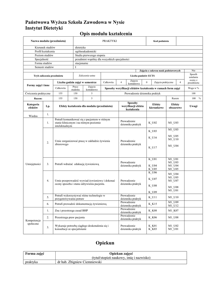 Państwowa WyŜsza Szkoła Zawodowa w Nysie Instytut Dietetyki Opis modułu kształcenia PRAKTYKI Nazwa modułu (przedmiotu) Kierunek studiów Profil kształcenia Poziom studiów Specjalność Forma studiów Semestr studiów Kod podmiotu dietetyka ogólnoakademicki Studia pierwszego stopnia przedmiot wspólny dla wszystkich specjalności stacjonarne I 4 Nie Sposób ustalania oceny z przedmiotu Zajęcia kontaktowe Sposoby weryfikacji efektów kształcenia w ramach form zajęć Waga w % Prowadzenie dziennika praktyk 100 Zajęcia z zakresu nauk podstawowych Zaliczenie ustne Tryb zaliczenia przedmiotu Liczba punktów ECTS Liczba godzin zajęć w semestrze Formy zajęć i inne Całkowita Pracy studenta Ćwiczenia praktyczne 155 150 5 Razem: 155 150 5 Kategoria efektów Wiedza Lp. Całkowita Efekty kształcenia dla modułu (przedmiotu) 4 Zajęcia kontaktowe Sposoby weryfikacji efektu kształcenia 0 Zajęcia praktyczne Razem 100 Efekty kierunkowe Efekty obszarowe Uwagi K_U02 M1_U03 1. 1. Potrafi komunikować się z pacjentem w róŜnym stanie klinicznym i na róŜnym poziomie intelektualnym Prowadzenie dziennika praktyk K_U03 K_U16 2. Umie zorganizować pracę w zakładzie Ŝywienia zbiorowego Prowadzenie dziennika praktyk K_U17 K_U01 Umiejętności 3. 4. Potrafi wdraŜać edukację Ŝywieniową Umie przeprowadzić wywiad Ŝywieniowy i dokonać oceny sposobu i stanu odŜywienia pacjenta. Prowadzenie dziennika praktyk Prowadzenie dziennika praktyk K_U04 K_U05 K_U06 K_U07 K_U08 K_U09 5. Potrafi wykorzystywać róŜne technologie w przygotowywaniu potraw 6. Potrafi prowadzić dokumentację Ŝywieniową 1. Zna i przestrzega zasad BHP 2. Przestrzega praw pacjenta 3. Wykazuje potrzebę ciągłego doskonalenia się i konsultacji ze specjalistami Kompetencje społeczne Prowadzenie dziennika praktyk Prowadzenie dziennika praktyk Prowadzenie dziennika praktyk Prowadzenie dziennika praktyk Prowadzenie dziennika praktyk praktyka M1_U05 M1_U10 M1_U04 M1_U01 M1_U03 M1_U04 M1_U05 M1_U04 M1_U05 M1_U07 M1_U08 M1_U01 K_U11 M1_U10 K_K15 M1_U09 M1_U12 K_K08 M1_K07 K_K06 M1_U08 K_K01 K_K03 M1_U02 M1_U01 Opiekun Forma zajęć M1_U03 Opiekun zajęcć (tytuł/stopień naukowy, imię i nazwisko) dr hab. Zbigniew Ciemniewski % RAMOWY HARMONOGRAM PRAKTYK Miejsce odbywania praktyk Wstępna praktyka w szpitalu. - w oddziale szpitalnym - kuchni ogólnej - dziale Ŝywienia L.p. TEMATYKA PRAKTYKI REALIZOWANEJ NA I SEMESTRZE STUDIÓW 1. PRZYJMOWANIE I REALIZACJA ZLECEŃ LEKARSKICH - umieć interpretować i realizować zlecenia lekarskie do stosowania diet indywidualnych 2. PROWADZENIE SYGNALIZACJI DIET I WSPÓŁPRACA Z KUCHNIĄ CENTRALNĄ - znać nomenklaturę diet i potrafić je wdroŜyć 3. EKSPEDYCJA POSIŁKÓW - wykazać się umiejętnością prawidłowego rozdysponowania posiłków - znać zasady i przepisy BHP związane z dystrybucją posiłków z kuchni centralnej do oddziałów szpitalnych 4. ROZDZIELANIE I PORCJOWANIE POTRAW - uczestniczyć w porcjowaniu i wydawaniu posiłków - wykazać się umiejętnością porcjowania 5. ORGANIZOWANIE PRACY W KUCHENCE ODDZIAŁOWEJ - omówić przepisy i wytyczne obowiązujące w kuchniach oddziałowych - znać zasady prawidłowego mycia naczyń stołowych - podejmować właściwe działania minimalizujące straty wartości odŜywczych 6. UTRZYMYWANIE NALEśYTEGO STANU HIGIENICZNO – SANITARNEGO KUCHENKI ODDZIAŁOWEJ - dbać o stan higieniczno - sanitarny pomieszczenia 7. KARMIENIE I DOPAJANIE PACJENTÓW - karmić i dopajać pacjentów leŜących - wykazywać się wyrozumiałością, cierpliwością i empatią w relacjach z pacjentem 8. UCZESTNICTWO W WIZYTACH LEKARSKICH - gromadzić informacje dotyczące zaleceń dietetycznych Czas trwania praktyki 150godz. (4 tyg.) ………………………………… Koordynator modułu (przedmiotu) podpis .......................................... Dyrektor Instytutu pieczęć i podpis