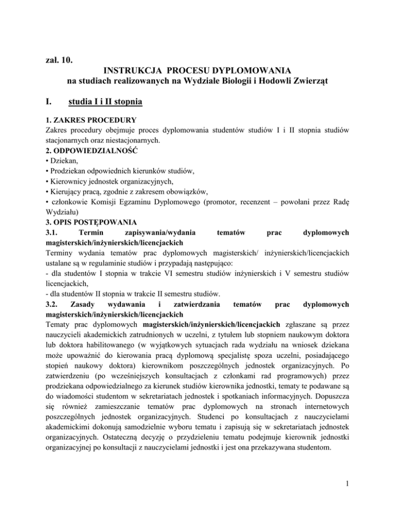 zał. 10. INSTRUKCJA PROCESU DYPLOMOWANIA na studiach realizowanych na Wydziale Biologii i Hodowli Zwierząt I. studia I i II stopnia 1. ZAKRES PROCEDURY Zakres procedury obejmuje proces dyplomowania studentów studiów I i II stopnia studiów stacjonarnych oraz niestacjonarnych. 2. ODPOWIEDZIALNOŚĆ • Dziekan, • Prodziekan odpowiednich kierunków studiów, • Kierownicy jednostek organizacyjnych, • Kierujący pracą, zgodnie z zakresem obowiązków, • członkowie Komisji Egzaminu Dyplomowego (promotor, recenzent – powołani przez Radę Wydziału) 3. OPIS POSTĘPOWANIA 3.1. Termin zapisywania/wydania tematów prac dyplomowych magisterskich/inżynierskich/licencjackich Terminy wydania tematów prac dyplomowych magisterskich/ inżynierskich/licencjackich ustalane są w regulaminie studiów i przypadają następująco: - dla studentów I stopnia w trakcie VI semestru studiów inżynierskich i V semestru studiów licencjackich, - dla studentów II stopnia w trakcie II semestru studiów. 3.2. Zasady wydawania i zatwierdzania tematów prac dyplomowych magisterskich/inżynierskich/licencjackich Tematy prac dyplomowych magisterskich/inżynierskich/licencjackich zgłaszane są przez nauczycieli akademickich zatrudnionych w uczelni, z tytułem lub stopniem naukowym doktora lub doktora habilitowanego (w wyjątkowych sytuacjach rada wydziału na wniosek dziekana może upoważnić do kierowania pracą dyplomową specjalistę spoza uczelni, posiadającego stopień naukowy doktora) kierownikom poszczególnych jednostek organizacyjnych. Po zatwierdzeniu (po wcześniejszych konsultacjach z członkami rad programowych) przez prodziekana odpowiedzialnego za kierunek studiów kierownika jednostki, tematy te podawane są do wiadomości studentom w sekretariatach jednostek i spotkaniach informacyjnych. Dopuszcza się również zamieszczanie tematów prac dyplomowych na stronach internetowych poszczególnych jednostek organizacyjnych. Studenci po konsultacjach z nauczycielami akademickimi dokonują samodzielnie wyboru tematu i zapisują się w sekretariatach jednostek organizacyjnych. Ostateczną decyzję o przydzieleniu tematu podejmuje kierownik jednostki organizacyjnej po konsultacji z nauczycielami jednostki i jest ona przekazywana studentom. 1 3.3. Wykonywanie pracy dyplomowej magisterskiej/inżynierskiej/licencjackiej 3.3.1. Obowiązki kierującego pracą dyplomową magisterską/inżynierską/licencjacką Wykonanie pracy dyplomowej nadzorowane jest przez kierującego pracą - promotora. Do obowiązków promotora należą: • konsultacje merytoryczne w trakcie przygotowania przeglądu piśmiennictwa, • przeszkolenie pod kątem bezpieczeństwa i higieny pracy, • nadzór i bieżące konsultacje przy wykonywaniu części eksperymentalnej pracy (jeśli wymagana), • wsparcie merytoryczne podczas analizy wyników i redagowaniu pracy pisemnej, • opracowanie pisemnej oceny pracy dyplomowej (formularz zamieszczony w wirtualnym dziekanacie), • odniesienie się do Raportu Systemu Antyplagiatowego (obowiązuje od 01.10.2015 r. – wg wzoru opracowanego przez Prorektora ds. Studenckich i Dydaktyki, • uczestnictwo w egzaminie dyplomowym. Promotor może wyznaczyć opiekuna (konsultanta) pracy dyplomowej, który przejmuje część jego obowiązków. 3.3.2. Obowiązki wykonującego pracę Student – dyplomant wykonujący pracę dyplomową magisterską/inżynierską/licencjacką jest zobowiązany do: • obecności na zajęciach przewidzianych w ramach programu studiów, związanych z realizacją pracy dyplomowej, • opracowania przeglądu piśmiennictwa dotyczącego realizowanych problemów badawczych, • konsultacji merytorycznych z kierującym pracą w trakcie przygotowania pracy, • przestrzegania zasad bezpieczeństwa i higieny pracy, • wykonania części eksperymentalnej pracy (jeżeli jest przewidziana) i interpretacji wyników, • samodzielnego napisania manuskryptu pracy dyplomowej zgodnie z wymogami redakcyjnymi zamieszczonymi na stronie Wydziału http://www.up.lublin.pl/2345/ • zamieszczenie w pracy dyplomowej stosownych oświadczeń (wg wzoru http://www.up.lublin.pl/2345/) • przystąpienia do egzaminu dyplomowego. 3.3.3. Przyjmowanie pracy dyplomowej magisterskiej/inżynierskiej/licencjackiej i wystawianie oceny końcowej Po uzyskaniu akceptacji manuskryptu student przygotowuje jego ostateczną wersję wraz ze tytułową stroną przygotowaną według aktualnego wzoru zamieszczonego na stronie Wydziału http://www.up.lublin.pl/2345/ i składa ją promotorowi do oceny. Promotor pracy dyplomowej wystawia ocenę końcową biorąc pod uwagę elementy zamieszczone w formularzu oceny pracy dyplomowej opiekuna naukowego (formularz zamieszczony w 2 wirtualnym dziekanacie). Do oceny pracy wyznaczany jest recenzent, powoływany przez Radę Wydziału na wniosek Promotora, przy czym w uzasadnionych przypadkach recenzent może zostać wskazany przez Dziekana Wydziału. Recenzenci uwzględniają w swojej ocenie elementy zawarte w formularzu recenzji pracy dyplomowej (formularz zamieszczony w wirtualnym dziekanacie) i składają go przed egzaminem dyplomowym w dziekanacie. W uzasadnionych przypadkach, za zgodą Dziekana, możliwa jest zmiana promotora lub tematu pracy dyplomowej. Na wniosek Dziekana Wydziałowa komisja sprawdza losowo wybrane prace dyplomowe pod względem zgodności tematyki pracy z kierunkiem i specjalnością studiów, poprawności układu pracy, doboru recenzentów oraz poprawności wykonanych recenzji. 3.5. Tryb i zakres składania dokumentów do egzaminu dyplomowego Student może przystąpić do egzaminu dyplomowego po udokumentowanym zaliczeniu wszystkich semestrów oraz uzyskaniu pozytywnej opinii i recenzji pracy dyplomowej magisterskiej/inżynierskiej/licencjackiej. Odpowiednio wcześniej dyplomant pobiera z Dziekanatu: • kartę obiegową, formularz opłaty za druk dyplomu, • wniosek o dopuszczenie do obrony pracy dyplomowej w przypadku gdy wcześniej był skre