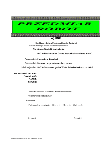 wg KNR Klasyfikacja robót wg Wspólnego Słownika Zamówie 45112723-9 Roboty w zakresie kształtowania placów zabaw Dla: Gmina Warta Bolesławiecka. 59-720 Raciborowice Górne; Warta Bolesławiecka nr 40C. Rodzaj robót: Plac zabaw dla dzieci. Zakres robót: Budowa i wyposa enie placu zabaw. Lokalizacja robót: 59-720 Szczytnica gmina Warta Bolesławiecka dz. nr 160/2. Warto robót bez VAT: Podatek VAT: RAZEM: Słownie: Podstawa : Zlecenie Wójta Gminy Warta Bolesławiecka. Przedmiar : Projekt budowlany. Poziom cen : Podstawa: R-g = ... zł/godz. Sporz dził: System kosztorysowania Strix wer. 4.15 (c) Athenasoft Sp. z o.o. KO = ... % KZ = ... % Zysk = ... % Sprawdził: Przedmiar/obmiar robót Lp 1. 1. 1. 1. 1. 1. 1. 1. 2. Normatyw Opis Suma Obiekt: Zagospodarowanie placu zabaw Szczytnica. Opis: Kod CPV 45112723-9 Element: Roboty ziemne i powierzchniowe. Opis: Kod CPV 45111200-0 KNR 02-01-0121-0200 Roboty pomiarowe przy powierzchniowych robotach ziemnych - koryta pod nawierzchnie placów postojowych 236.80/10000 KNR 02-31-0101-0500 Jm. ha Razem: R czne wykonanie koryta na całej szeroko ci jezdni i chodników w gruncie kat. I-II gł boko ci 20 cm 236.80 0.02 0.02 236.80 Jm. m2 Razem: Podbudowa z kruszywa łamanego - warstwa dolna o grub.po zag szcz. 15 cm 236.80 236.80 KNR 02-31-0114-0500 KNR 02-31-0402-0300 Jm. m2 Ława pod obrze a betonowa zwykła (63.10+27.69)*0.15*0.10 236.80 1. 1. 4. 1. 1. 5. KNR 02-31-0407-0100 Jm. m3 Razem: Obrze a betonowe o wymiarach 20x8 cm na podsypce piaskowej z wypełnieniem spoin zapraw cementow 63.10+27.69 Jm. m Razem: Chodniki z kostki betonowej grubo ci 60 mm typu 40 na podsypce piaskowej grubo ci 50 mm z wypełnieniem spoin piaskiem 22.80 90.79 KNR 00-11-0320-0100 Jm. m2 22.80 1. 1. 3. 1. 1. 6. 1. 2. 1. 2. 1. Razem: 236.80 1.36 Razem: 1.36 90.79 22.80 Element: Strefy bezpieczne urz dze . Opis: Kod CPV 45233260-9 ANALIZA WŁASNA Nawierzchnia placu zabaw syntetyczna poliuretanowa grub. 85 mm. Nawierzchnia o kolorze czerwonym. Warstwa dolna z granulatu SBR o grubo ci 70 mm, warstwa wierzchnia z granulatu EPDM o gr. 15 mm. 214.00 214.00 UWAGI: kalk. własna Jm. m2 1. 3. 1. 3. 1. Razem: 214.00 Element: Ogrodzenie placu zabaw. Opis: Kod CPV 45342000-6 KNR-W 02-02-1804-1100 Ogrodzenie panelowe systemowe, wysoko ci 1,5 m, na słupkach systemowych z profili 60x40 montowanych w stopach no nych prefabrykowanych 63.10 63.10 UWAGI: analogia 1. 3. 2. KNR 02-02-1808-050 Jm. m Razem: Furtki wysoko ci 1.5 m systmowe, w takim systemie jak ogrodzenie, i szeroko ci 1,2 m. 1 Jm. kpl. System kosztorysowania Strix wer. 4.15 (c) Athenasoft Sp. z o.o. Razem: 63.10 1.00 1.00 Przedmiar/obmiar robót Lp 1. 4. 1. 4. 1. 1. 4. 2. 1. 4. 3. 1. 4. 4. Normatyw Opis Suma Element: Dostawa i monta urz dze Placu zabaw Opis: Kod CPV 45112723-9 ANALIZA WŁASNA Monta gotowych ławek parkowych 2.00 Razem: 2.00 2.00 ANALIZA WŁASNA Jm. szt. Monta gotowych koszy na mieci. 1.00 Razem: 1.00 1.00 ANALIZA WŁASNA Jm. szt. Monta Tablicy informacyjnej 1.00 Razem: 1.00 1.00 ANALIZA WŁASNA Jm. szt. Monta urz dze placu zabaw 6.00 Jm. szt. Razem: 6.00 6.00 System kosztorysowania Strix wer. 4.15 (c) Athenasoft Sp. z o.o. Kosztorys lepy Lp Normatyw Nazwa nakładu Jm Opis Norma Wsp. Ilo Obiekt 1. Zagospodarowanie placu zabaw Szczytnica. Opis: Kod CPV 45112723-9 mn. R = 1.00 mn. M = 1.00 mn. S = 1.00 Element 1. 1. Roboty ziemne i powierzchniowe. Opis: Kod CPV 45111200-0 Obmiar = 236.80 m2 1. 1. 1. mn. R = 1.00 mn. M = 1.00 mn. S = 1.00 Roboty pomiarowe przy powierzchniowych robotach ziemnych - koryta pod KNR nawierzchnie placów postojowych 02-01-0121-0200 Obmiar = 0.02 ha mn. R = 1.00 mn. M = 1.00 mn. S = 1.00 Jm. r-g 55.19900 1.00 1.10 Słupki drewniane iglaste r.70mm Jm. m3 0.04000 1.00 0.00 Słupki drewniane iglaste r.120mm Jm. m3 0.16000 1.00 0.00 Drut stalowy okr gły mi kki r. 0.5mm Jm. kg 18.00000 1.00 0.36 Jm. m-g 2.30000 1.00 R czne wykonanie koryta na całej szeroko ci jezdni i chodników w gruncie kat. I-II gł boko ci 20 cm Obmiar = 236.80 m2 0.05 Robocizna razem Samochód dostawczy 0.9 t 1. 1. 2. KNR 02-31-0101-0500 Robocizna razem Walec samojezdny wibracyjny 7.5 t 1. 1. 3. KNR 02-31-0114-0500 Robocizna razem mn. R = 1.00 mn. M = 1.00 mn. S = 1.00 Jm. r-g 1.00 62.28 Jm. m-g 0.00940 1.00 Podbudowa z kruszywa łamanego - warstwa dolna o grub.po zag szcz. 15 cm Obmiar = 236.80 m2 2.23 mn. R = 1.00 mn. M = 1.00 mn. S = 1.00 Jm. r-g Woda Tłucze kamienny niesortowany Materiały pomocnicze Walec statyczny samojezdny 10 t 0.26300 0.03330 1.00 Jm. m3 0.01500 1.00 3.55 Jm. t 0.31820 1.00 75.35 Jm. % 0.50000 1.00 0.50 Jm. m-g 0.03870 1.00 9.16 0.00270 1.00 0.64 Jm. m-g Równiarka samojezdna 74 kW (100 KM) Ława pod kraw niki i obrze a betonowa zwykła 1. 1. 4. KNR 02-31-0402-0300 Obmiar = 1.36 m3 mn. R = 1.00 mn. M = 1.00 mn. S = 1.00 Jm. r-g 7.89 9.88000 1.00 13.44 Beton zwykły B-15 (C12/15) Jm. m3 1.04000 1.00 1.41 Woda Jm. m3 0.47000 1.00 0.64 Piasek zwykły Jm. m3 0.34000 1.00 0.46 Deski iglaste obrzynane gr. 25 mm kl. III Jm. m3 0.03000 1.00 0.04 1.00 0.50 0.20840 1.00 18.92 Robocizna razem Materiały pomocnicze 1. 1. 5. KNR 02-31-0407-0100 Robocizna razem Jm. % 0.50000 Obrze a betonowe o wymiarach 20x8 cm na podsypce piaskowej z wypełnieniem spoin zapraw cementow Obmiar = 90.79 m mn. R = 1.00 mn. M = 1.00 mn. S = 1.00 Jm. r-g Woda Jm. m3 0.00040 1.00 0.04 Piasek Jm. m3 0.00470 1.00 0.43 Cement portl,zwykły b.dod. CEM I 32,5-work Jm. t 0.00010 1.00 0.01 Obrze a betonowe 20x8 cm Jm. m 1.02000 1.00 92.61 1.00 0.50 Materiały pomocnicze 1. 1. 6. KNR 00-11-0320-0100 Jm. % 0.50000 Chodniki z kostki betonowej grubo ci 60 mm typu 40 na podsypce piaskowej grubo ci 50 mm z wypełnieniem spoin piaskiem Obmiar = 22.80 m2 System kosztorysowania Strix wer. 4.15 (c) Athenasoft Sp. z o.o. Kosztorys lepy Lp Normatyw Nazwa nakładu Jm mn. R = 1.00 mn. M = 1.00 mn. S = 1.00 Jm. r-g Opis Norma Wsp. Ilo 0.83940 1.00 19.14 Woda Jm. m3 0.02300 1.00 0.52 Piasek Jm. m3 0.06180 1.00 1.41 Tarcza diamentowa do ci cia kamien