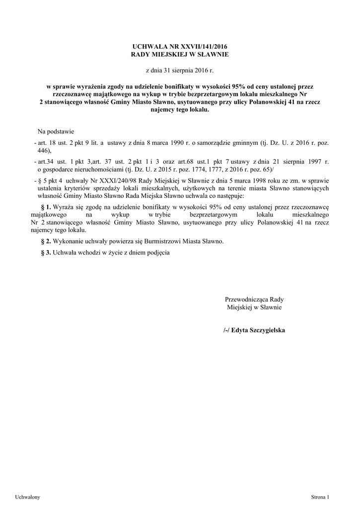 UCHWAŁA NR XXVII/141/2016 RADY MIEJSKIEJ W SŁAWNIE z dnia 31 sierpnia 2016 r. w sprawie wyrażenia zgody na udzielenie bonifikaty w wysokości 95% od ceny ustalonej przez rzeczoznawcę majątkowego na wykup w trybie bezprzetargowym lokalu mieszkalnego Nr 2 stanowiącego własność Gminy Miasto Sławno, usytuowanego przy ulicy Polanowskiej 41 na rzecz najemcy tego lokalu. Na podstawie - art. 18 ust. 2 pkt 9 lit. a ustawy z dnia 8 marca 1990 r. o samorządzie gminnym (tj. Dz. U. z 2016 r. poz. 446), - art.34 ust. 1 pkt 3,art. 37 ust. 2 pkt 1 i 3 oraz art.68 ust.1 pkt 7 ustawy z dnia 21 sierpnia 1997 r. o gospodarce nieruchomościami (tj. Dz. U. z 2015 r. poz. 1774, 1777, z 2016 r. poz. 65)/ - § 5 pkt 4 uchwały Nr XXXI/240/98 Rady Miejskiej w Sławnie z dnia 5 marca 1998 roku ze zm. w sprawie ustalenia kryteriów sprzedaży lokali mieszkalnych, użytkowych na terenie miasta Sławno stanowiących własność Gminy Miasto Sławno Rada Miejska Sławno uchwala co następuje: § 1. Wyraża się zgodę na udzielenie bonifikaty w wysokości 95% od ceny ustalonej przez rzeczoznawcę majątkowego na wykup w trybie bezprzetargowym lokalu mieszkalnego Nr 2 stanowiącego własność Gminy Miasto Sławno, usytuowanego przy ulicy Polanowskiej 41 na rzecz najemcy tego lokalu. § 2. Wykonanie uchwały powierza się Burmistrzowi Miasta Sławno. § 3. Uchwała wchodzi w życie z dniem podjęcia Przewodnicząca Rady Miejskiej w Sławnie /-/ Edyta Szczygielska Uchwalony Strona 1 Uzasadnienie Główny najemca lokalu mieszkalnego nr 2 położonego w Sławnie przy ul. Polanowskiej 41 Pani Elżbieta Bader - Ciesielska złożyła wniosek o jego wykup i udzielenie bonifikaty w wysokości 99%. Pani Elżbieta Bader - Ciesielska w lokalu mieszkalnym Nr 2 zamieszkuje wraz z córką, synem oraz wnukiem. Najemczyni przedmiotowego lokalu mieszkalnego nie wykupiła go do końca 2011 r. gdy obowiązywała bonifikata 99 % z uwagi na fakt, iż zarządzeniem Nr 148/2011 z dnia 5 października 2011 r. Burmistrza Miasta Sławno lokale mieszkalne w budynku przy ul. Polanowskiej 41 zostały wyłączone ze sprzedaży z związku z trwałością projektu termomodernizacji. Zgodnie z zarządzeniem Nr 414/2015 Burmistrza Miasta Sławno z dnia 8 grudnia 2015 r. lokale mieszkalne znajdujące się w budynku przy ul. Polanowskiej 41 zostały wyłączone ze sprzedaży z zastosowaniem bonifikaty w wysokości 99 % z uwagi na fakt, iż Gmina Miasto Sławno poniosła znaczne nakłady w związku z termomodernizacją przedmiotowego budynku. Udzielenie bonifikaty w wysokości 95 % od ceny ustalonej przez rzeczoznawcę majątkowego na wykup lokalu mieszkalnego Nr 2 pokryje nakład poniesiony przez Gminę Miasto Sławno w stosunku do udziałów przypisanych do przedmiotowego lokalu oraz 1 % wartości lokalu mieszkalnego tworzącego zasób gminny. Zgodnie z art. 68 ust. 1 pkt 7 ustawy z dnia 21 sierpnia 1997 r. o gospodarce nieruchomościami /tj. Dz. U. z 2015 r. poz. 1774, 1777, z 2016 r. poz. 65/ właściwy organ może udzielić bonifikaty od ceny ustalonej zgodnie z art. 67 ust. 3, na podstawie odpowiednio zarządzenia wojewody albo uchwały rady lub sejmiku, jeżeli nieruchomość jest sprzedawana jako lokal mieszkalny. Uchwalony Strona 1