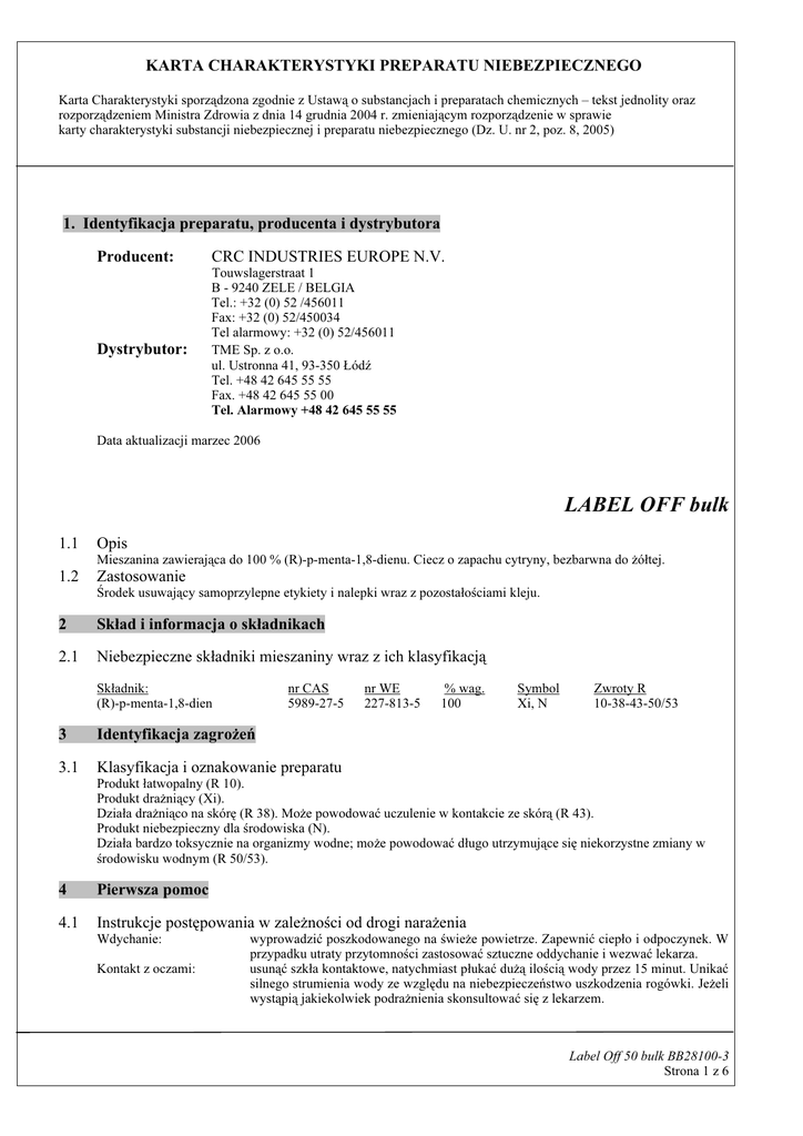 KARTA CHARAKTERYSTYKI PREPARATU NIEBEZPIECZNEGO Karta Charakterystyki sporządzona zgodnie z Ustawą o substancjach i preparatach chemicznych – tekst jednolity oraz rozporządzeniem Ministra Zdrowia z dnia 14 grudnia 2004 r. zmieniającym rozporządzenie w sprawie karty charakterystyki substancji niebezpiecznej i preparatu niebezpiecznego (Dz. U. nr 2, poz. 8, 2005) 1. Identyfikacja preparatu, producenta i dystrybutora Producent: Dystrybutor: CRC INDUSTRIES EUROPE N.V. Touwslagerstraat 1 B - 9240 ZELE / BELGIA Tel.: +32 (0) 52 /456011 Fax: +32 (0) 52/450034 Tel alarmowy: +32 (0) 52/456011 TME Sp. z o.o. ul. Ustronna 41, 93-350 Łódź Tel. +48 42 645 55 55 Fax. +48 42 645 55 00 Tel. Alarmowy +48 42 645 55 55 Data aktualizacji marzec 2006 LABEL OFF bulk 1.1 Opis 1.2 Zastosowanie Mieszanina zawierająca do 100 % (R)-p-menta-1,8-dienu. Ciecz o zapachu cytryny, bezbarwna do żółtej. Środek usuwający samoprzylepne etykiety i nalepki wraz z pozostałościami kleju. 2 Skład i informacja o składnikach 2.1 Niebezpieczne składniki mieszaniny wraz z ich klasyfikacją nr CAS 5989-27-5 Składnik: (R)-p-menta-1,8-dien 3 Identyfikacja zagrożeń 3.1 Klasyfikacja i oznakowanie preparatu nr WE 227-813-5 % wag. 100 Symbol Xi, N Zwroty R 10-38-43-50/53 Produkt łatwopalny (R 10). Produkt drażniący (Xi). Działa drażniąco na skórę (R 38). Może powodować uczulenie w kontakcie ze skórą (R 43). Produkt niebezpieczny dla środowiska (N). Działa bardzo toksycznie na organizmy wodne; może powodować długo utrzymujące się niekorzystne zmiany w środowisku wodnym (R 50/53). 4 Pierwsza pomoc 4.1 Instrukcje postępowania w zależności od drogi narażenia Wdychanie: Kontakt z oczami: wyprowadzić poszkodowanego na świeże powietrze. Zapewnić ciepło i odpoczynek. W przypadku utraty przytomności zastosować sztuczne oddychanie i wezwać lekarza. usunąć szkła kontaktowe, natychmiast płukać dużą ilością wody przez 15 minut. Unikać silnego strumienia wody ze względu na niebezpieczeństwo uszkodzenia rogówki. Jeżeli wystąpią jakiekolwiek podrażnienia skonsultować się z lekarzem. Label Off 50 bulk BB28100-3 Strona 1 z 6 KARTA CHARAKTERYSTYKI PREPARATU NIEBEZPIECZNEGO Karta Charakterystyki sporządzona zgodnie z Ustawą o substancjach i preparatach chemicznych – tekst jednolity oraz rozporządzeniem Ministra Zdrowia z dnia 14 grudnia 2004 r. zmieniającym rozporządzenie w sprawie karty charakterystyki substancji niebezpiecznej i preparatu niebezpiecznego (Dz. U. nr 2, poz. 8, 2005) Kontakt ze skórą: Ogólne zalecenia: Wskazówki dla lekarza natychmiast zdjąć zanieczyszczoną odzież; skażoną skórę dokładnie zmywać wodą. Jeżeli wystąpią jakiekolwiek podrażnienia, skontaktować się z lekarzem. powinny być przestrzegane zwykłe środki ostrożności jak przy pracy z chemikaliami. Jeżeli wystąpią jakiekolwiek niepokojące objawy, wezwać lekarza. stosować leczenie objawowe. 5 Postępowanie w przypadku pożaru 5.1 Zalecane środki gaśnicze Piana, dwutlenek węgla lub proszki gaśnicze. Pojemniki narażone na działanie ognia chłodzić rozproszonym strumieniem wody. 5.2 Zabronione środki gaśnicze 5.3 Niebezpieczne produkty rozkładu 5.4 Specjalistyczny sprzęt przeciwpożarowy Zwarty strumień wody. Tlenek węgla, dwutlenek węgla. Nakładać ubrania ochronne oraz aparaty oddechowe niezależne od powietrza z otoczenia. 6 Postępowanie w przypadku niezamierzonego uwolnienia do środowiska 6.1 Zagrożenia dla zdrowia i środki ochrony ludzi Środki ostrożności: Zapewnić odpowiednią wentylację. Nakładać odzież ochronną i rękawice. Nie wdychać oparów. Zabezpieczyć studzienki ściekowe. Unikać bezpośredniego kontaktu z preparatem. Pary rozcieńczyć rozproszonym strumieniem wody. Nie pić, nie jeść i nie palić w trakcie używania. 6.2 Zagrożenia dla środowiska i środki ochrony środowiska 6.3 Metody unieszkodliwiania, zbierania i oczyszczania środowiska Zabezpieczyć przed wprowadzeniem do miejskiego systemu wodno-kanalizacyjnego i cieków wodnych. Rozlany produkt zaabsorbować w chemicznie obojętny materiał wiążący (piasek, ziemia okrzemkowa), przenieść do szczelnie zamykanych pojemników. Małe ilości spłukać wodą. 7 Postępowanie z preparatem i jego magazynowanie 7.1 Postępowanie z preparatem - środki ostrożności Stosować tylko w dobrze wentylowanych pomieszczeniach. Trzymać z daleka od źródeł wysokiej temperatury i źródeł zapłonu. Zastosować środki ostrożności - uwaga na wyładowania elektrostatyczne Wskazane jest podejmowanie środków ostrożności, aby podczas pracy z produktem unikać kontaktu ze skórą i oczami. 7.2 Przechowywanie Przechowywać w chłodnym, suchym, dobrze wentylowanym miejscu. Przechowywać poza zasięgiem dzieci. 8 Kontrola narażenia i środki ochrony indywidualnej 8.1 Technologiczne sposoby zmniejszenia narażenia Zapewnić odpowiednią wentylację pomieszczenia. Trzymać z daleka od źródeł wysokiej temperatury i źródeł zapłonu. 8.2 Wartości NDS, NDSCh, NDSP Składnik CAS-nr Brak polskich normatywów. 8.3 metoda wielkość jednostka Środki ochrony osobistej Drogi oddechowe: Ręce i skóra: w przypadku niedostatecznej wentylacji stosować ochronę dróg oddechowych. stosować odzież ochronną i rękawice. Label Off 50 bulk BB28100-3 Strona 2 z 6 KARTA CHARAKTERYSTYKI PREPARATU NIEBEZPIECZNEGO Karta Charakterystyki sporządzona zgodnie z Ustawą o substancjach i preparatach chemicznych – tekst jednolity oraz rozporządzeniem Ministra Zdrowia z dnia 14 grudnia 2004 r. zmieniającym rozporządzenie w sprawie karty charakterystyki substancji niebezpiecznej i preparatu niebezpiecznego (Dz. U. nr 2, poz. 8, 2005) Oczy: stosować okulary ochronne typu gogle. 9 Właściwości fizykochemiczne 9.1 Postać fizyczna, barwa, zapach 9.2 Temperatura wrzenia Ciecz, bezbarwna do żółtej, o zapachu cytryny. 170 – 180 0C. 9.3. Temperatura topnienia Brak danych. 9.4. Prężność par Brak 