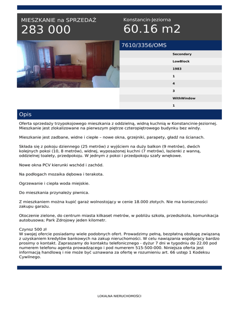 MIESZKANIE na SPRZEDAŻ 283 000 Konstancin-Jeziorna 60.16 m2 7610/3356/OMS Secondary LowBlock 1983 1 4 3 WithWindow 1 Opis Oferta sprzedaży trzypokojowego mieszkania z oddzielną, widną kuchnią w Konstancinie-Jeziornej. Mieszkanie jest zlokalizowane na pierwszym piętrze czteropiętrowego budynku bez windy. Mieszkanie jest zadbane, widne i ciepłe – nowe okna, grzejniki, parapety, gładź na ścianach. Składa się z pokoju dziennego (25 metrów) z wyjściem na duży balkon (9 metrów), dwóch kolejnych pokoi (10, 8 metrów), widnej, wyposażonej kuchni (7 metrów), łazienki z wanną, oddzielnej toalety, przedpokoju. W jednym z pokoi i przedpokoju szafy wnękowe. Nowe okna PCV kierunki wschód i zachód. Na podłogach mozaika dębowa i terakota. Ogrzewanie i ciepła woda miejskie. Do mieszkania przynależy piwnica. Z mieszkaniem można kupić garaż wolnostojący w cenie 18.000 złotych. Nie ma konieczności zakupu garażu. Otoczenie zielone, do centrum miasta kilkaset metrów, w pobliżu szkoła, przedszkola, komunikacja autobusowa; Park Zdrojowy jeden kilometr. Czynsz 500 zł W swojej ofercie posiadamy wiele podobnych ofert. Prowadzimy pełną, bezpłatną obsługę związaną z uzyskaniem kredytów bankowych na zakup nieruchomości. W celu nawiązania współpracy bardzo prosimy o kontakt. Zapraszamy do kontaktu telefonicznego - dyżur 7 dni w tygodniu do 22.00 pod numerem telefonu agenta prowadzącego i pod numerem 515-500-000. Niniejsza oferta jest informacją handlową i nie może być uznawana za ofertę w rozumieniu art. 66 ustęp 1 Kodeksu Cywilnego. LOKALNA NIERUCHOMOŚCI Wojciech Raducha tel. 515-200-004 tel. 22 702 55 55 email: [email protected] LOKALNA NIERUCHOMOŚCI Powered by TCPDF (www.tcpdf.org)
