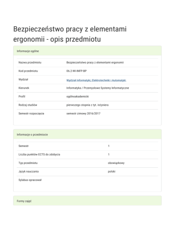 Bezpieczeństwo pracy z elementami ergonomii - opis przedmiotu Informacje ogólne Nazwa przedmiotu Bezpieczeństwo pracy z elementami ergonomii Kod przedmiotu 06.2-WI-INFP-BP Wydział Wydział Informatyki, Elektrotechniki i Automatyki Kierunek Informatyka / Przemysłowe Systemy Informatyczne Profil ogólnoakademicki Rodzaj studiów pierwszego stopnia z tyt. inżyniera Semestr rozpoczęcia semestr zimowy 2016/2017 Informacje o przedmiocie Semestr 1 Liczba punktów ECTS do zdobycia 1 Typ przedmiotu obowiązkowy Język nauczania polski Sylabus opracował Formy zajęć Forma Liczba godzin w Liczba godzin w Liczba godzin w Liczba godzin w Forma zajęć semestrze tygodniu semestrze tygodniu zaliczenia (stacjonarne) (stacjonarne) (niestacjonarne) (niestacjonarne) 15 1 9 ,6 Wykład Zaliczenie na ocenę Cel przedmiotu 1. poznanie przepisów bezpieczeństwa i higieny pracy obowiązujących w Laboratoriach. 2. Poznanie metod i kryteriów oceny zagrożenia i narażenia w miejscu pracy oraz metody ochrony przed tymi zagrożeniami. 3. Studenci są zapoznawani z zasadami udzielania pierwszej pomocy w razie wypadku. Wymagania wstępne Podstawy Elektrotechniki Zakres tematyczny Przepisy bezpieczeństwa i higieny pracy. Kwalifikacje osób zajmujących się eksploatacją urządzeń elektrycznych. Działanie prądu elektrycznego na człowieka. Wpływ rodzaju prądu na skutki rażenia. Wartości progowe. Zmiany w organizmie. Ochrona przeciwporażeniowa. Układy sieciowe. Rodzaje i środki ochrony przeciwporażeniowej. Zakres i metodyka badania ochrony przeciwporażeniowej. Zagrożenia związane z występowanie elektryczności statycznej. Zapobieganie elektryczności statycznej. Ładunki elektrostatyczne na człowieku. Użytkowanie urządzeń elektrycznych. Ochrona przed porażeniem w instalacji elektrycznej sieci komputerowej. Ochrona przed skutkami łuku elektrycznego. Ochrona przeciwprzepięciowa. Urządzenia elektryczne w strefie zagrożonej wybuchem. Warunki dopuszczenia urządzeń do stosowania. Europejski system oceny wyrobów i usług. Pierwsza pomoc. Metody kształcenia Wykład konwencjonalny z użyciem środków multimedialnych. Efekty kształcenia i metody weryfikacji osiągania efektów kształcenia Opis efektu Jest kreatywny w rozwiązywaniu problemów Symbole efektów Metody weryfikacji Forma zajęć K_K09 kolokwium Wykład K_K03 kolokwium Wykład uwzględniając dostępne środki. Ma świadomość ważności i rozumie pozatechniczne aspekty i skutki działalności inżynierskiej i związnej z tym odpowiedzialności za podejmowane decyzje Warunki zaliczenia W skład oceny końcowej wchodzą: ocena z kolokwium z wagą 80%; ocena z aktywności na zajęciach z wagą 20%. Obciążenie pracą Obciążenie pracą Studia Studia niestacjonarne stacjonarne (w godz.) (w godz.) Godziny kontaktowe (udział w zajęciach; konsultacjach; egzaminie, itp.) 20 14 Samodzielna praca studenta (przygotowanie do: zajęć, kolokwium, 5 11 Łącznie 25 25 Punkty ECTS Studia Studia niestacjonarne egzaminu; studiowanie literatury przygotowanie: pracy pisemnej, projektu, prezentacji, raportu, wystąpienia; itp.) stacjonarne Zajęcia z udziałem nauczyciela akademickiego 1 1 Zajęcia bez udziału nauczyciela akademickiego 0 0 Łącznie 1 1 Literatura podstawowa 1. Strojny J. Bezpieczeństwo użytkowania urządzeń elektrycznych AGH, Kraków, 2003. 2. Matula E., Sych M. Zapobieganie porażeniom elektrycznym w przemyśle, WNT Warszawa 1980. 3. Prawo Energetyczne, URE, www.gip.pl, Warszawa 2004 4. Nauka o pracy, Bezpieczeństwo, Higiena i Ergonomia, Multimedialny Pakiet Edukacyjny dla Uczelni Wyższych, Centralny Instytut Ochrony Pracy, Państwowy Instytut Badawczy 2010. Literatura uzupełniająca Edward Musiał, Komentarze do PN-HD 60-364, SEP COSiW Uwagi Zmodyfikowane przez dr hab. inż. Krzysztof Patan, prof. UZ (ostatnia modyfikacja: 18-09-2016 19:08)