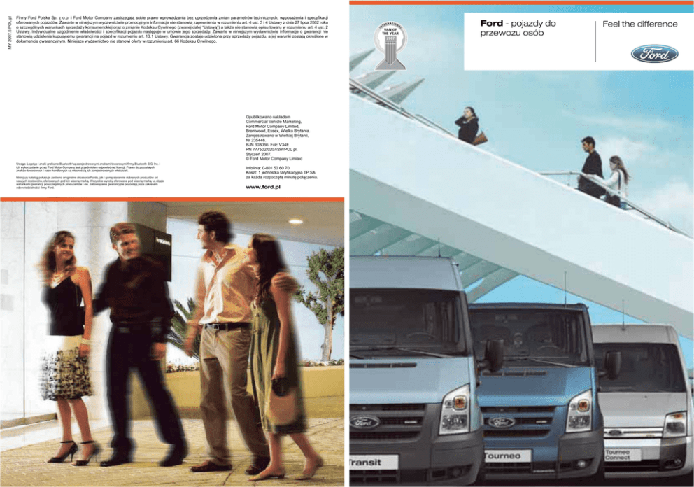 MY 2007.5 POL pl Firmy Ford Polska Sp. z o.o. i Ford Motor Company zastrzegają sobie prawo wprowadzania bez uprzedzenia zmian parametrów technicznych, wyposażenia i specyfikacji oferowanych pojazdów. Zawarte w niniejszym wydawnictwie promocyjnym informacje nie stanowią zapewnienia w rozumieniu art. 4 ust. 3 i 4 Ustawy z dnia 27 lipca 2002 roku o szczególnych warunkach sprzedaży konsumenckiej oraz o zmianie Kodeksu Cywilnego (zwanej dalej “Ustawą”) a także nie stanowią opisu towaru w rozumieniu art. 4 ust. 2 Ustawy. Indywidualne uzgodnienie właściwości i specyfikacji pojazdu następuje w umowie jego sprzedaży. Zawarte w niniejszym wydawnictwie informacje o gwarancji nie stanowią udzielenia kupującemu gwarancji na pojazd w rozumieniu art. 13.1 Ustawy. Gwarancja zostaje udzielona przy sprzedaży pojazdu, a jej warunki zostają określone w dokumencie gwarancyjnym. Niniejsze wydawnictwo nie stanowi oferty w rozumieniu art. 66 Kodeksu Cywilnego. Opublikowano nakładem Commercial Vehicle Marketing, Ford Motor Company Limited, Brentwood, Essex, Wielka Brytania. Zarejestrowano w Wielkiej Brytanii, Nr 235446. BJN 303066. FoE V34E PN 777502/0207/2m/POL pl. Styczeń 2007. © Ford Motor Company Limited Uwaga: Logotyp i znaki graficzne Bluetooth są zarejestrowanymi znakami towarowymi firmy Bluetooth SIG, Inc. i ich wykorzystanie przez Ford Motor Company jest przedmiotem odpowiedniej licencji. Prawa do pozostałych znaków towarowych i nazw handlowych są własnością ich zarejestrowanych właścicieli. ® Niniejszy katalog pokazuje zarówno oryginalne akcesoria Forda, jak i gamę starannie dobranych produktów od naszych dostawców, oferowanych pod ich własną marką. Wszystkie wyroby oferowane pod własną marką są objęte warunkami gwarancji poszczególnych producentów i ew. zobowiązania gwarancyjne pozostają poza zakresem odpowiedzialności firmy Ford. Infolinia: 0-801 50 60 70 Koszt: 1 jednostka taryfikacyjna TP SA za każdą rozpoczętą minutę połączenia. www.ford.pl Ford - pojazdy do przewozu osób 2 51 Wybierz nowego Forda Transit a będziesz dumny z posiadania Samochodu Dostawczego Roku 2007 Lakiery zwykłe Lakiery metalizowane Willow Caramella* Saffron Yellow Plum Blush* Colorado Red Marmalade* Dark True Blue Moondust Silver* Frozen White Pepper Red* Jury konkursu "Samochód Dostawczy Roku", na który składają się niezależni czołowi dziennikarze piszący o pojazdach użytkowych z 19 krajów Europy, przyznała nowemu Fordowi Transit tytuł "Samochodu Dostawczego Roku 2007" po jednej z najbardziej wyrównanych batalii w historii tego konkursu. W oficjalnym oświadczeniu jury konkursu "Samochód Dostawczy Roku" stwierdziło: "Przy podejmowaniu decyzji szczególnie zaimponowało nam to, że inżynierowie Forda sięgnęli po jeden z najlepszych samochodów dostawczych Europy i uczynili go jeszcze lepszym. Właściwości jezdne Forda Transit są wyśmienite zarówno w ruchu miejskim, jak i na autostradzie." Dalej w oświadczeniu: "Doceniamy także to, że konstruktorzy i inżynierowie Forda w większym stopniu niż inni producenci utrzymują stały kontakt z potencjalnymi i dotychczasowymi nabywcami, aby stale monitorować ich oczekiwania i potrzeby. W wyniku tego wnętrze kabiny nowego Forda Transit osiągnęło jakość zbliżoną do samochodu osobowego. Stoi za tym myśl, że kierowcy samochodów dostawczych często spędzają więcej czasu w swoich pojazdach, niż kierowcy samochodów osobowych." Tytuł ‘Samochód Dostawczy Roku 2007' jeszcze bardziej motywuje Forda do podjęcia wszelkich działań, by Transit nadal wyprzedzał konkurencję. Uwaga: Sylwetki samochodów zostały tu wykorzystane wyłącznie dla pokazania kolorów lakierów i mogą różnić się od aktualnie oferowanych wersji. Przedstawione w niniejszym katalogu kolory lakierów i obić mogą różnić się nieznacznie od odcieni rzeczywistych ze względu na ograniczenia technologiczne przy odtwarzaniu barw w procesie druku. Blue Ambition* Sublime* Magnum Grey* *Lakiery metalizowane są dostępne jako opcja za dopłatą. Tonic* Nowy Ford Transit kombi 4 6 8 10 12 14 16 18 Wprowadzenie Imponujące własności jezdne Harmonia stylu i solidności Komfort i pełna kontrola Klasa sama dla siebie Moc, na którą możesz liczyć Ford Transit Kombi Przedział pasażerski i przestrzeń ładunkowa Nowy Ford Transit mikrobus 20 Wprowadzenie 22 Przedział pasażerski Nowy Ford Tourneo Ford Tourneo Connect 24 Wprowadzenie 26 Komfort i pełna kontrola 34 Wprowadzenie 36 Ford Tourneo Connect GLX 28 30 31 32 38 Ford Tourneo Connect i Tourneo Connect LX 40 Dwa samochody w jednym 42 Bezpieczeństwo 43 Skuteczność zabezpieczeń 44 Akcesoria 46 Usługi serwisowe 48 Usługi finansowe 49 Ford i środowisko 50 Kolory lakierów Opcje i wersje specjalne (SVO) Przedział pasażerski Bezpieczeństwo Skuteczność zabezpieczeń Akcesoria Modele: Ford Tourneo Connect w wersji z długim rozstawem osi (LWB), Ford Tourneo i 14-miejscowy mikrobus Ford Transit. Samochody przedstawione na zdjęciu mogą mieć wyposażenie dodatkowe i akcesoria dostępne za dopłatą. Uwaga: Niektóre zdjęcia w niniejszym katalogu przedstawiają egzemplarze przedprodukcujne, bądź też zostały wygenerowane komputerowo. Pojazdy seryjne mogą się zatem różnić w niektórych szczegółach. Dodatkowo, niektóre elementy wyposażenia mogą być opcjonalne. 3 Nowy Ford Transit kombi 4 Przedstawiamy nowego Forda Transita. Najlepsza koncepcja staje się jeszcze lepsza. Od ponad 40 lat Ford Transit zbiera pochwały, zbiera nagrody i cieszy się szacunkiem i zaufaniem setek tysięcy użytkowników na całym świecie. Dziś najbardziej godny zaufania partner biznesowy wielu europejskich przedsiębiorców podnosi poprzeczkę jeszcze wyżej. Nowoczesna i pełna świeżości linia nadwozia, solidna konstrukcja, niezawodność, nowe mocne silniki, niezwykle komfortowa kabina i wyjątkowe własności jezdne są doskonałym świadectwem dla Ciebie i 