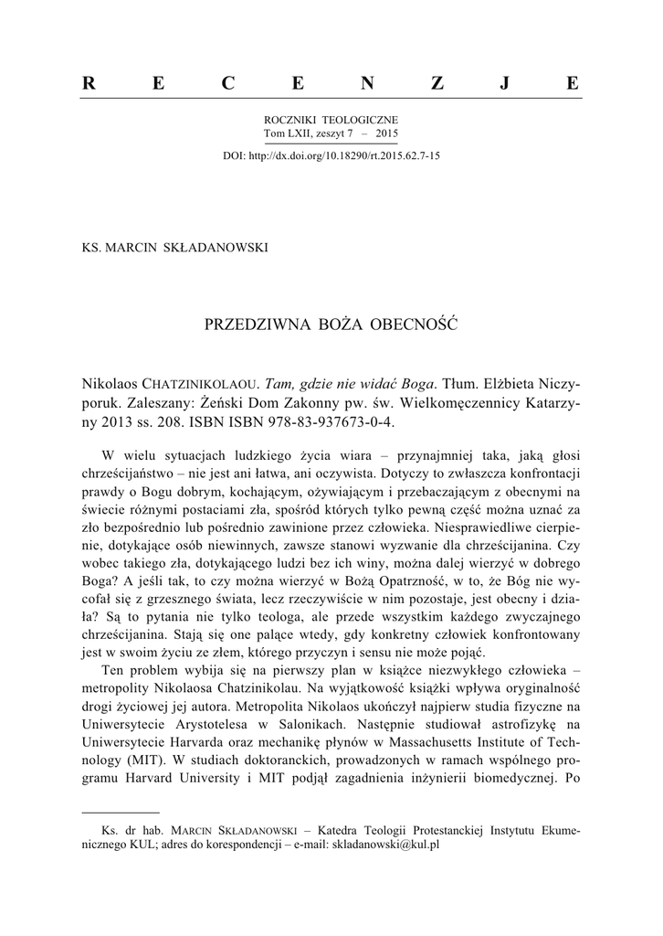 R E C E N Z J E ROCZNIKI TEOLOGICZNE Tom LXII, zeszyt 7 – 2015 DOI: http://dx.doi.org/10.18290/rt.2015.62.7-15 KS. MARCIN SKADANOWSKI * PRZEDZIWNA BOA OBECNO Nikolaos CHATZINIKOLAOU. Tam, gdzie nie wida Boga. Tum. Elbieta Niczyporuk. Zaleszany: e ski Dom Zakonny pw. w. Wielkomczennicy Katarzyny 2013 ss. 208. ISBN ISBN 978-83-937673-0-4. W wielu sytuacjach ludzkiego ycia wiara – przynajmniej taka, jak gosi chrzecija stwo – nie jest ani atwa, ani oczywista. Dotyczy to zwaszcza konfrontacji prawdy o Bogu dobrym, kochajcym, oywiajcym i przebaczajcym z obecnymi na wiecie rónymi postaciami za, sporód których tylko pewn cz mona uzna za zo bezporednio lub porednio zawinione przez czowieka. Niesprawiedliwe cierpienie, dotykajce osób niewinnych, zawsze stanowi wyzwanie dla chrzecijanina. Czy wobec takiego za, dotykajcego ludzi bez ich winy, mona dalej wierzy w dobrego Boga? A jeli tak, to czy mona wierzy w Bo Opatrzno, w to, e Bóg nie wycofa si z grzesznego wiata, lecz rzeczywicie w nim pozostaje, jest obecny i dziaa? S to pytania nie tylko teologa, ale przede wszystkim kadego zwyczajnego chrzecijanina. Staj si one palce wtedy, gdy konkretny czowiek konfrontowany jest w swoim yciu ze zem, którego przyczyn i sensu nie moe poj. Ten problem wybija si na pierwszy plan w ksice niezwykego czowieka – metropolity Nikolaosa Chatzinikolau. Na wyjtkowo ksiki wpywa oryginalno drogi yciowej jej autora. Metropolita Nikolaos uko czy najpierw studia fizyczne na Uniwersytecie Arystotelesa w Salonikach. Nastpnie studiowa astrofizyk na Uniwersytecie Harvarda oraz mechanik pynów w Massachusetts Institute of Technology (MIT). W studiach doktoranckich, prowadzonych w ramach wspólnego programu Harvard University i MIT podj zagadnienia inynierii biomedycznej. Po Ks. dr hab. MARCIN SKADANOWSKI – Katedra Teologii Protestanckiej Instytutu Ekumenicznego KUL; adres do korespondencji – e-mail: [email protected] 214 RECENZJE studiach pracowa w Bostonie – w laboratorium angiologicznym, w klinice anestezjologii oraz na oddziale intensywnej terapii szpitala pediatrycznego. Po powrocie do Grecji w latach 90. XX wieku prowadzi wykady na Krecie i w Atenach. Poza studiami z dziedziny inynierii biomedycznej autor podj take studia z teologii prawosawnej w Holy Cross Greek Orthodox School of Theology w Bostonie i na Uniwersytecie Arystotelesa w Salonikach. To biomedyczne i teologiczne przygotowanie umoliwio mu zaoenie w 1993 roku pierwszego w Grecji Centrum Etyki Biomedycznej i Deontologii. Drodze naukowej towarzyszyo w yciu autora odkrywanie innego powoania. W 1989 r. zosta mnichem i kapanem. Od 2004 r. jest metropolit Mesogaias i Lavreotikis w Grecji. Ksika Tam, gdzie nie wida Boga jest zatem publikacj teologa, bioetyka, inyniera z obszaru biotechnologii oraz praktyka, majcego dowiadczenie pracy szpitalnej, stykajcego si w niej z najtrudniejszymi przypadkami, z wielkimi dramatami ludzkimi, z nieuchronnym cierpieniem wielu osób i ze mierci. Nie jest to wic dzieo pene piknych i wzniosych, cho pustych, sów o cierpieniu. Metropolita Nikolaos odwouje si do konkretnych przypadków cierpienia niezasuonego i niepojtego, aby – jako chrzecijanin – szuka istnienia i dziaania Boga, nadajcego sens temu, co dla czowieka wydaje si pozbawione wszelkiego sensu. Ksika metropolity Nikolaosa nie stanowi teologicznego ani tym bardziej medycznego wykadu. Rzecz jasna zawiera niezbdne wyjanienia medyczne oraz pewne elementy nauki chrzecija skiej, jednake nie na tym polega jej oryginalno. Metropolita zbudowa swoj ksik jako zbiór wielu konkretnych przypadków. Nie s to bynajmniej „przypadki” w statystyce medycznej, lecz konkretne osoby, czasem rodziny, z którymi w czasie zoonej drogi yciowej metropolita spotka si – zarówno w Ameryce, jak i w Grecji. Opisuje cierpice na przewleke, niekiedy nieuleczalne choroby dzieci, osoby mode i starsze. Mówi o rodzinach dowiadczanych niezasuonym cierpieniem: o przeywajcych dramat, ból i rozpacz matkach i ojcach. Wspomina cierpicych duchownych. Kady z przypadków jest inny. Niekiedy skomplikowana terapia prowadzi do wyleczenia, innym razem take lekarze zauwaaj niepojte Boe dziaanie – cud uzdrowienia, w jeszcze innych sytuacjach choroba i cierpienie prowadz do mierci. Niezalenie od losów indywidualnych ludzi, kade cierpienie – nawet jeli sko czy si wyleczeniem czy uzdrowieniem – stanowi wyzwanie dla wiary chrzecija skiej. Metropolita przedstawia bardzo konkretne sytuacje, w których – jak mówi tytu ksiki – „nie wida Boga”, Bóg goszony przez Koció – kochajcy, dobry i miosierny – wydaje si zupenie nieobecny. W obliczu niezasuonego cierpienia ludzie stawiaj liczne pytania: dlaczego dobry, wszechmogcy Bóg dopuszcza ból i cierpienie? dlaczego, jeli ju cierpienie musi by na wiecie, Bóg nie rozdziela go po równo, skoro s niewinni ludzie, którzy cierpi strasznie, ponad moliw do pojcia miar? dlaczego cierpi dzieci, które nie zawiniy ani wobec Boga, ani wobec innych ludzi? dlaczego konkretne cierpienie spotkao wanie mnie? Autor nie daje tutaj banalnych, sztampowych odpowiedzi. RECENZJE 215 Mona mie wraenie, e w zasadzie nie usiuje ich wymyla. Wiele razy opisuje po prostu wasne trwanie z cierpicymi, wiadectwo wiary i modlitwy, ale te wiadectwo wasnych rozterek i pyta wobec Boga. Ksika metropolity Nikolaosa pokazuje wielko cierpienia i umierania. Nie jest jednak pochwa cierpitnictwa, nie usiuje znajdowa sensu w zu czy te usprawiedliwia niezasuonego cierpienia niezbadan wol Bo. Wielko cierpienia ujawnia si w wielkoci cierpicych. W tej historii niekiedy nawet dzieci, przeywajce dramat choroby, staj si bohaterami i nauczycielami wiary i nadziei. Nie znaczy to, e najtrudniejsze pytania czowieka o Boga w obliczu cierpienia pozostaj na uboczu. Bynajmniej – z wszystkich opowiedzianych historii wyania si jedna, najwaniejsza odpowied, jak jest w stanie da chrzecija stwo w obliczu za obecnego w wiecie stworzonym przecie przez dobrego Boga. Bóg rzeczywicie jest obecny w wiecie i w 
