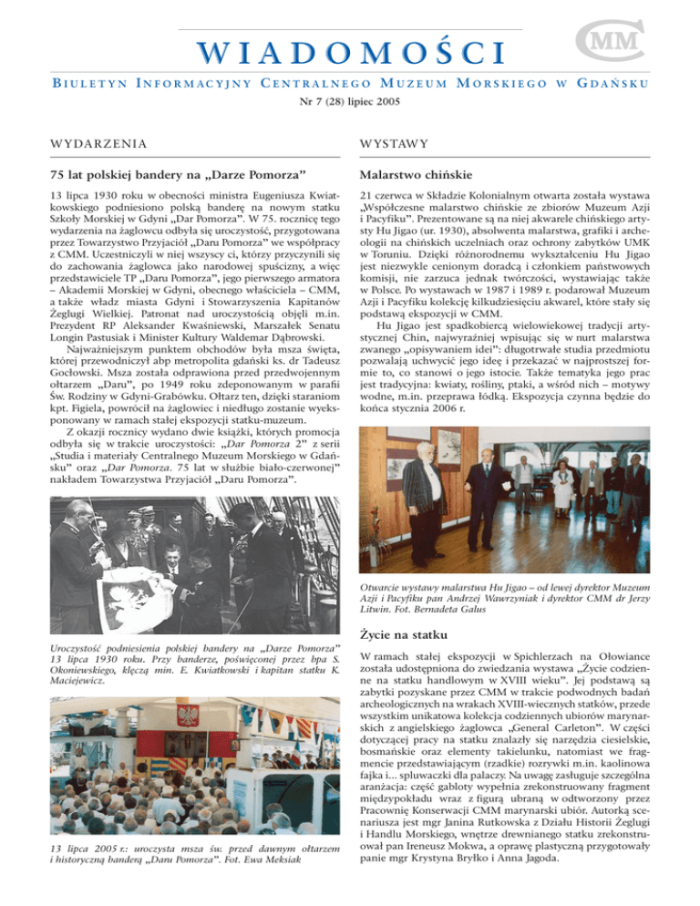 WIADOMOŚCI B I U L E T Y N I N F O R M AC Y J N Y C E N T R A L N E G O M U Z E U M M O R S K I E G O W GDAŃSKU Nr 7 (28) lipiec 2005 WYDA RZENIA W YS TAW Y 75 lat polskiej bandery na „Darze Pomorza” Malarstwo chińskie 13 lipca 1930 roku w obecności ministra Eugeniusza Kwiatkowskiego podniesiono polską banderę na nowym statku Szkoły Morskiej w Gdyni „Dar Pomorza”. W 75. rocznicę tego wydarzenia na żaglowcu odbyła się uroczystość, przygotowana przez Towarzystwo Przyjaciół „Daru Pomorza” we współpracy z CMM. Uczestniczyli w niej wszyscy ci, którzy przyczynili się do zachowania żaglowca jako narodowej spuścizny, a więc przedstawiciele TP „Daru Pomorza”, jego pierwszego armatora – Akademii Morskiej w Gdyni, obecnego właściciela – CMM, a także władz miasta Gdyni i Stowarzyszenia Kapitanów Żeglugi Wielkiej. Patronat nad uroczystością objęli m.in. Prezydent RP Aleksander Kwaśniewski, Marszałek Senatu Longin Pastusiak i Minister Kultury Waldemar Dąbrowski. Najważniejszym punktem obchodów była msza święta, której przewodniczył abp metropolita gdański ks. dr Tadeusz Gocłowski. Msza została odprawiona przed przedwojennym ołtarzem „Daru”, po 1949 roku zdeponowanym w parafii Św. Rodziny w Gdyni-Grabówku. Ołtarz ten, dzięki staraniom kpt. Figiela, powrócił na żaglowiec i niedługo zostanie wyeksponowany w ramach stałej ekspozycji statku-muzeum. Z okazji rocznicy wydano dwie książki, których promocja odbyła się w trakcie uroczystości: „Dar Pomorza 2” z serii „Studia i materiały Centralnego Muzeum Morskiego w Gdańsku” oraz „Dar Pomorza. 75 lat w służbie biało-czerwonej” nakładem Towarzystwa Przyjaciół „Daru Pomorza”. 21 czerwca w Składzie Kolonialnym otwarta została wystawa „Współczesne malarstwo chińskie ze zbiorów Muzeum Azji i Pacyfiku”. Prezentowane są na niej akwarele chińskiego artysty Hu Jigao (ur. 1930), absolwenta malarstwa, grafiki i archeologii na chińskich uczelniach oraz ochrony zabytków UMK w Toruniu. Dzięki różnorodnemu wykształceniu Hu Jigao jest niezwykle cenionym doradcą i członkiem państwowych komisji, nie zarzuca jednak twórczości, wystawiając także w Polsce. Po wystawach w 1987 i 1989 r. podarował Muzeum Azji i Pacyfiku kolekcję kilkudziesięciu akwarel, które stały się podstawą ekspozycji w CMM. Hu Jigao jest spadkobiercą wielowiekowej tradycji artystycznej Chin, najwyraźniej wpisując się w nurt malarstwa zwanego „opisywaniem idei”: długotrwałe studia przedmiotu pozwalają uchwycić jego ideę i przekazać w najprostszej formie to, co stanowi o jego istocie. Także tematyka jego prac jest tradycyjna: kwiaty, rośliny, ptaki, a wśród nich – motywy wodne, m.in. przeprawa łódką. Ekspozycja czynna będzie do końca stycznia 2006 r. Otwarcie wystawy malarstwa Hu Jigao – od lewej dyrektor Muzeum Azji i Pacyfiku pan Andrzej Wawrzyniak i dyrektor CMM dr Jerzy Litwin. Fot. Bernadeta Galus Życie na statku Uroczystość podniesienia polskiej bandery na „Darze Pomorza” 13 lipca 1930 roku. Przy banderze, poświęconej przez bpa S. Okoniewskiego, klęczą min. E. Kwiatkowski i kapitan statku K. Maciejewicz. 13 lipca 2005 r.: uroczysta msza św. przed dawnym ołtarzem i historyczną banderą „Daru Pomorza”. Fot. Ewa Meksiak W ramach stałej ekspozycji w Spichlerzach na Ołowiance została udostępniona do zwiedzania wystawa „Życie codzienne na statku handlowym w XVIII wieku”. Jej podstawą są zabytki pozyskane przez CMM w trakcie podwodnych badań archeologicznych na wrakach XVIII-wiecznych statków, przede wszystkim unikatowa kolekcja codziennych ubiorów marynarskich z angielskiego żaglowca „General Carleton”. W części dotyczącej pracy na statku znalazły się narzędzia ciesielskie, bosmańskie oraz elementy takielunku, natomiast we fragmencie przedstawiającym (rzadkie) rozrywki m.in. kaolinowa fajka i... spluwaczki dla palaczy. Na uwagę zasługuje szczególna aranżacja: część gabloty wypełnia zrekonstruowany fragment międzypokładu wraz z figurą ubraną w odtworzony przez Pracownię Konserwacji CMM marynarski ubiór. Autorką scenariusza jest mgr Janina Rutkowska z Działu Historii Żeglugi i Handlu Morskiego, wnętrze drewnianego statku zrekonstruował pan Ireneusz Mokwa, a oprawę plastyczną przygotowały panie mgr Krystyna Bryłko i Anna Jagoda. WYPRAWY Powrót „Swaroga” W sierpniu ubiegłego roku przypłynęła do Gdańska Prypecią, Bugiem i Wisłą ekspedycja Narodowej Akademii Nauk Ukrainy na statku „Swarog”, będącym repliką łodzi wikińskiej odkrytej w nurtach Prypeci pod Kijowem. Załoga po trzytygodniowym rejsie naukowo-eksperymentalnym powróciła do domu, pozostawiając statek na zimę w CMM. W tym roku eksperyment jest kontynuowany: 28 czerwca „Swarog” wypłynął w drogę powrotną, tym razem historycznym szlakiem wodnym łączącym region południowego Bałtyku z Rusią Kijowską i Bizancjum: przez Zalew Wiślany do Kaliningradu, a następnie Pregołą, Niemnem, Prypecią i Dnieprem. W wyprawie, w trakcie której odtwarzane są warunki średniowiecznej żeglugi i bytowania na pokładzie, bierze udział jako przedstawiciel CMM mgr Marek Cieślak z Działu Budownictwa Okrętowego. Przed wyruszeniem w drogę powrotną załoga „Swaroga” wręczyła dyrektorowi CMM dr. Jerzemu Litwinowi order „Kozacka sława” 3 klasy, nadany przez Uniwersytet w Kijowie jako uhonorowanie współpracy pomiędzy obiema instytucjami. Rejs na żaglowcu „Sarpen” Zabytkowy szwedzki żaglowiec „Sarpen” (zbudowany w 1892 roku) przypłynął 11 lipca do Gdańska w ramach projektu „Szwedzkie muzea z wizytą w Polsce. Wyprawa i wystawa 2005”. „Sarpen” to statek treningowy skautów z Simirshamn, którego dorosła załoga tworzona jest na zasadzie wolontariatu. 12 lipca, gdy młodzi uczestnicy rejsu zwiedzali Gdańsk, na pokład zostali zaproszeni pracownicy CMM, którzy odbyli 8-godzinny