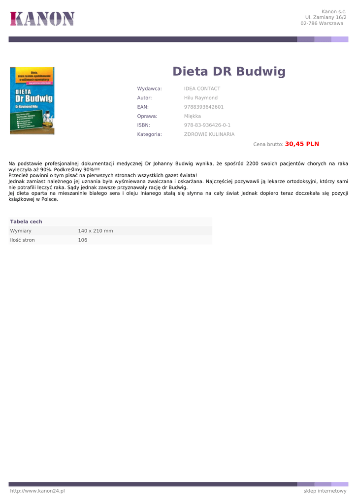 Kanon s.c. Ul. Zamiany 16/2 02-786 Warszawa Dieta DR Budwig Wydawca: IDEA CONTACT Autor: Hilu Raymond EAN: 9788393642601 Oprawa: Miękka ISBN: 978-83-936426-0-1 Kategoria: ZDROWIE KULINARIA Cena brutto: 30,45 PLN Na podstawie profesjonalnej dokumentacji medycznej Dr Johanny Budwig wynika, że spośród 2200 swoich pacjentów chorych na raka wyleczyła aż 90%. Podkreślmy 90%!!! Przecież powinni o tym pisać na pierwszych stronach wszystkich gazet świata! Jednak zamiast należnego jej uznania była wyśmiewana zwalczana i oskarżana. Najczęściej pozywawli ją lekarze ortodoksyjni, którzy sami nie potrafili leczyć raka. Sądy jednak zawsze przyznawały rację dr Budwig. Jej dieta oparta na mieszaninie białego sera i oleju lnianego stałą się słynna na cały świat jednak dopiero teraz doczekała się pozycji książkowej w Polsce. Tabela cech Wymiary 140 x 210 mm Ilość stron 106 http://www.kanon24.pl sklep internetowy