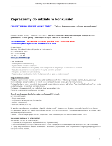 Gminny Ośrodek Kultury i Sportu w Lichnowach Zapraszamy do udziału w konkursie! PIERWSZY GMINNY KONKURS "GMINNY TALENT" - "Tańczę, śpiewam, gram - miejsce na scenie mam" Gminny Ośrodek Kultury i Sportu w Lichnowach, zaprasza uczniów szkół podstawowych (klasy I-VI) oraz gimnazjów z terenu gminy Lichnowy do wzięcia udziału w konkursie !!! Termin konkursu : 23 kwietnia 2016 roku, godzina 10.00 (zmiana terminu) Termin nadsyłania zgłoszeń do 8 kwietnia 2016 roku Organizator: Gminny Ośrodek Kultury i Sportu w Lichnowach Ul. Lachowicza 25 a 82-224 Lichnowy Tel 55 271 26 32 www.gokislichnowy.pl Cele konkursu: - Promocja talentów młodzieży - Wyszukiwanie młodych talentów - Rozbudzanie wrażliwości muzycznej oraz zachęcanie do aktywnego uczestnictwa w kulturze - Wzbudzanie zainteresowania uczniów muzyką, tańcem, śpiewem - Integracja społeczności uczniowskiej - Prezentacja umiejętności wokalnych, tanecznych, w grze na instrumentach Regulamin konkursu: Przegląd organizowany jest dla uczniów szkół podstawowych (klas I-VI) oraz gimnazjów (soliści ,duety, zespoły). Konkurs będzie przeprowadzony w trzech konkurencjach (taniec, śpiew, gra na instrumencie). Podczas konkursu każdy uczestnik, duet, zespół prezentuje dwa utwory lub tańce. Przy dużej ilości zgłoszeń jury może podjąć decyzję o prezentacji jednego utworu. Podczas występu uczestnik nie może być ubrany prowokacyjnie. Prace są opracowane wg własnego pomysłu. Czas trwania prezentacji nie może przekraczać 10 minut. Jury oceniać będzie: - dobór repertuaru, - umiejętności artystyczne wykonawców, - poziom interpretacji, - ogólny wyraz artystyczny. W wyniku pracy i oceny, poszukując ,,zjawisk artystycznych", jury przyzna dyplomy, nagrody i wyróżnienia, łącząc trzy kategorie prezentacji scenicznych (śpiew, taniec, gra na instrumencie). Oddzielnie oceniani będą uczniowie szkół podstawowych i gimnazjów. Laureaci konkursu wystąpią i zostaną nagrodzeni podczas Gminnych Obchodów Dnia Dziecka 2016. WARUNKI UDZIAŁU W KONKURSIE Warunkiem udziału w konkursie jest: 1. Rejestracja polegająca na wypełnieniu Karty Zgłoszeniowej 2. Podanie dokładnych danych teleadresowych, które będą wykorzystywane podczas korespondencji konkursowej, 3. Zgody na publikowanie danych osobowych i wizerunku (w przypadku osób niepełnoletnich zgodę podpisują rodzice lub opiekunowie prawni), 1 Gminny Ośrodek Kultury i Sportu w Lichnowach 4. Zgody rodziców lub prawnych opiekunów na udział oraz zgodę na publikowanie danych osobowych i wizerunku niepełnoletnich uczestników. Występ nie może zawierać treści dyskryminujących lub wulgarnych Sprawy organizacyjne: - Uczestnicy lub delegujące ich placówki pokrywają wszelkie koszty związane z przejazdem i pobytem podczas konkursu. - Kolejność występów ustala organizator. - Występy mogą być nieodpłatnie rejestrowane, nagrywane lub fotografowane bez zgody uczestników konkursu. MIEJSCE KONKURSU: Gminny Ośrodek Kultury i Sportu w Lichnowach Ul Lachowicza 25 a 82-224 Lichnowy Załączniki: PLAKAT 2