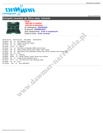 Informacje o produkcie Utworzono 09-03-2017 Komplet nasadek do filtra oleju 14sztuk Cena : 360,66 zł (netto) 443,61 zł (brutto) zi a. p l Nr katalogowy : JAI050004 Producent : JONNESWAY Stan magazynowy : brak w magazynie Średnia ocena : brak recenzji w w w .d aw m ar -n ar ze d Numer klucza Rozmiar (mm) Ilość kątów Zastosowanie HC-65/14 65 14 GM, Daihatsu, Toyota HC-68/14 68 14 Mazda, Ford Escort, Subaru HC-73/14 73 14 Toyota, Lexus HC-74/76 74-76 15 Saturn HC-76/14 76 14 VW, Porsche, Mercedes, BMW, Audi A3, Opel HC-80/15 80 15 Nissan, Honda, Mazda, Isuzu, Subaru, Opel, Toyota HC-93/15 93 15 Opel, Mazda, Volvo, Mitsubishi, Nissan, VW, Porsche, Renault, Ford, Honda, Audi HC-93/36 93 36 Ford HC-65/67 65-67 14 Daihatsu HC-80/82 80-82 15 Mazda, Subaru, Toyota, Honda, Acura, Nissan HC-90/15 90 15 Honda Accord, Mitsubishi, Isuzu HC-75/77 75-77 15 VW, Audi, Ford, Isuzu, Mercedes, Opel HC-76/30 76 30 Ford HC-100/15 100 15 Isuzu, Mitsubishi Wygenerowano w programie www.oscGold.com