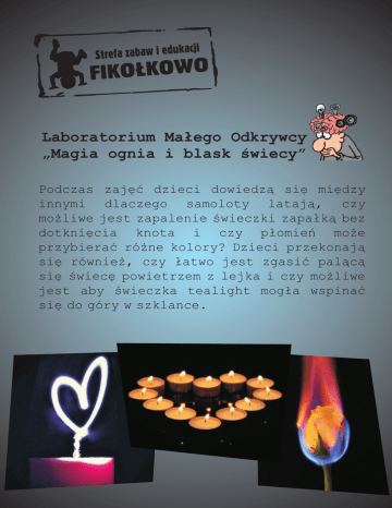 Laboratorium Ma³ego Odkrywcy „Magia ognia i blask œwiecy” Podczas zajêæ dzieci dowiedz¹ siê miêdzy innymi dlaczego samoloty lataj¹, czy mo¿liwe jest zapalenie œwieczki zapa³k¹ bez dotkniêcia knota i czy p³omieñ mo¿e przybieraæ ró¿ne kolory? Dzieci przekonaj¹ siê równie¿, czy ³atwo jest zgasiæ pal¹c¹ siê œwiecê powietrzem z lejka i czy mo¿liwe jest aby œwieczka tealight mog³a wspinaæ siê do góry w szklance.