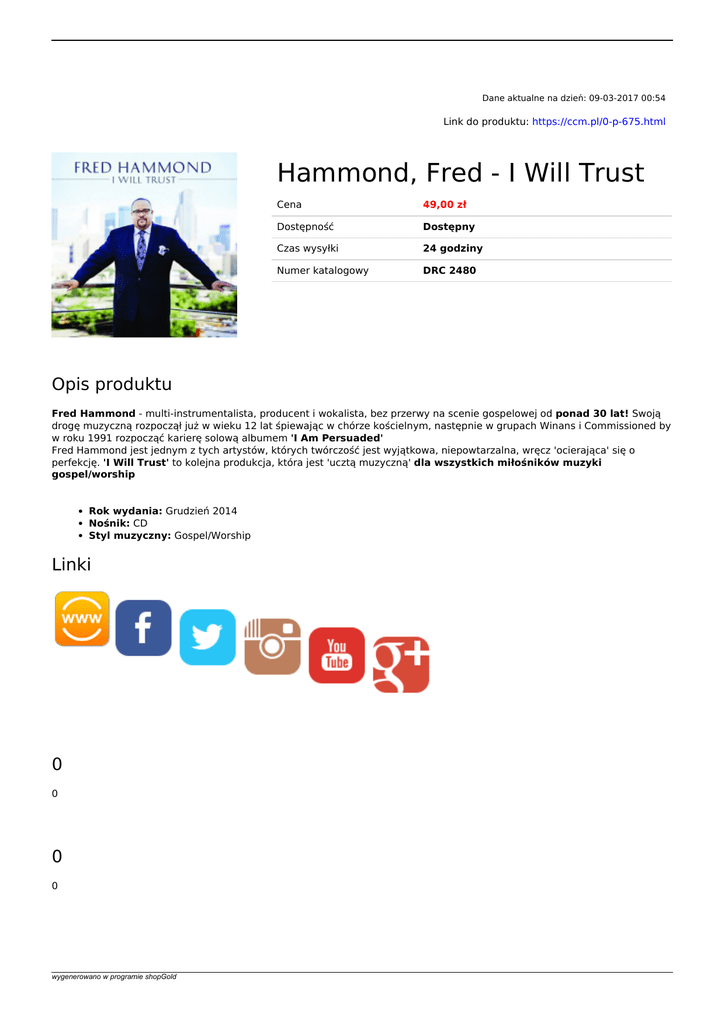 Dane aktualne na dzień: 09-03-2017 00:54 Link do produktu: https://ccm.pl/0-p-675.html Hammond, Fred - I Will Trust Cena 49,00 zł Dostępność Dostępny Czas wysyłki 24 godziny Numer katalogowy DRC 2480 Opis produktu Fred Hammond - multi-instrumentalista, producent i wokalista, bez przerwy na scenie gospelowej od ponad 30 lat! Swoją drogę muzyczną rozpoczął już w wieku 12 lat śpiewając w chórze kościelnym, następnie w grupach Winans i Commissioned by w roku 1991 rozpocząć karierę solową albumem 'I Am Persuaded' Fred Hammond jest jednym z tych artystów, których twórczość jest wyjątkowa, niepowtarzalna, wręcz 'ocierająca' się o perfekcję. 'I Will Trust' to kolejna produkcja, która jest 'ucztą muzyczną' dla wszystkich miłośników muzyki gospel/worship Rok wydania: Grudzień 2014 Nośnik: CD Styl muzyczny: Gospel/Worship Linki 0 0 0 0 wygenerowano w programie shopGold 0 0 wygenerowano w programie shopGold Powered by TCPDF (www.tcpdf.org)