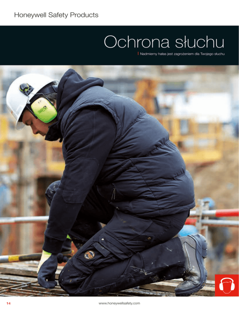 Honeywell Safety Products Ochrona słuchu I Nadmierny hałas jest zagrożeniem dla Twojego słuchu 14 www.honeywellsafety.com Honeywell Safety Products Sposoby ochrony słuchu Nie bądź głuchy! Ubytek słuchu, wywołany hałasem, rzadko pojawia się natychmiastowo. Akumuluje się on raczej w czasie przy każdym narażeniu na niebezpieczny hałas bez stosowania środków ochrony słuchu. Rodzimy się z około 20 000 komórek słuchowych w każdym uchu. Do uszkodzenia tych komórek dochodzi na skutek działania hałasu o natężeniu większym niż 80 decybeli (przez 8 godzin). Taka sytuacja prowadzi stopniowo do głuchoty. Głuchoty niestety nie można wyleczyć, ale można jej całkowicie zapobiec. Firma Howard Leight oferuje szeroką gamę rozwiązań, które kierownictwo odpowiedzialne za BHP może wykorzystać do tworzenia i wdrażania efektywnych oraz właściwych dla swojego obszaru programów ochrony słuchu: innowacyjne produkty, porady, narzędzia edukacyjne i szkoleniowe, a także testowanie dopasowania przeprowadzane w firmie klienta, którego celem jest zapewnienie, aby ochronniki słuchu pasowały do ich użytkownika. Marka Howard Leight jest światowym liderem w produkcji pasywnych i inteligentnych rozwiązań związanych z ochroną słuchu oraz twórcą inicjatywy związanej z tą kwestią – HearForever® . Powiedzmy dość ubytkom słuchu! Wybierz najlepiej dopasowany do siebie sposób ochrony słuchu, który zapewnia wygodę noszenia przez 100% czasu, w trakcie którego jesteś narażony na hałas. Eksperci w zakresie zapobiegania ubytkom słuchu w środowisku roboczym dzięki ponad 30 lat pracy w tej dziedzinie. Pierwsze wkładki do uszu z pianki poliuretanowej oraz wkładki na pałąku zostały opracowane przez firmę Howard Leight ponad 30 lat temu. Dziś firma posiada kilka akredytowanych laboratoriów akustycznych, w których pracują zespoły złożone z międzynarodowych inżynierów oraz specjalistów z zakresu urządzeń wspomagających słuch. Dzięki doświadczeniu, jakie firma Howard Leight zdobyła w zakresie zapobiegania ubytkom słuchu w środowisku roboczym, udało jej się stworzyć technologie, które dały jej miejsce światowego lidera w tej dziedzinie: • Innowacyjne i opatentowane technologie zapewniające ciągłe zwiększanie wygody stosowania i Ochrona słuchu / VeriPRO str. 16 Wkładki do uszu str. 18 ® I Wkładki jednorazowego użytku str. 18 I Wkładki wielokrotnego użytkustr. 21 I Wkładki wykrywalne str. 23 Dozowniki wkładek str. Wkładki na pałąku str. ułatwianie zakładania ochronnika słuchu. -Pianka poliuretanowa: opatentowana technologia (struktura złożona z półotwartych komórek) ułatwia wkładanie wkładki do kanału słuchowego, zapewniając tym samym większą wygodę. - Conforming Material TechnologyTM: ciepło ludzkiego ciała powoduje nagrzewanie się materiału, dzięki czemu staje się on bardziej elastyczny i mniej naciska na kanał słuchowy. 24 • Użytkownik może wybrać najodpowiedniejszy dla 25 Użytkownicy mają możliwość wybrania produktu, siebie ochronnik, dzięki temu, że są one dostępne w różnych kształtach, rozmiarach oraz kolorach. który będzie zapewniał im największą wygodę i będzie wygodny w noszeniu przez 100% czasu, przez Nauszniki blokujące hałas str. 27 Akcesoria str. 38 Parametry tłumienia str. 40 jaki są narażeni na hałas. Oferujemy różne warianty dopasowane do poziomu wygody i/lub zgodności z innymi środkami ochrony osobistej. • Ultrainnowacyjny system komunikacji: - Wewnątrzuszny system komunikacji - Automatyczne testowanie dopasowania - Zintegrowana dozymetria - Aktywna redukcja hałasu. - Poprawiona komunikacja www.honeywellsafety.com 15 Ochrona słuchu Ochrona słuchu Skuteczna ochrona słuchu nie polega tylko na oferowaniu produktu, który zapewnia największy poziom tłumienia hałasu, ale jest związana z zapewnieniem każdemu pracownikowi najlepszej ochrony, z jakiej może korzystać w swoim otoczeniu. Polega ona na zmniejszaniu liczby przypadków ubytków słuchu, powiązanych z hałasem, a tym samym na zwiększaniu bezpieczeństwa. Firma Howard Leight pomaga kierownictwu ds. BHP sprostać wyzwaniom, jakie wynikają z dobrego programu ochrony słuchu: • Redukcja kosztów / zażaleń • Monitorowanie pracowników narażonych na zagrożenie • Wybieranie najodpowiedniejszego(-ych) produktu(-ów) • Zapewnianie każdemu pracownikowi najlepszej ochrony • Odpowiednia równowaga pomiędzy ochroną a komunikacją • Szkolenie Firma Howard Leight zapewnia materiały szkoleniowe jako wsparcie w codziennej pracy na rzecz zapewniania ochrony słuchu. Prosimy zgłosić się do nas po te materiały, dzięki którym będą Państwo mogli zwiększyć świadomość swoich pracowników na temat różnych zagrożeń, jakie są związane z ubytkami słuchu wywoływanymi przez hałas, a także stosowania środków ochrony osobistej obszarach, w których występuje hałas. Inicjatywa firmy Howard Leight ® | hearforever.org 35 M UN IK O KO EB A RZ 17 17 15 15 15 15 15 2 12 12 1 12 12 POT 32 19 19 17 23 19 MIAR ROZ T ŁU M IEN I SU 16 16 18 22 19 18 19 16 16 1 19 6 14 15 1 16 5 15 12 12 12 12 12 14 24 27 26 25 DOC2659 DOC2647 Instrukcja zakładania nauszników Instrukcja zakładania zatyczek do uszu Sposób skutecznej ochrony słuchu przy pomocy zatyczek do uszu Sposób skutecznej ochrony słuchu przy pomocy nauszników Noszenie • Należy zapoznać się i postępować zgodnie z instrukcją zakładania nauszników • Usunąć wszystkie włosy spod poduszek nauszników Wybór • Unikać nadmiernej ochrony w otoczeniu o minimalnym natężeniu hałasu — dobierając najlepsze nauszniki do danej sytuacji należy uwzględnić poziom hałasu i potrzebę komunikacji ze współpracownikami lub słyszenia sygnałów ostrzegawczych podczas wykonywania pracy Nauszniki standardowe z opaską na głowę Stosowanie • Regularnie sprawdzać, czy na nausznikach i poduszkach nie 