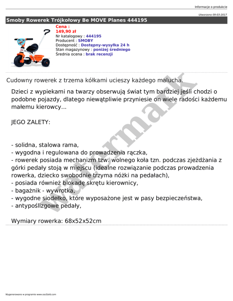 Informacje o produkcie Utworzono 09-03-2017 Smoby Rowerek Trójkołowy Be MOVE Planes 444195 Cena : 149,90 zł Nr katalogowy : 444195 Producent : SMOBY Dostępność : Dostępny-wysyłka 24 h Stan magazynowy : poniżej średniego Średnia ocena : brak recenzji er m ar k Cudowny rowerek z trzema kółkami ucieszy każdego malucha. Dzieci z wypiekami na twarzy obserwują świat tym bardziej jeśli chodzi o podobne pojazdy, dlatego niewątpliwie przyniesie on wiele radości każdemu małemu kierowcy... JEGO ZALETY: w at - solidna, stalowa rama, - wygodna i regulowana do prowadzenia rączka, - rowerek posiada mechanizm tzw. wolnego koła tzn. podczas zjeżdżania z górki pedały stoją w miejscu (idealne rozwiązanie podczas prowadzenia rowerka, dziecko swobodnie trzyma nóżki na pedałach), - posiada również blokadę skrętu kierownicy, - bagażnik - wywrotka, - wygodne siodełko, które wyposażone jest w pasy bezpieczeństwa, - antypoślizgowe pedały, Wymiary rowerka: 68x52x52cm Wygenerowano w programie www.oscGold.com