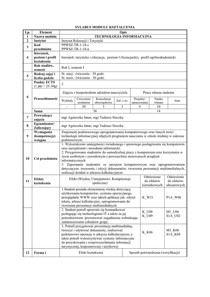 Lp. 1 2 3 4 5 Element Nazwa modułu Instytut Kod przedmiotu Kierunek, poziom i profil kształcenia Rok studiów, semestr Rodzaj zajęć i liczba godzin Punkty ECTS (1 pkt = 25-30g) SYLABUS MODUŁU KSZTAŁCENIA Opis TECHNOLOGIA INFORMACYJNA Instytut Rekreacji i Turystyki PPWSZ-TR-1-18-s PPWSZ-TR-1-18-n kierunek: turystyka i rekreacja, poziom I (licencjacki), profil ogólnoakademicki Rok I, semestr I St. stacj.: ćwiczenia - 30 godz. St. niest.: ćwiczenia - 30 godz. 2 Zajęcia z bezpośrednim udziałem nauczyciela 6 7 8 9 Pracochłonność Suma Prowadzący zajęcia Egzaminator/ Zaliczający Wymagania (kompetencje) wstępne 10 Cel przedmiotu 11 Efekty kształcenia 12 Forma i Wykłady Ćwiczenia/ seminaria - 30 Praca własna studenta Konsultacje obowiązkowe Zal. z oc. Projekty/ opracowania Nauka własna 3 3 4 10 14 36 Inne mgr Agnieszka Janas, mgr Tadeusz Sieczka mgr Agnieszka Janas, mgr Tadeusz Sieczka Znajomość podstawowego oprogramowania komputerowego oraz innych treści technologii informacyjnej objętych programem nauczania w szkole średniej w zakresie podstawowym. 1. Wykształcenie umiejętności świadomego i sprawnego posługiwania się komputerem oraz narzędziami i metodami informatyki. 2. Przygotowanie studentów do samodzielnej pracy z komputerem oraz korzystania w życiu osobistym i zawodowym z powszechnie stosowanych urządzeń informatycznych. 3. Zapoznanie studentów ze sprzętem komputerowym oraz oprogramowaniem dotyczącym: tworzenia i edycji dokumentów, tworzenia prezentacji multimedialnych, realizacji działań w arkuszu kalkulacyjnym. Odniesienie Odniesienie Efekt (Wiedza, Umiejętności, Kompetencje do efektów do efektów społeczne) kierunkowych obszarowych 1.Student posiada elementarną wiedzę dotyczącą użytkowania komputerów, systemu operacyjnego, przeglądarki WWW oraz takich aplikacji jak: edytor K_W21 P1A_W06 tekstu, arkusz kalkulacyjny, oprogramowanie do tworzenia prezentacji multimedialnych. 2. Student potrafi sprawnie się komunikować K_U08 M1_U06 posługując się technologiami IT a także za jej K_U09 S1A_U02 pośrednictwem prezentować zagadnienia wzbudzając zainteresowanie członków grupy. 3. Potrafi przygotować prezentację multimedialną, tworzyć i edytować dokumenty, realizować M1_K06 K_K06 podstawowe operacje w arkuszu kalkulacyjnym, a S1A_K04 także potrafi wykorzystywać systemy informacyjne do pozyskiwania i rozpowszechniania informacji turystycznej, krajoznawczej i użytkowej Efekt kształcenia Sposób potwierdzenia (weryfikacji) 2 warunki potwierdzenia efektu kształcenia 13 Treści merytoryczne przedmiotu 14 Wykaz literatury podstawowej 15 Wykaz literatury uzupełniającej (pomocniczej) 1.Student posiada elementarną wiedzę dotyczącą użytkowania komputerów, systemu operacyjnego, przeglądarki WWW oraz takich aplikacji jak: edytor tekstu, arkusz kalkulacyjny, oprogramowanie do tworzenia prezentacji multimedialnych. 2. Student potrafi sprawnie się komunikować posługując się technologiami IT a także za jej pośrednictwem prezentować zagadnienia wzbudzając zainteresowanie członków grupy. 3. Potrafi przygotować prezentację multimedialną, tworzyć i edytować dokumenty, realizować podstawowe operacje w arkuszu kalkulacyjnym, a także potrafi wykorzystywać systemy informacyjne do pozyskiwania i rozpowszechniania informacji turystycznej, krajoznawczej i użytkowej Analiza wypowiedzi i postępów pracy studentów w trakcie ćwiczeń. Ocena i analiza zaprezentowanej na dany temat prezentacji multimedialnej. Sprawdzian ze znajomości pracy w edytorze tekstu oraz arkuszu kalkulacyjnym. Ocena i analiza przygotowanej i zaprezentowanej na dany temat prezentacji multimedialnej. Ocena i analiza rezultatów przeszukiwania stron WWW w celu znalezienia konkretnej informacji związanej z turystyką. 1. Wprowadzenie do zagadnień technologii informacyjnej. Podstawy budowy i działania komputerów. 2. Obsługa komputera w środowisku Windows. Tworzenie prezentacji multimedialnych 3. Wprowadzenie do edytora tekstu MS Word. Podstawowe operacje: formatowanie tekstu, obramowanie i cieniowanie, wstawianie elementów graficznych i ich formatowanie itd. 4. MS Word: Tworzenie korespondencji seryjnej. Tworzenie hiperłącz, przypisów oraz spisu treści. Układ kolumnowy. 5. Sprawdzian ze znajomości Word. Wprowadzenie do Arkusza kalkulacyjnego Excel. 6. MS Excel: Wpisywanie danych do Arkusza kalkulacyjnego i ich formatowanie. 7. Podstawowe funkcje Arkusza kalkulacyjnego. Excel: Tabele przestawne. Autofiltrowanie danych. Tworzenie wykresów. 8. Sprawdzian ze znajomości programu MS Excel. Wprowadzenie do baz danych. 9. Edytor tekstu: formatowanie tekstu, obramowanie i cieniowanie, wstawianie elementów graficznych i ich formatowanie. Korespondencja seryjna. Tworzenie hiperłączy, przypisów oraz spisu treści. Układ kolumnowy. 10. Arkusz kalkulacyjny: wpisywanie danych do arkusza i ich formatowanie, Formuły i funkcje. Sortowanie i filtrowanie danych w arkuszu, tabele przestawne. Tworzenie wykresów. Możliwości łączenia arkusza z grafiką. 11. Zastosowanie informatyki w turystyce. Wyszukiwanie informacji w Internecie. 12. Nowe technologie w turystyce 1. Gaworska B., Szantula H., Podstawy technik informatycznych, Wydawnictwo KISS, Warszawa, 2007. 2. Wróblewski P., ABC komputera. Wyd. 6., Helion, Gliwice, 2007. 3. Bylina J., Bylina B., Mycka J., Podstawy technologii informacyjnej i informatyki w przykładach i zadaniach,, Wydawnictwo UMCS, Lublin, 2007. 1. 2. Nowakowski Z., Użytkowanie komputerów. MIKOM, Kielce, 2006. Lenert R., Arkusze kalkulacyjne, Wydawnictwo KISS, Warszawa, 2007.