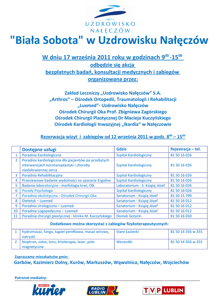 "Biała Sobota" w Uzdrowisku Nałęczów W dniu 17 września 2011 roku w godzinach 900 -1500 odbędzie się akcja bezpłatnych badań, konsultacji medycznych i zabiegów organizowana przez: Zakład Leczniczy „Uzdrowisko Nałęczów” S.A. „Arthros” – Ośrodek Ortopedii, Traumatologii i Rehabilitacji „Luxmed”- Uzdrowisko Nałęczów Ośrodek Chirurgii Oka Prof. Zbigniewa Zagórskiego Ośrodek Chirurgii Plastycznej Dr Macieja Kuczyńskiego Ośrodek Kardiologii Inwazyjnej „Ikardia” w Nałęczowie Rezerwacja wizyt i zabiegów od 12 września 2011 w godz. 800 – 1500 1 2 3 4 5 6 7 8 9 10 11 Dostępne usługi Gdzie Rejestracja – tel. Poradnia Kardiologiczna Poradnia kardiologiczna dla pacjentów po przebytych interwencjach koronaroplastyki i choroby niedokrwiennej serca Poradnia Rehabilitacyjna Przesiewowe badanie wydolności na aparacie Ergoline Badanie laboratoryjne : morfologia krwi, OB. Porady Psychologa Poradnia okulistyczna - Ośrodek Chirurgii Oka Dietetyk – Luxmed Poradnia Urologiczna – Luxmed Poradnia Logopedyczna – Luxmed Poradnia chirurgii plastycznej - klinika M. Kuczyńskiego Szpital Kardiologiczny 81 50 16 026 Szpital Kardiologiczny 81 50 16 026 Szpital Kardiologiczny Szpital Kardiologiczny Laboratorium - S. Książę Józef Szpital Kardiologiczny Sanatorium - Książę Józef Sanatorium - Książę Józef Sanatorium - Książę Józef Sanatorium - Książę Józef Domek Gotycki 81 50 16 026 81 50 16 026 81 50 16 026 81 50 16 026 81 50 15 799 81 50 16 012 81 50 16 012 81 50 16 012 81 50 16 650 Dodatkowo można skorzystać z zabiegów fizykoterapeutycznych: 1 2 hydromasaż, fango, kąpiel perełkowa, masaż wirowy, natryski bioptron, solux, tens, krioterapia, laser, pole magnetyczne Stare Łazienki 81 50 14 356 w.355 Werandki 81 50 14 356 w.355 Zapraszamy mieszkańców gmin: Garbów, Kazimierz Dolny, Kurów, Markuszów, Wąwolnica, Nałęczów, Wojciechów Patronat medialny: