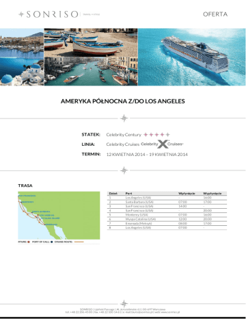 OFERTA AMERYKA PÓŁNOCNA Z/DO LOS ANGELES STATEK: Celebrity Century LINIA: Celebrity Cruises TERMIN: 12 KWIETNIA 2014 – 19 KWIETNIA 2014 TRASA Dzień 1 2 3 4 5 6 7 8 Port Los Angeles (USA) Santa Barbara (USA) San Francisco (USA) San Francisco (USA) Monterey (USA) Wyspa Catalina (USA) Ensenada (Meksyk) Los Angeles (USA) Wpłynięcie 07:00 14:00 07:00 12:00 08:00 07:00 SONRISO | Lipiński Passage | Al. Jero zo limskie 61 | 00-697 Warszawa tel. +48 22 206 45 00 | fax. +48 22 100 14 61 | e-mail: biuro @so nriso .pl | web: www.so nriso .pl Wypłynięcie 16:00 17:00 20:00 16:00 20:00 17:00 - OFERTA CENA Typ kabiny Kabina wewnętrzna Cena z osobę od 949 EUR Kabina z oknem od 1 079 EUR Kabina z balkonem od 1 655 EUR Concierge Class od 1 750 EUR Century Suite od 2 300 EUR CENA ZAWIERA DOTATKOWE OPŁATY zakwaterowanie w 2 - os. kabinie wybranej kategorii pełne wyżywienie: 3 posiłki, przekąski między posiłakmi, bufet o północy napoje do posiłków: woda stołowa, kawa, herbata oraz sok do śniadania serwis bagażowy podczas wejścia i zejścia ze statku 24 godzinny serwis kabinowy korzystanie z urządzeń sportowo - rekreacyjnych dostępnych na pokładzie (baseny, jacuzzi, boiska sportowe, kluby dla dzieci i młodzieży itp.) udział we wszystkich imprezach organizowanych na pokładzie (przedstawienia, pokazy, aukcje, animacje i inne) obowiązkowe opłaty portowe obowiązkową opłatę serwisową (napiwki) dla obsługi statku dojazd/przelot do portu rozpoczęcia i zakończenia rejsu transfery (lotnisko - port - lotnisko) ewentualne noclegi przed lub po rejsie wycieczki fakultatywne napoje: bezalkoholowe, alkoholowe, woda mineralna dostępne w restauracjach i barach (istnieje możliwość wykupienia pakietów napojów, o szczegóły zapytaj w biurze) korzystanie z mini baru w kabinie korzystanie z usług typu: SPA, salon piękności, pralnia itp. wydatki osobiste tj. zakupy w butikach, internet, kasyno itp. obowiązkowe ubezpieczenie turystyczne koszt wymaganych wiz ewentualna opłata paliwowa (linia w momencie wzrotu cen ropy zastrzega sobie prawo do dodania oplaty paliwowej do każdej rezerwacji) Na życzenie świadczymy dodatkowo usługi: rezerwacje hotelowe na całym świecie, rezerwacje biletów lotniczych, trasferów oraz parkingu w porcie, rezerwacje wycieczek fakultatywnych i innych atrakcji SONRISO | Lipiński Passage | Al. Jero zo limskie 61 | 00-697 Warszawa tel. +48 22 206 45 00 | fax. +48 22 100 14 61 | e-mail: biuro @so nriso .pl | web: www.so nriso .pl