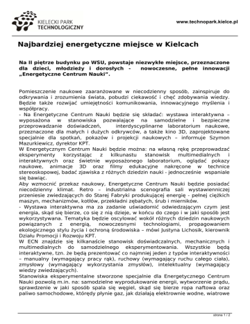 www.technopark.kielce.pl Najbardziej energetyczne miejsce w Kielcach Na II piętrze budynku po WSU, powstaje niezwykłe miejsce, przeznaczone dla dzieci, młodzieży i dorosłych nowoczesne, pełne innowacji „Energetyczne Centrum Nauki”. Pomieszczenie naukowe zaaranżowane w niecodzienny sposób, zainspiruje do odkrywania i zrozumienia świata, pobudzi ciekawość i chęć zdobywania wiedzy. Będzie także rozwijać umiejętności komunikowania, innowacyjnego myślenia i współpracy. - Na Energetyczne Centrum Nauki będzie się składać: wystawa interaktywna – wyposażona w stanowiska pozwalające na samodzielne i bezpieczne przeprowadzanie doświadczeń, interdyscyplinarne laboratorium naukowe, przeznaczone dla małych i dużych odkrywców, a także kino 3D, zaprojektowane specjalnie dla spotkań, pokazów i projekcji naukowych – informuje Szymon Mazurkiewicz, dyrektor KPT. W Energetycznym Centrum Nauki będzie można: na własną rękę przeprowadzać eksperymenty korzystając z kilkunastu stanowisk multimedialnych i interaktywnych oraz świetnie wyposażonego laboratorium, oglądać pokazy naukowe, animacje 3D oraz filmy edukacyjne nakręcone w technice stereoskopowej, badać zjawiska z różnych dziedzin nauki - jednocześnie wspaniale się bawiąc. Aby wzmocnić przekaz naukowy, Energetyczne Centrum Nauki będzie posiadać niecodzienny klimat. Retro – industrialna scenografia sali wystawienniczej przeniesie zwiedzających do Starej Fabryki produkującej energię - pełnej ciężkich maszyn, mechanizmów, kotłów, przekładni zębatych, śrub i mierników. - Wystawa interaktywna ma za zadanie uświadomić odwiedzającym czym jest energia, skąd się bierze, co się z nią dzieje, w końcu do czego i w jaki sposób jest wykorzystywana. Tematyka będzie oscylować wokół różnych dziedzin naukowych powiązanych z energią, nowoczesnymi technologiami, propagowaniem ekologicznego stylu życia i ochroną środowiska – mówi Justyna Lichosik, kierownik Działu Promocji i Rozwoju KPT. W ECN znajdzie się kilkanaście stanowisk doświadczalnych, mechanicznych i multimedialnych do samodzielnego eksperymentowania. Wszystkie będą interaktywne, tzn. że będą prezentować co najmniej jeden z typów interaktywności – manualny (wymagający pracy rąk), ruchowy (wymagający ruchu całego ciała), zmysłowy (wymagający wykorzystania zmysłów), intelektualny (wymagający wiedzy zwiedzających). Stanowiska eksperymentalne stworzone specjalnie dla Energetycznego Centrum Nauki pozwolą m.in. na: samodzielne wyprodukowanie energii, wytworzenie prądu, sprawdzenie w jaki sposób spala się węgiel, skąd się bierze ropa naftowa oraz paliwo samochodowe, którędy płynie gaz, jak działają elektrownie wodne, wiatrowe strona 1 / 2 www.technopark.kielce.pl i wiele, wiele innych. ECN będzie łączyć w jedno różne formy sztuki – kino, teatr, instalacje artystyczne i co najlepsze, pomimo typowo naukowego charakteru - stanie się także miejscem spotkań kulturalnych. Energetyczne Centrum Nauki, to nie tylko wystawa interaktywna, laboratorium i kino. To przede wszystkim bogata oferta zajęć i spotkań dla szerokiego grona odbiorców. Zdjęcie dzięki uprzejmości Centrum Nauki Eksperyment z Gdyni. strona 2 / 2 Powered by TCPDF (www.tcpdf.org)