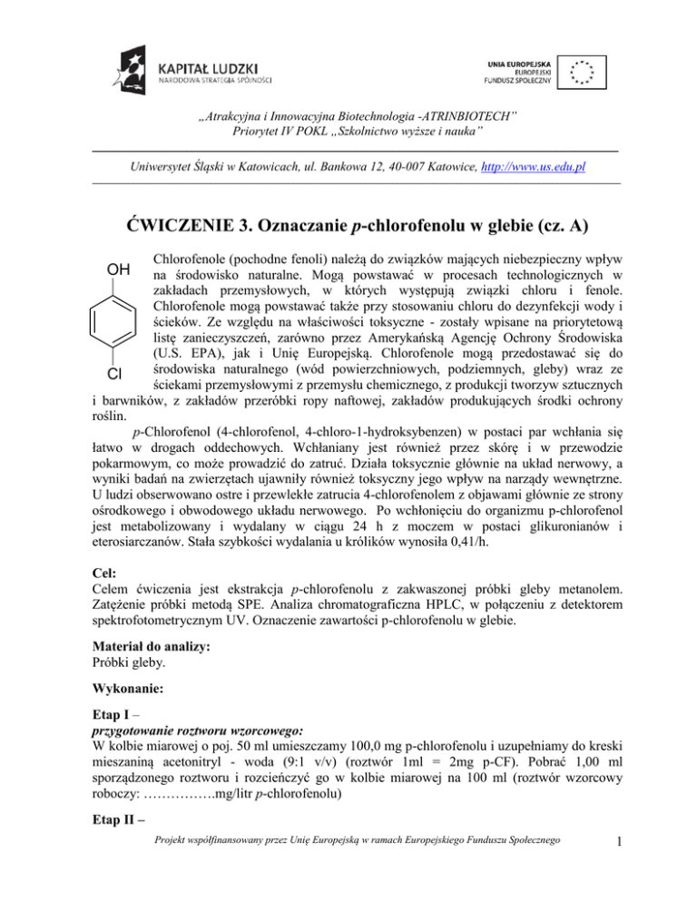 „Atrakcyjna i Innowacyjna Biotechnologia -ATRINBIOTECH” Priorytet IV POKL „Szkolnictwo wyższe i nauka” ____________________________________________________________________________________ Uniwersytet Śląski w Katowicach, ul. Bankowa 12, 40-007 Katowice, http://www.us.edu.pl ____________________________________________________________________________________________________________________ ĆWICZENIE 3. Oznaczanie p-chlorofenolu w glebie (cz. A) Chlorofenole (pochodne fenoli) należą do związków mających niebezpieczny wpływ na środowisko naturalne. Mogą powstawać w procesach technologicznych w zakładach przemysłowych, w których występują związki chloru i fenole. Chlorofenole mogą powstawać także przy stosowaniu chloru do dezynfekcji wody i ścieków. Ze względu na właściwości toksyczne - zostały wpisane na priorytetową listę zanieczyszczeń, zarówno przez Amerykańską Agencję Ochrony Środowiska (U.S. EPA), jak i Unię Europejską. Chlorofenole mogą przedostawać się do środowiska naturalnego (wód powierzchniowych, podziemnych, gleby) wraz ze Cl ściekami przemysłowymi z przemysłu chemicznego, z produkcji tworzyw sztucznych i barwników, z zakładów przeróbki ropy naftowej, zakładów produkujących środki ochrony roślin. p-Chlorofenol (4-chlorofenol, 4-chloro-1-hydroksybenzen) w postaci par wchłania się łatwo w drogach oddechowych. Wchłaniany jest również przez skórę i w przewodzie pokarmowym, co może prowadzić do zatruć. Działa toksycznie głównie na układ nerwowy, a wyniki badań na zwierzętach ujawniły również toksyczny jego wpływ na narządy wewnętrzne. U ludzi obserwowano ostre i przewlekłe zatrucia 4-chlorofenolem z objawami głównie ze strony ośrodkowego i obwodowego układu nerwowego. Po wchłonięciu do organizmu p-chlorofenol jest metabolizowany i wydalany w ciągu 24 h z moczem w postaci glikuronianów i eterosiarczanów. Stała szybkości wydalania u królików wynosiła 0,41/h. OH Cel: Celem ćwiczenia jest ekstrakcja p-chlorofenolu z zakwaszonej próbki gleby metanolem. Zatężenie próbki metodą SPE. Analiza chromatograficzna HPLC, w połączeniu z detektorem spektrofotometrycznym UV. Oznaczenie zawartości p-chlorofenolu w glebie. Materiał do analizy: Próbki gleby. Wykonanie: Etap I – przygotowanie roztworu wzorcowego: W kolbie miarowej o poj. 50 ml umieszczamy 100,0 mg p-chlorofenolu i uzupełniamy do kreski mieszaniną acetonitryl - woda (9:1 v/v) (roztwór 1ml = 2mg p-CF). Pobrać 1,00 ml sporządzonego roztworu i rozcieńczyć go w kolbie miarowej na 100 ml (roztwór wzorcowy roboczy: …………….mg/litr p-chlorofenolu) Etap II – Projekt współfinansowany przez Unię Europejską w ramach Europejskiego Funduszu Społecznego 1 „Atrakcyjna i Innowacyjna Biotechnologia -ATRINBIOTECH” Priorytet IV POKL „Szkolnictwo wyższe i nauka” ____________________________________________________________________________________ Uniwersytet Śląski w Katowicach, ul. Bankowa 12, 40-007 Katowice, http://www.us.edu.pl ____________________________________________________________________________________________________________________ przygotowanie próbki: do plastikowej próbówki wirówkowej o poj. 50ml dodać: - 10 g gleby (odważonej 0,05g) - 2-3 krople 10% roztworu kwasu solnego - 30 ml metanolu (czystość do HPLC), Zamknąć probówkę i wytrząsać ręcznie przez około 10 min. Następnie umieścić probówkę w wirówce i przy prędkości 3-4 tyś. obr/min wirować przez 10 min. Odwirowany ekstrakt przenieść (uważając aby nie dostał się osad, lub przelewać przez lejek z sączkiem) do zlewki na 50 ml i dodać 15 ml wody (czystość do HPLC). Powtórzyć to samo sporządzając próbkę z wzorcem wewnętrznym dodając na etapie dodawania kwasu solnego, 2 ml wzorca (roztwór wzorcowy roboczy). kondycjonowanie kolumienki (kolumienka C-18/3 ml/500 mg): po zamocowaniu kolumienki w aparacie do sączenia próżniowego, przemyć kolumienkę 3 ml metanolu (czystość do HPLC), następnie 3 ml mieszaniny woda - metanol (15:30 v/v); rozdział: powoli przepuścić 1/3 całości otrzymanego roztworu badanej próbki przez kolumienkę, regulując przepływ próżnią; przemycie kolumienki: przemyć 1 ml mieszaniną woda – metanol (9:1 v/v), suszyć 5 min pod próżnią; Ważne: Należy pamiętać, iż od chwili rozpoczęcia etapu kondycjonowania złoża sorbentu nie można dopuścić do jego wyschnięcia. W przeciwnym przypadku procedurę należy rozpocząć od nowa. Przed ostatnim etapem elucji analitów ze złoża należy upewnić się, czy jest ono suche, jeśli nie - wysuszyć. elucja: przemyć 4x1 ml mieszaniną acetonitryl - woda (9:1 v/v), przesącz zbierać do małego naczynka (probówki na 5ml). Pobrać 1,5 ml próbki do naczynka chromatograficznego, szczelnie zamknąć, opisać próbkę i pozostawić w chłodnym miejscu (np. lodówce) do następnych ćwiczeń. Projekt współfinansowany przez Unię Europejską w ramach Europejskiego Funduszu Społecznego 2 „Atrakcyjna i Innowacyjna Biotechnologia -ATRINBIOTECH” Priorytet IV POKL „Szkolnictwo wyższe i nauka” ____________________________________________________________________________________ Uniwersytet Śląski w Katowicach, ul. Bankowa 12, 40-007 Katowice, http://www.us.edu.pl ____________________________________________________________________________________________________________________ ĆWICZENIE 3. Oznaczanie p-chlorofenolu w glebie (cz. B) Materiał do analizy: zatężony ekstrakt uzyskany z części A. Wykonanie: Warunki rozdzielania, detekcji i kalibracji HPLC Ustawić skład eluent: acetonitryl:metanol:1% kwas octowy (35:5:60%), natężenie przepływu fazy ruchomej -1ml/min. Ustabilizować warunki rozdzielania (stabilna linia podstawowa detektora UV-VIS długość fali 280 nm, powierzchnia sorpcyjna kolumny „zrównoważona” ze stosowanym eluentem). Po ustabilizowaniu warunków rozdzielania wprowadzić do pętli zaw