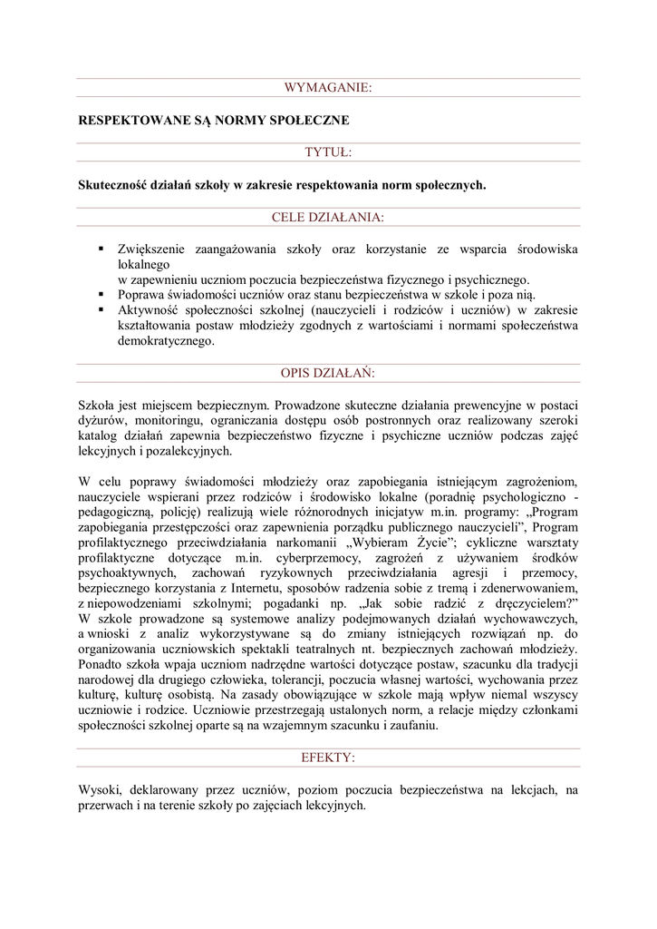 WYMAGANIE: RESPEKTOWANE SĄ NORMY SPOŁECZNE TYTUŁ: Skuteczność działań szkoły w zakresie respektowania norm społecznych. CELE DZIAŁANIA: Zwiększenie zaangażowania szkoły oraz korzystanie ze wsparcia środowiska lokalnego w zapewnieniu uczniom poczucia bezpieczeństwa fizycznego i psychicznego. Poprawa świadomości uczniów oraz stanu bezpieczeństwa w szkole i poza nią. Aktywność społeczności szkolnej (nauczycieli i rodziców i uczniów) w zakresie kształtowania postaw młodzieży zgodnych z wartościami i normami społeczeństwa demokratycznego. OPIS DZIAŁAŃ: Szkoła jest miejscem bezpiecznym. Prowadzone skuteczne działania prewencyjne w postaci dyżurów, monitoringu, ograniczania dostępu osób postronnych oraz realizowany szeroki katalog działań zapewnia bezpieczeństwo fizyczne i psychiczne uczniów podczas zajęć lekcyjnych i pozalekcyjnych. W celu poprawy świadomości młodzieży oraz zapobiegania istniejącym zagrożeniom, nauczyciele wspierani przez rodziców i środowisko lokalne (poradnię psychologiczno pedagogiczną, policję) realizują wiele różnorodnych inicjatyw m.in. programy: „Program zapobiegania przestępczości oraz zapewnienia porządku publicznego nauczycieli”, Program profilaktycznego przeciwdziałania narkomanii „Wybieram Życie”; cykliczne warsztaty profilaktyczne dotyczące m.in. cyberprzemocy, zagrożeń z używaniem środków psychoaktywnych, zachowań ryzykownych przeciwdziałania agresji i przemocy, bezpiecznego korzystania z Internetu, sposobów radzenia sobie z tremą i zdenerwowaniem, z niepowodzeniami szkolnymi; pogadanki np. „Jak sobie radzić z dręczycielem?” W szkole prowadzone są systemowe analizy podejmowanych działań wychowawczych, a wnioski z analiz wykorzystywane są do zmiany istniejących rozwiązań np. do organizowania uczniowskich spektakli teatralnych nt. bezpiecznych zachowań młodzieży. Ponadto szkoła wpaja uczniom nadrzędne wartości dotyczące postaw, szacunku dla tradycji narodowej dla drugiego człowieka, tolerancji, poczucia własnej wartości, wychowania przez kulturę, kulturę osobistą. Na zasady obowiązujące w szkole mają wpływ niemal wszyscy uczniowie i rodzice. Uczniowie przestrzegają ustalonych norm, a relacje między członkami społeczności szkolnej oparte są na wzajemnym szacunku i zaufaniu. EFEKTY: Wysoki, deklarowany przez uczniów, poziom poczucia bezpieczeństwa na lekcjach, na przerwach i na terenie szkoły po zajęciach lekcyjnych. Uczniowie nie sygnalizują występowania przypadków przemocy słownej, pozasłownej ani fizycznej (tj. zdarzeń dotyczących: umyślnego zniszczenia rzeczy stanowiącej ich własność, kradzieży, zmuszania do kupowania czegoś za własne pieniądze, obrażania, w tym za pomocą Internetu lub telefonów komórkowych, wykluczania z grupy, pobicia, uczestnictwa w bójce z innymi uczniami). Ochrona uczniów przed niebezpieczeństwami współczesnego świata. RADY I PRZESTROGI: Bezpieczeństwo młodego człowieka jako wolność od wszelkich zagrożeń, jest najcenniejszą wartością, której szkoła winna ustawicznie poszukiwać i o którą zabiegać. Podejmowane działania muszą być zawsze na wysokim poziomie organizacyjnym i merytorycznym, w miarę potrzeb należy je uatrakcyjniać lub modyfikować ich formę. Ważny jest ich twórczy charakter będący efektem wszystkich członków społeczności szkolnej, przy wsparciu instytucji funkcjonujących w środowisku lokalnym. SPOSOBY UPOWSZECHNIANIA: Lokalna prasa i media. Gazetka szkolna. Strona internetowa szkoły. Tablica informacyjna dla rodziców. Prezentacja osiągnięć w szkołach na terenie miasta, na konferencjach dla nauczycieli. Forum Nauczycielskie - miesięcznik wydawany przez Wojewódzki Ośrodek Doskonalenia Nauczycieli w Piotrkowie Trybunalski.