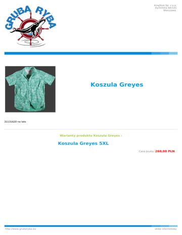 KingSize Sp. z o.o. Dymińska 6A/101 Warszawa Koszula Greyes 31131620 na lato Warianty produktu Koszula Greyes : Koszula Greyes 5XL Cena brutto: http://www.grubaryba.eu 260,00 PLN sklep internetowy